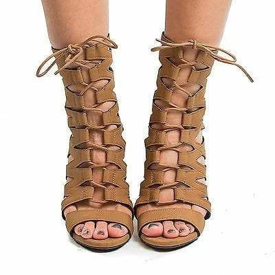 Walk in comfort and style with these strappy, gladiator inspired stiletto heels, featuring an open toe, contrast stitching, a gladiator strappy cut out look, a back center zipper for easy wear and closure, adjustable corset like laces, a slightly padded insole for comfort, an approximate 0.75 inch platform, and an approximate 4.5 inch high stiletto heel. (Please note that these measurements are based on a size 7). Style fits true to size. Available in Black, Tan, etc. All man made materials. By Delicious Shoes.