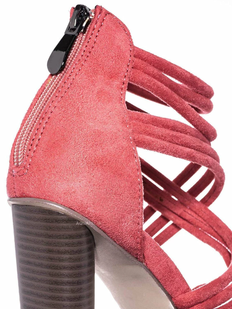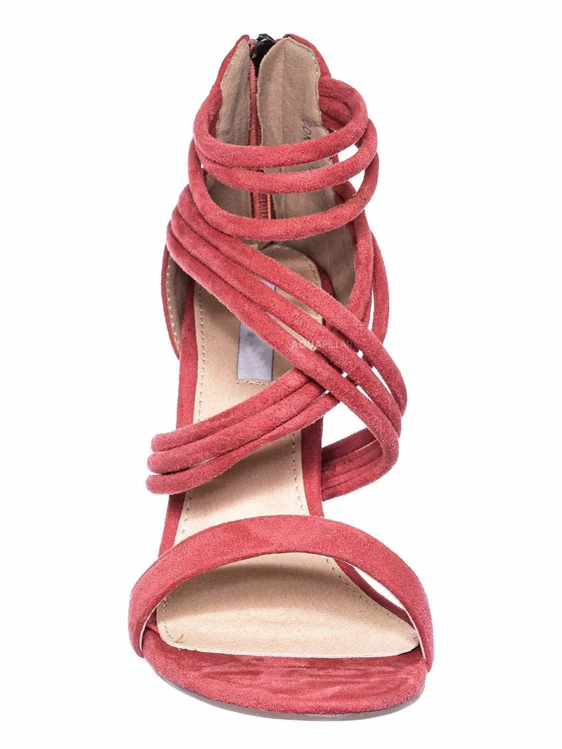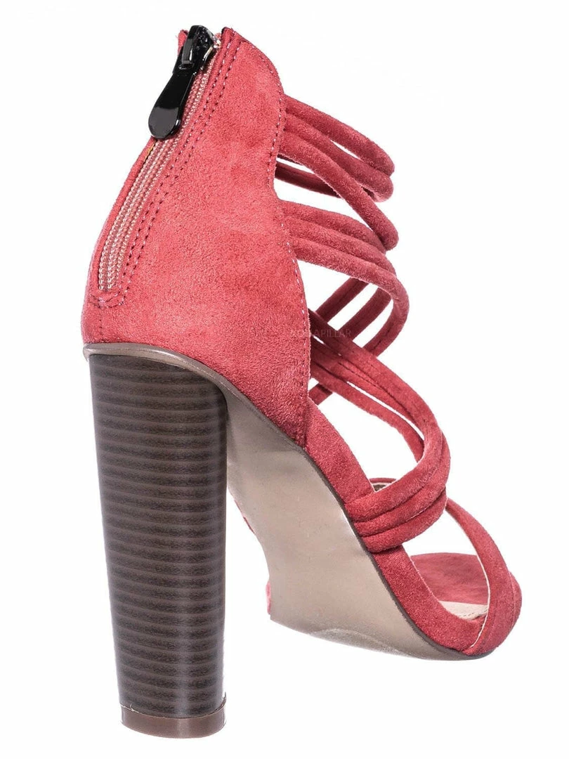 Product Detail : These dress sandals features a triple cross strap, open toe silhouette, back closed zip closure, chunky oval block heel with imitation wooden stack texture and lightly padded insole.