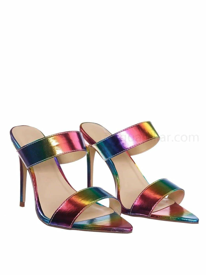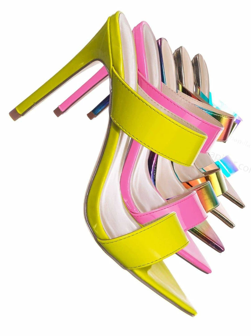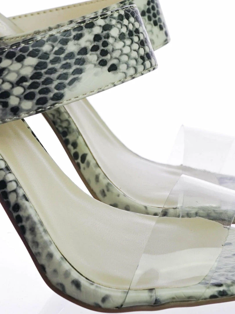Product Detail : These sandals features a double strap slide in construction, pointed toe, thin high heel, clear / transparent / Lucite strap and lightly padded insole. Choose from solid color and snake embossed prints.