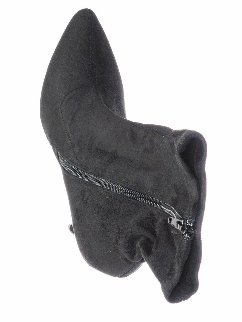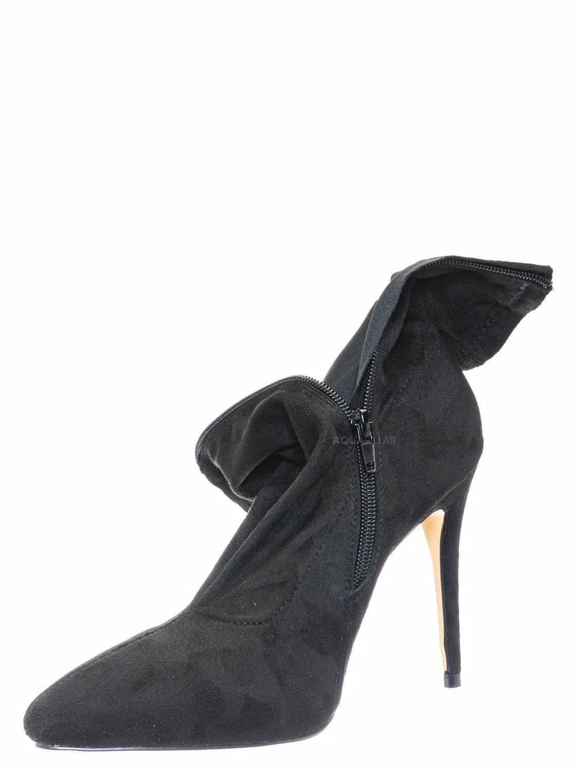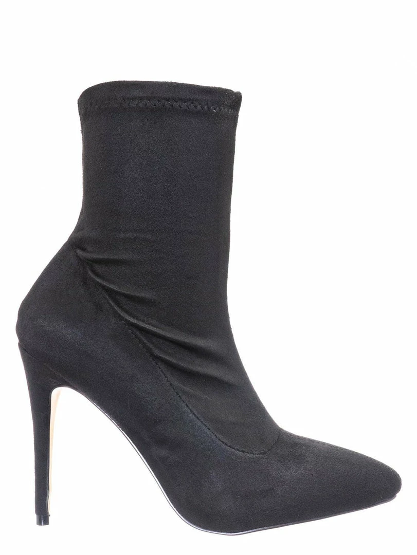 Product Detail : These dressy boots features an ankle height stretched shaft, shape hugging stretch silhouette, pointed closed toe, high heel stiletto, zip closure and lightly padded insole.
