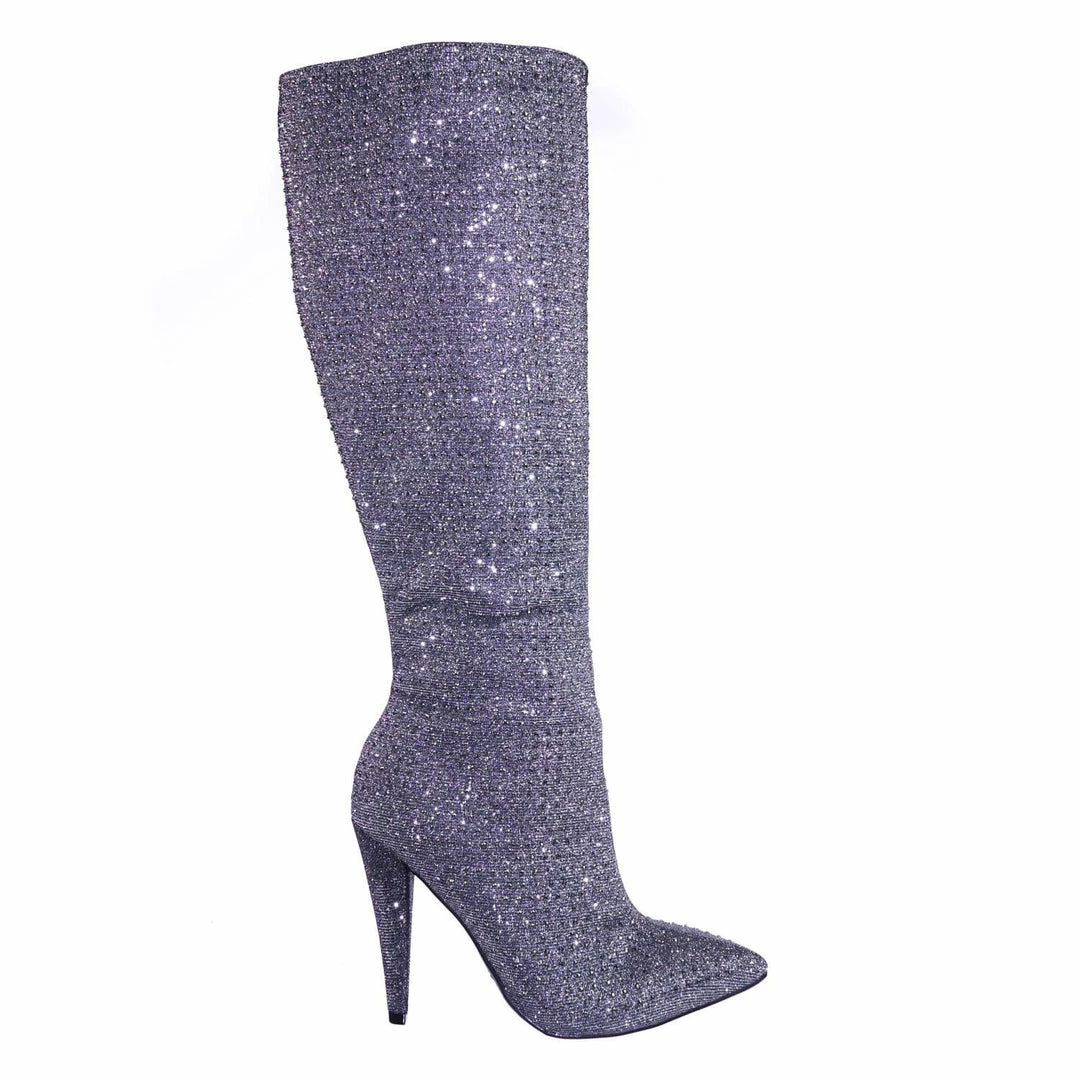 These shiny party boots features a mesh glitter fabric with rhinestone crystal embellishment, pointed toe, tapered high heel, full side zipper and lightly padded insole. Silver boots features iridescent rhinestones and the pewter boots features pewter metal studs.