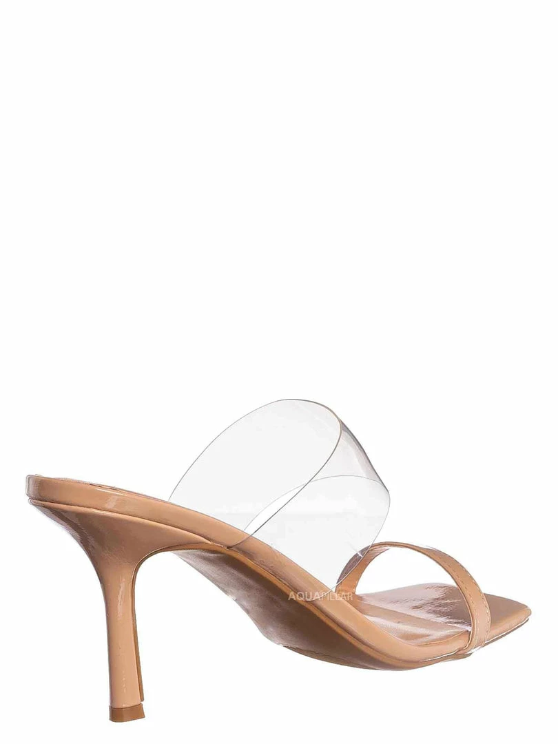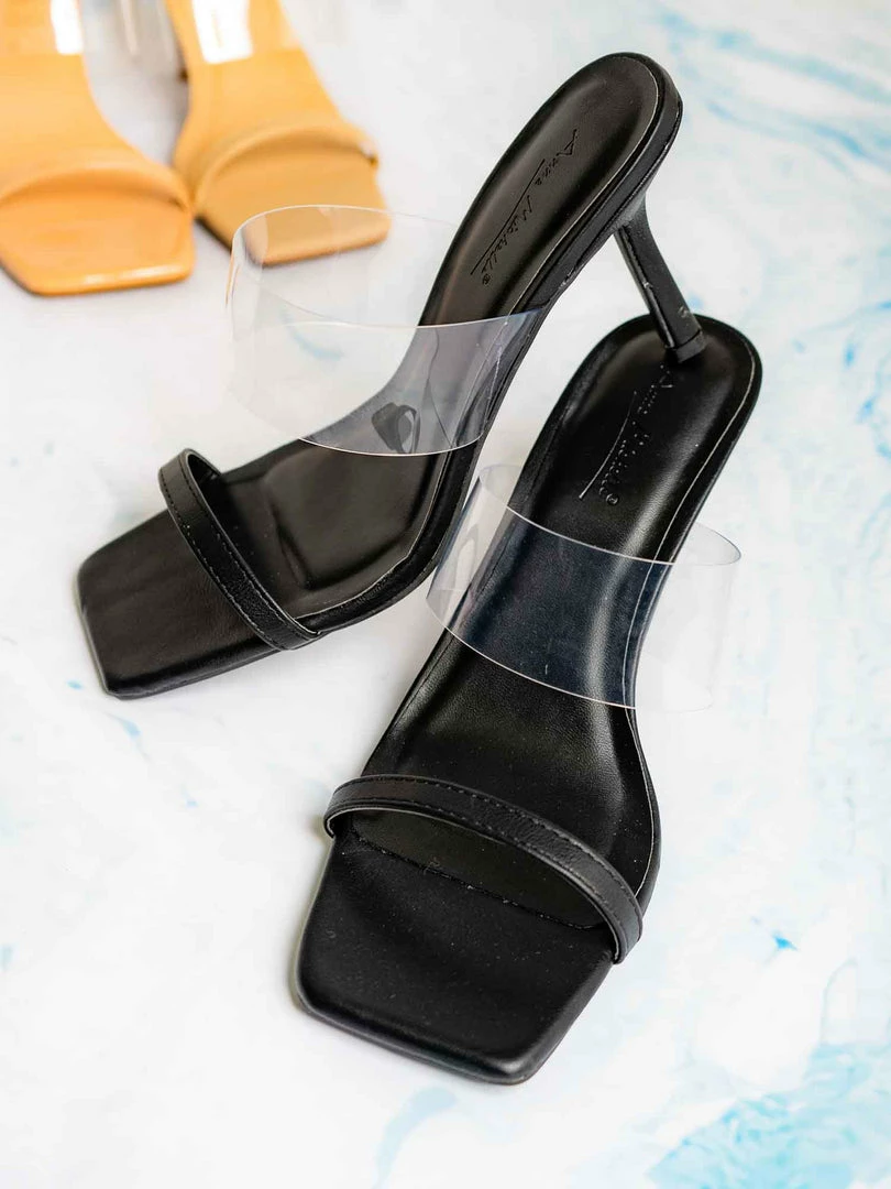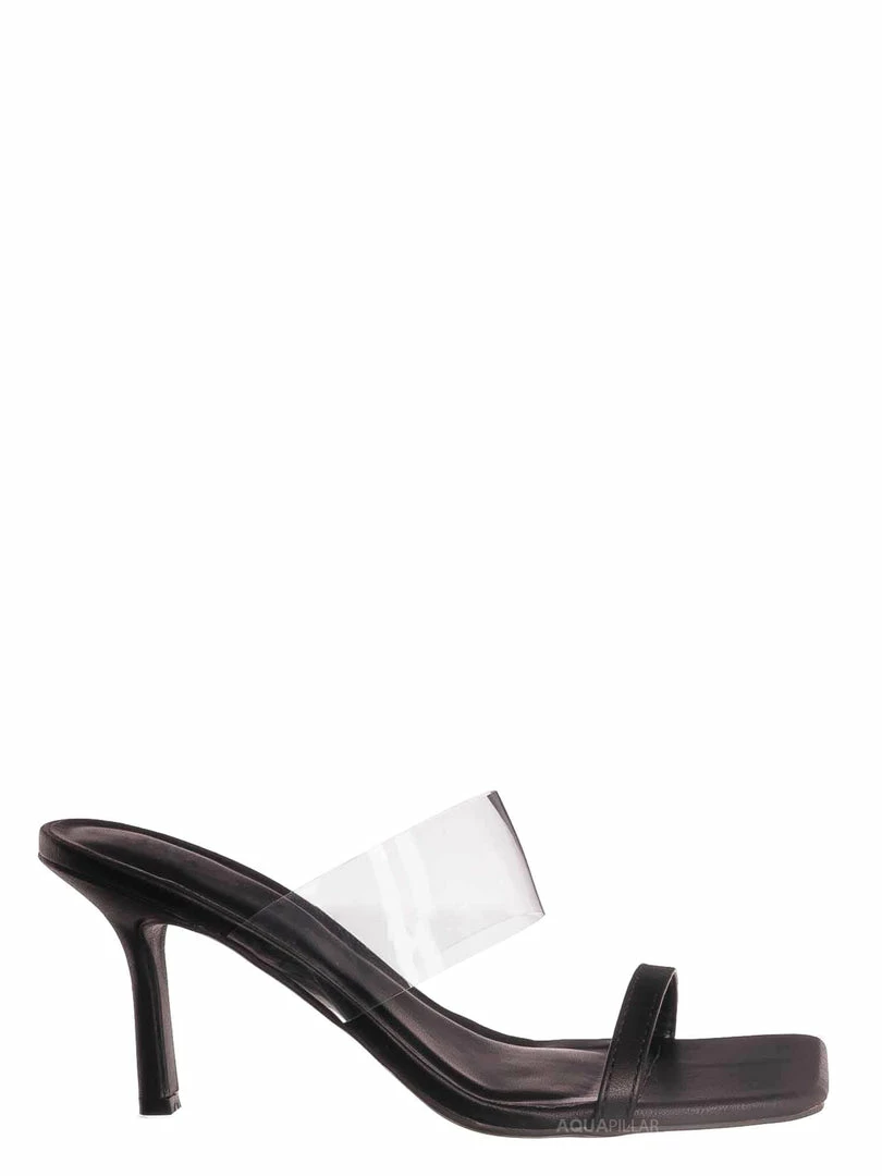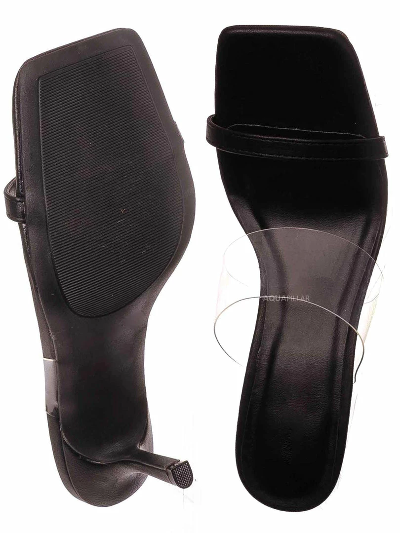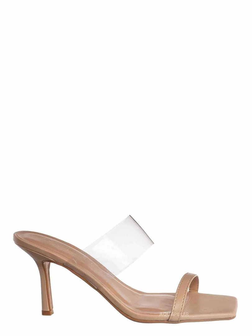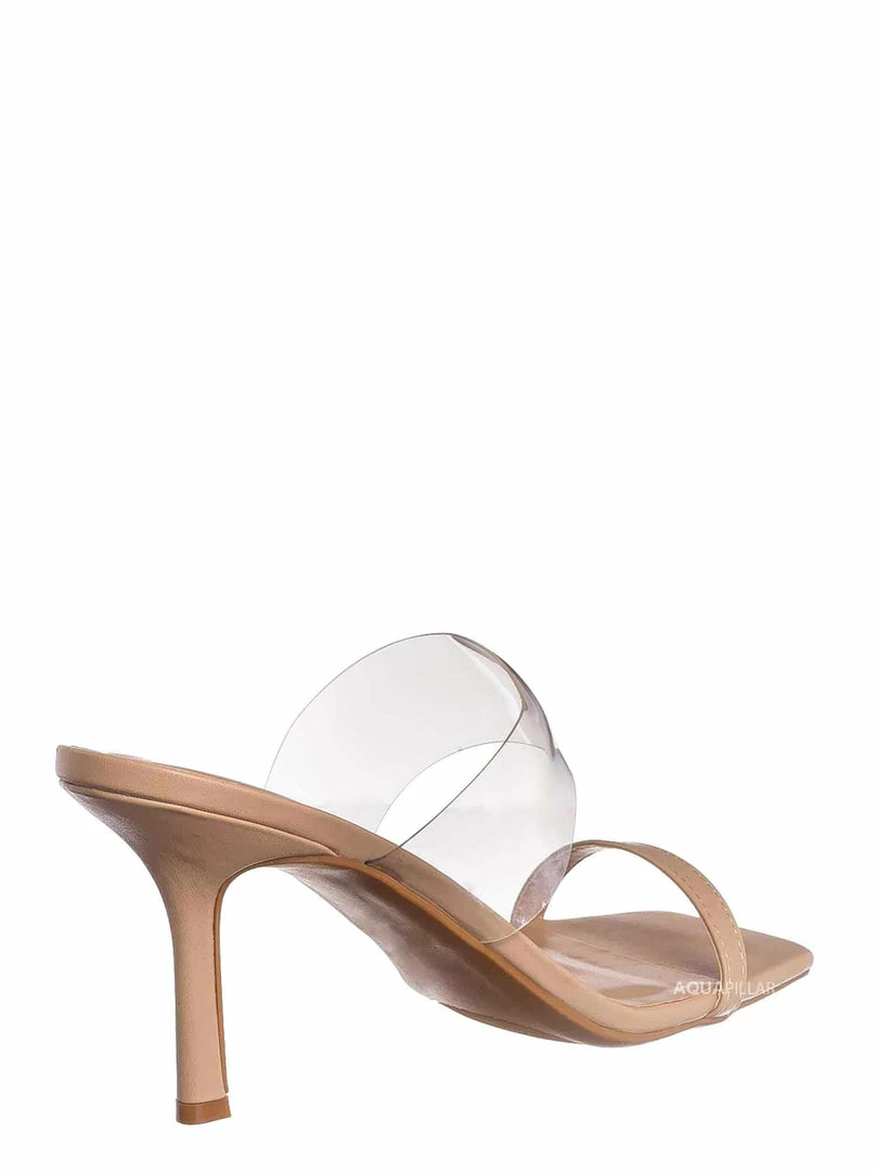 Product Detail : These sandals features a high heel stiletto with open squared toe, clear / transparent / lucite vinyl strap acompanied by a thin solid strap and lightly padded insole. Choose from faux suede black and beige or beige patent