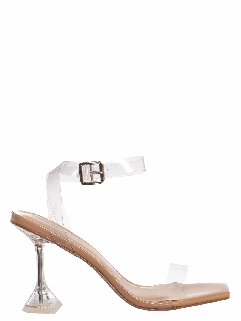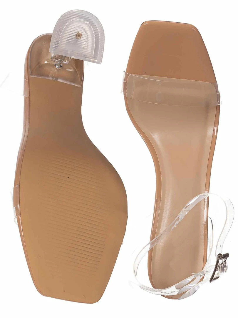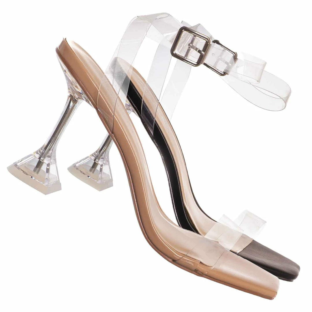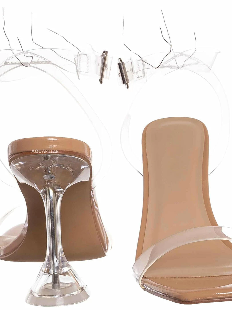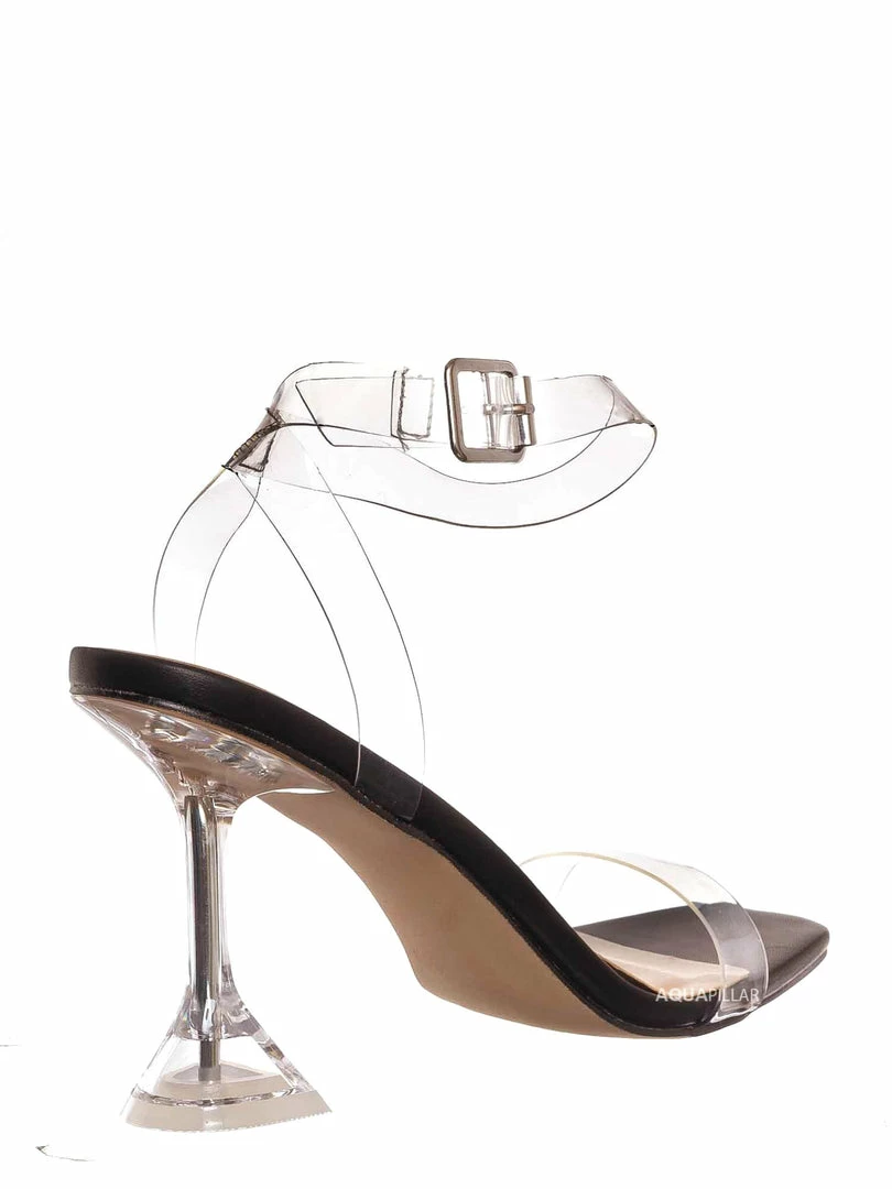 Product Detail : These evening cocktail sandal features a clear acrylic high heel with triangle base. The straps are made of Lucite / clear vinyl that’s flexible and transparent.