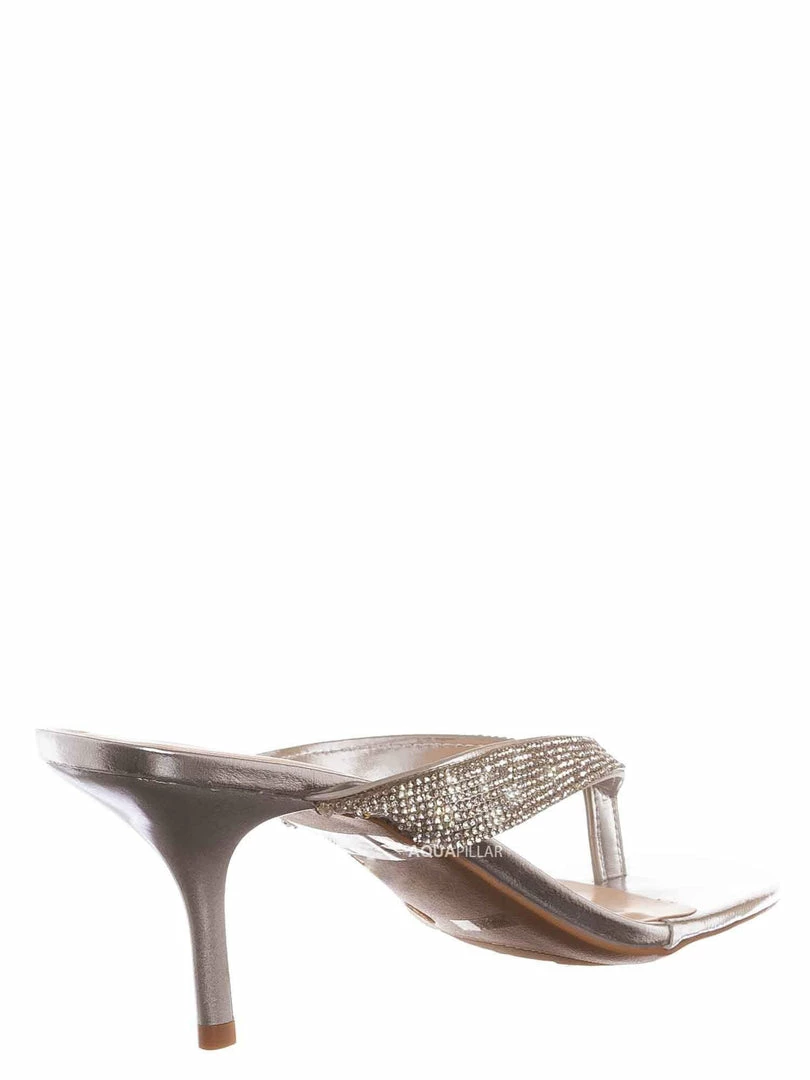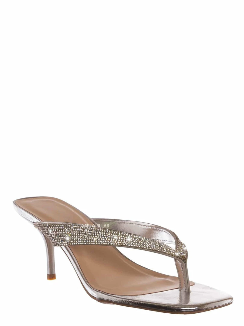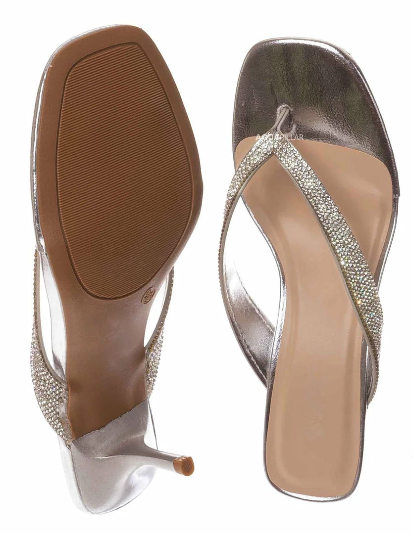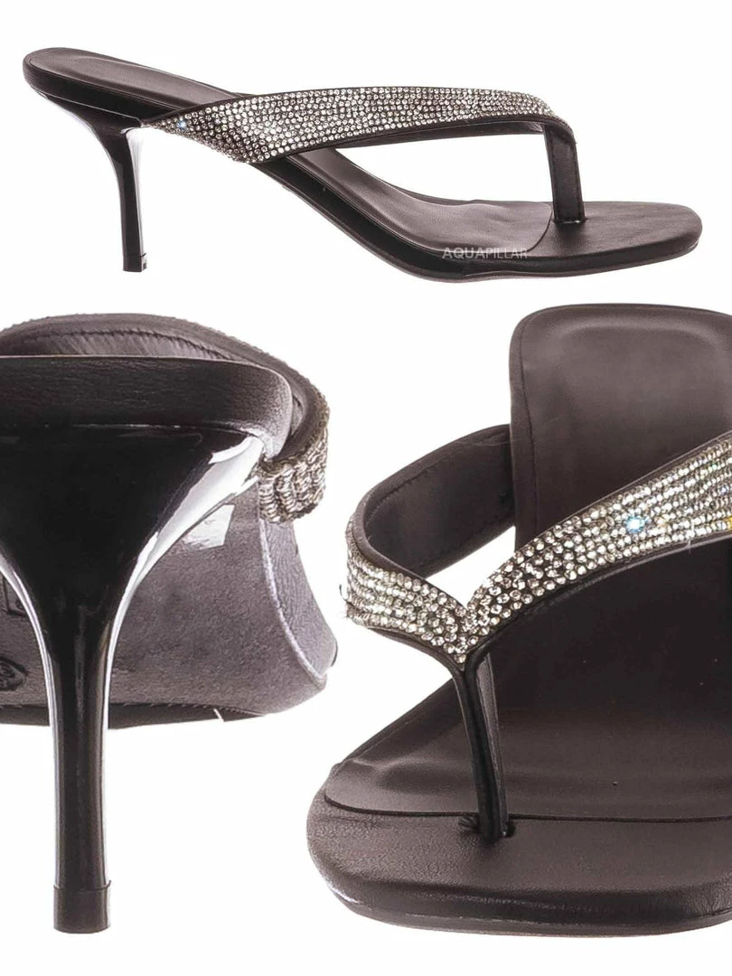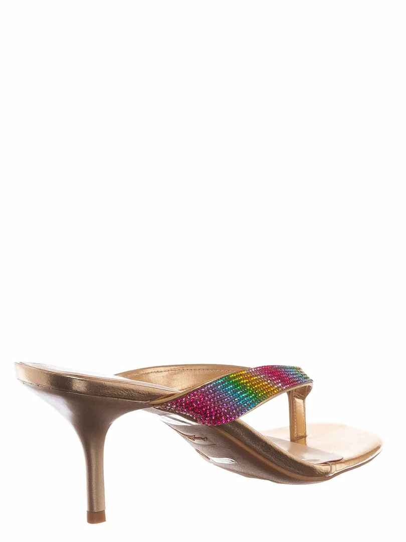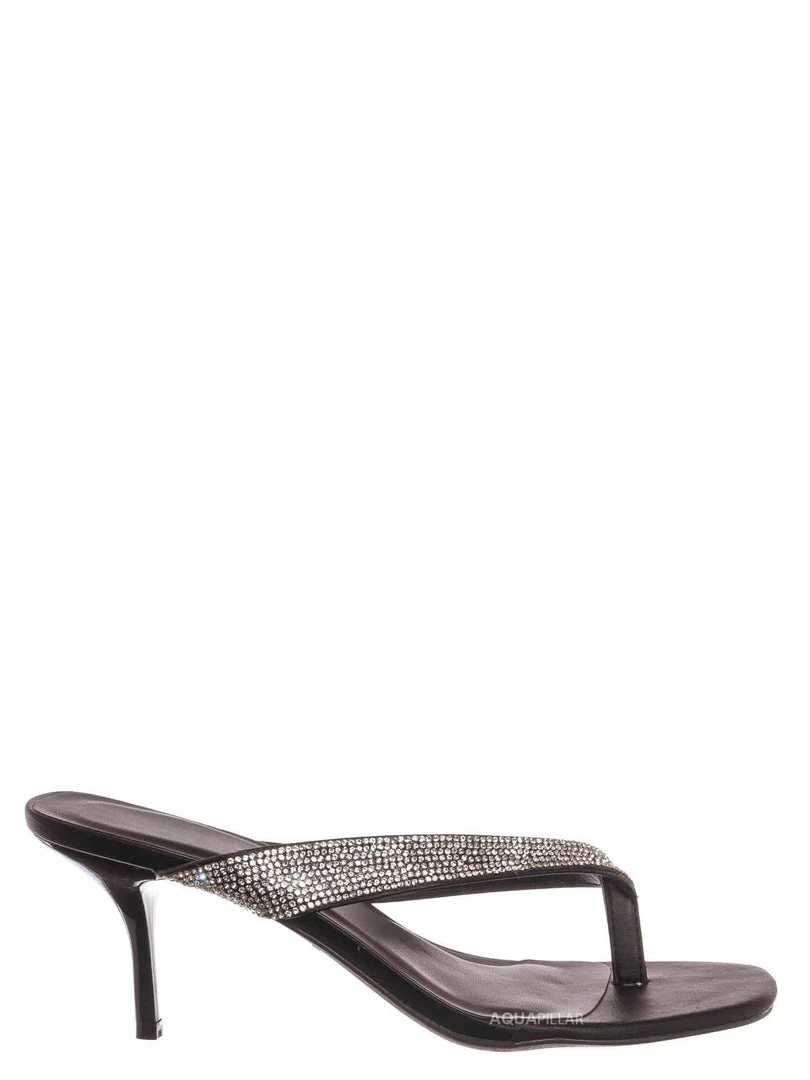 Product Detail : These sandal features a slide in construction, thin high heel stiletto, rhinestone embellished thong strap and lightly padded insole, choose from solid colored rhinestones or rainbow rhinestones.