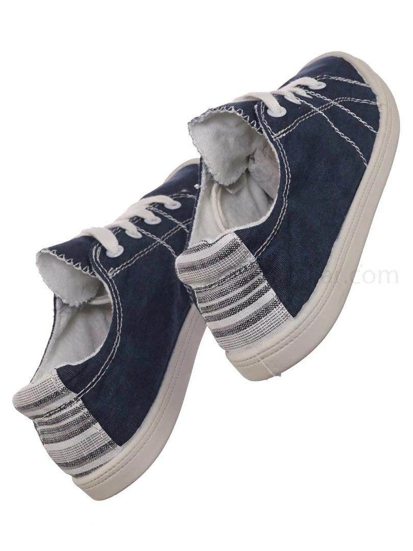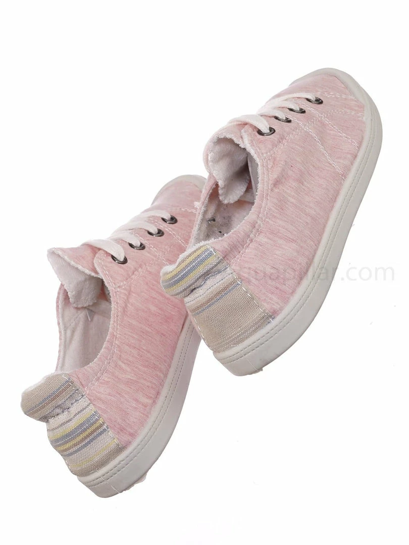 Product Detail : These fashion casual tennis shoes features a rubber flexible platform, lace up closure, low top construction, soft insoles, multi colored back heel tab, raw edges.