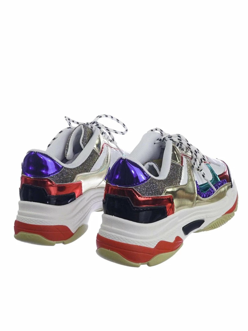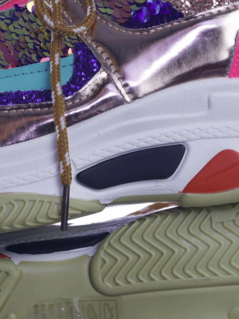 These fashion sneakers features a heavy rubber outosle, color blocked upper, metallic glitter and seqins patches and lace up closure.