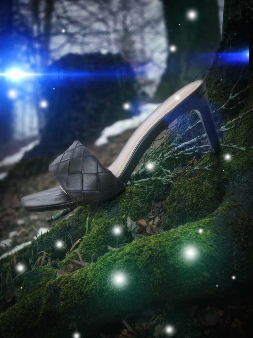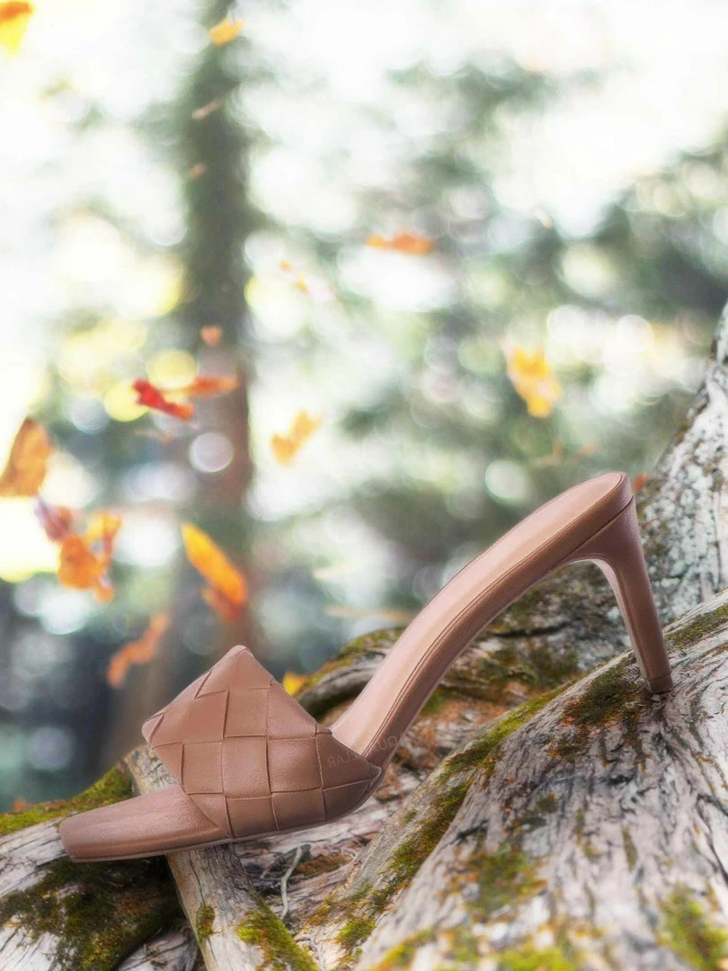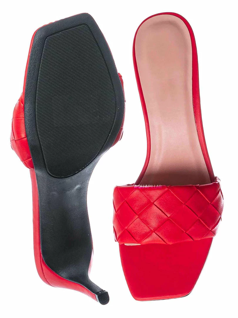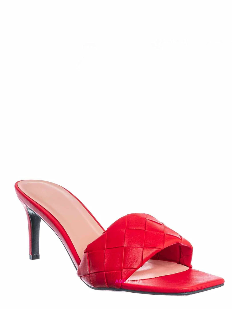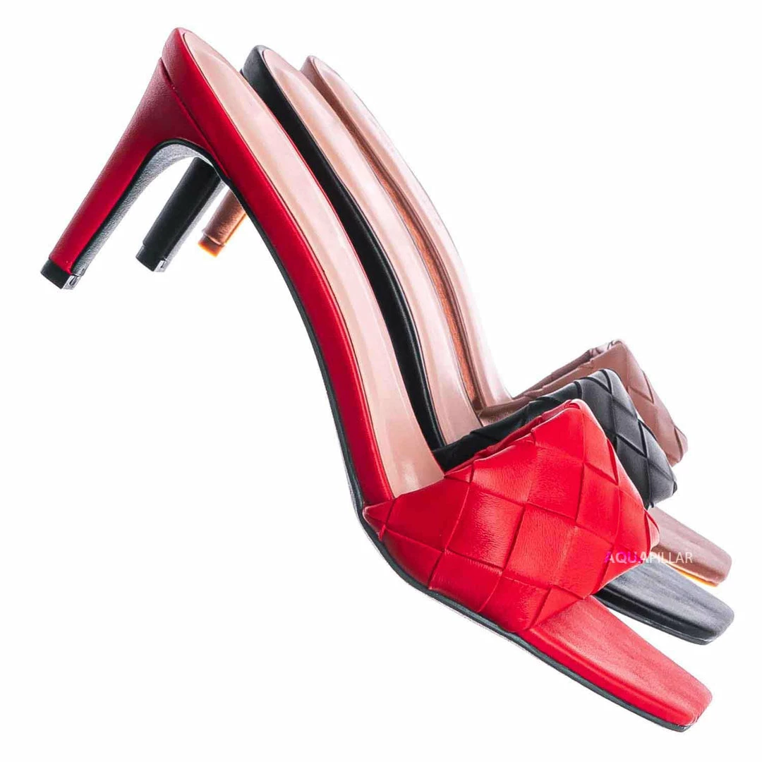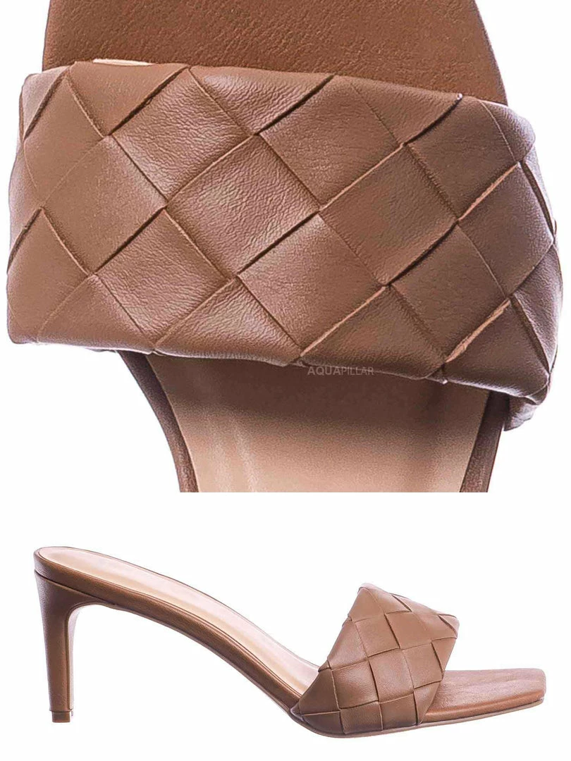 Product Detail : These easy to slip on sandals features a thin stiletto high heel, opened squared toe and wide woven vamp. The insole is lightly padded and the basket weaves are made of vegan friendly faux leather.