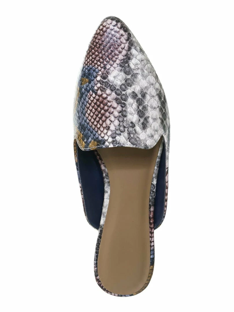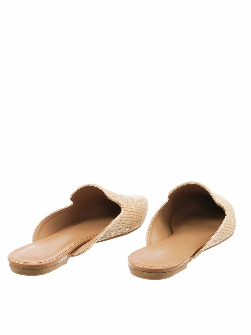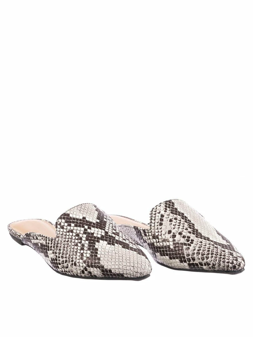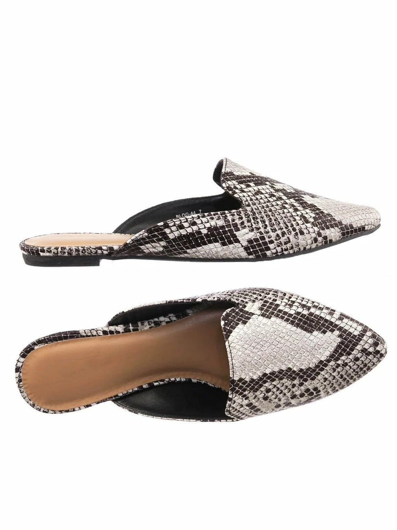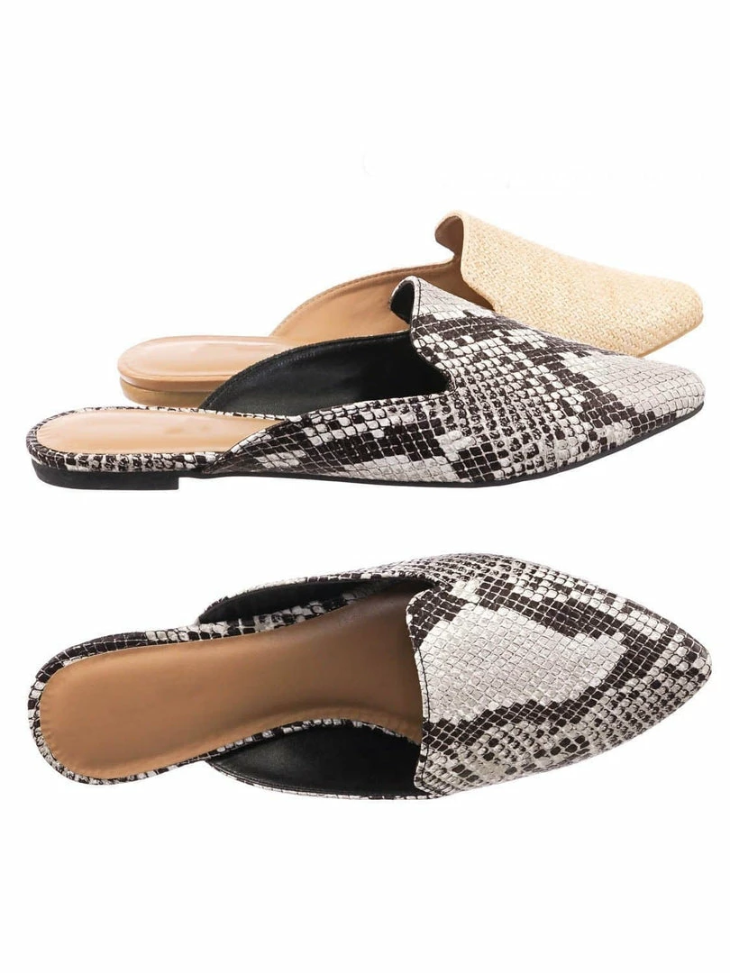 Product Detail : These flat slippers features a pointed toe silhouette, backless slip on construction and lightly padded insole. Choose from Snake Prints or natural raffia.