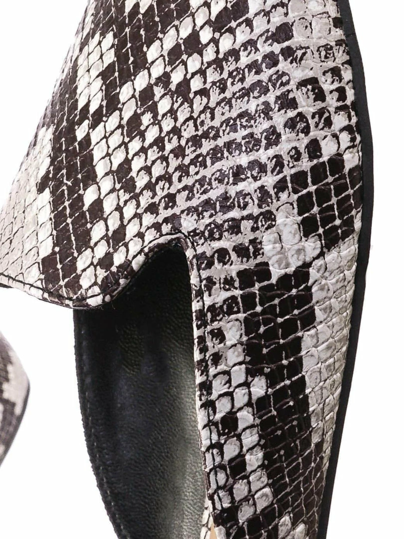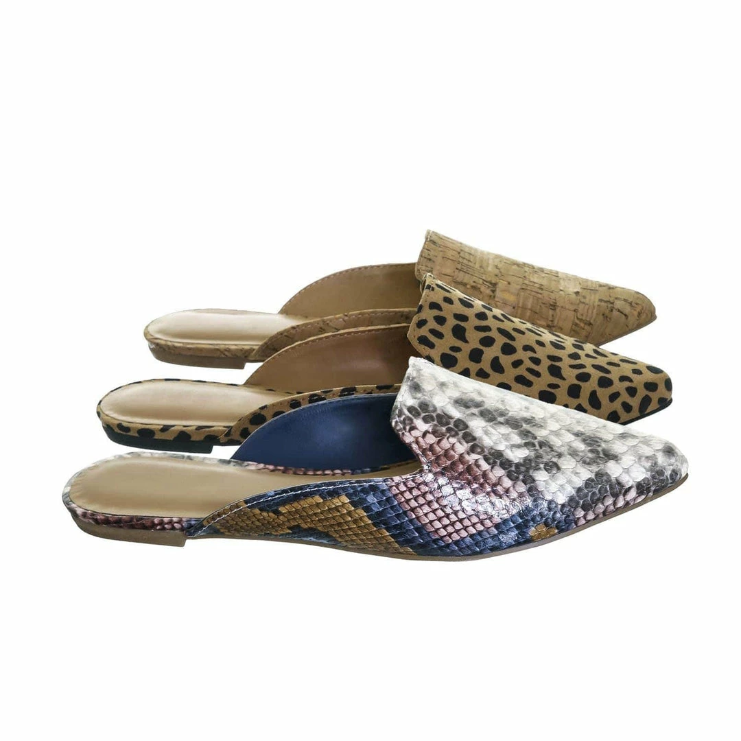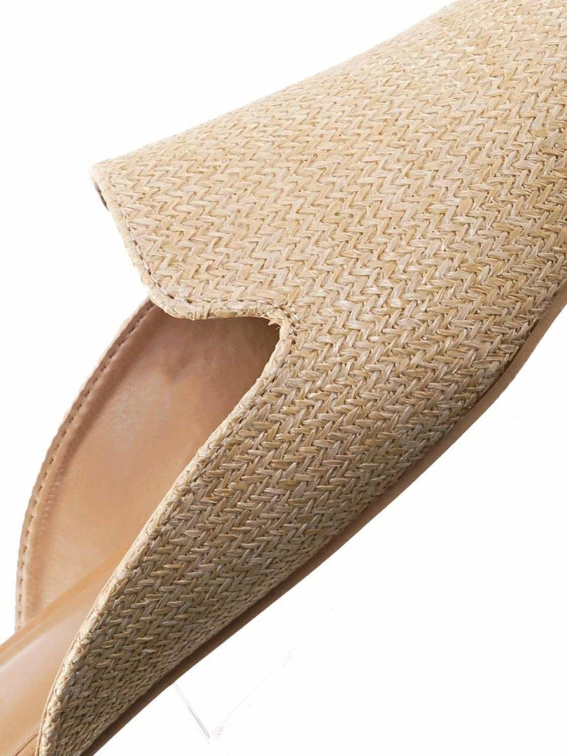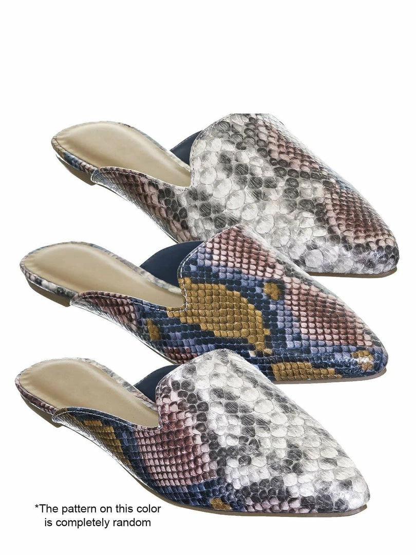 Product Detail : These flat slippers features a pointed toe silhouette, backless slip on construction and lightly padded insole. Choose from Snake Prints or natural raffia.