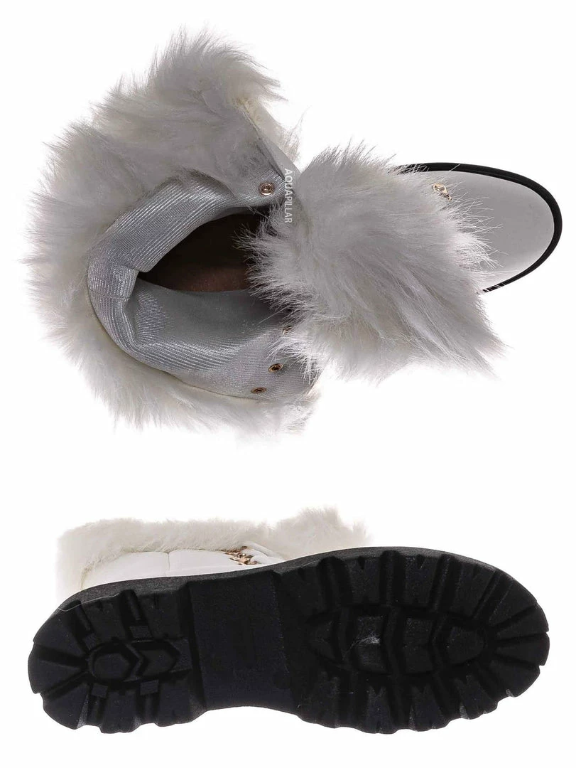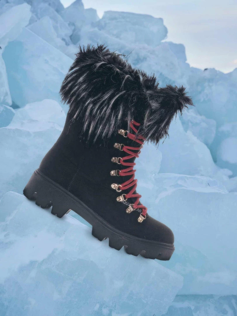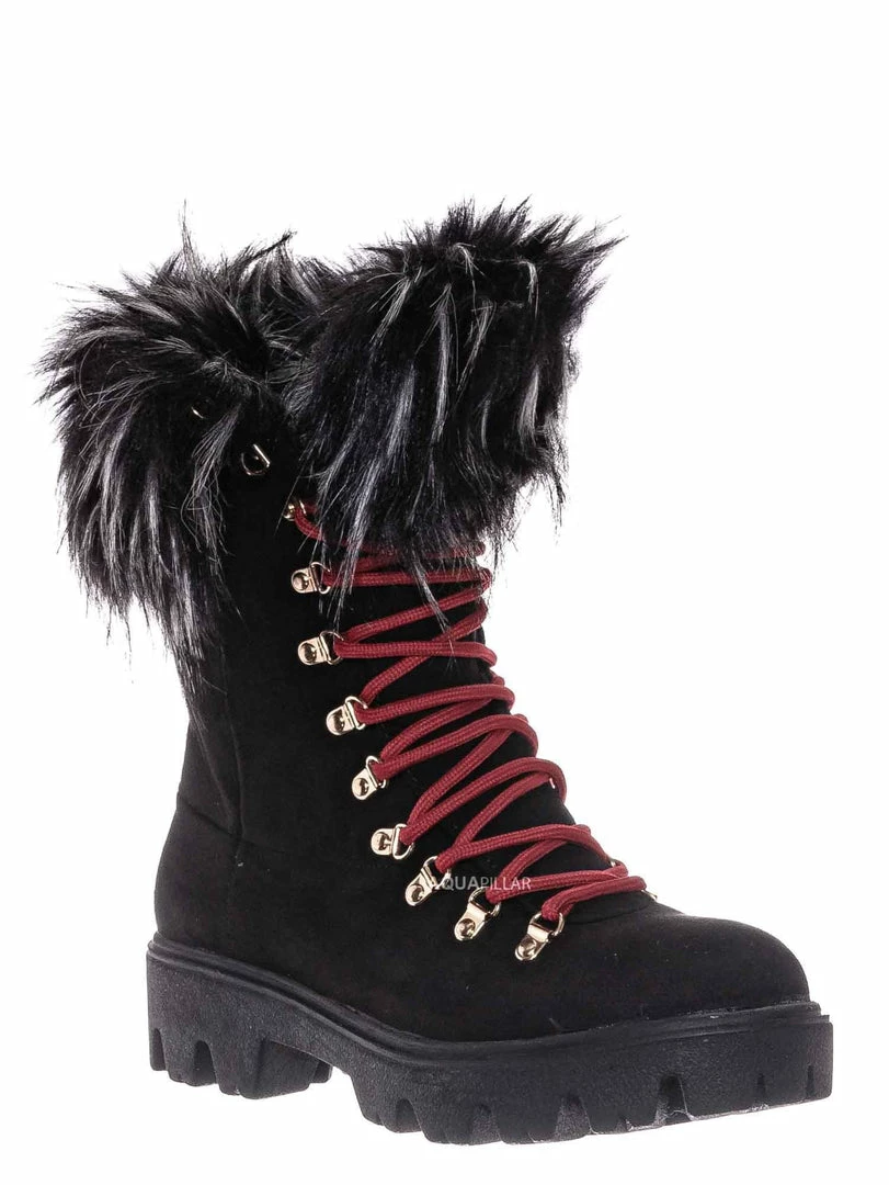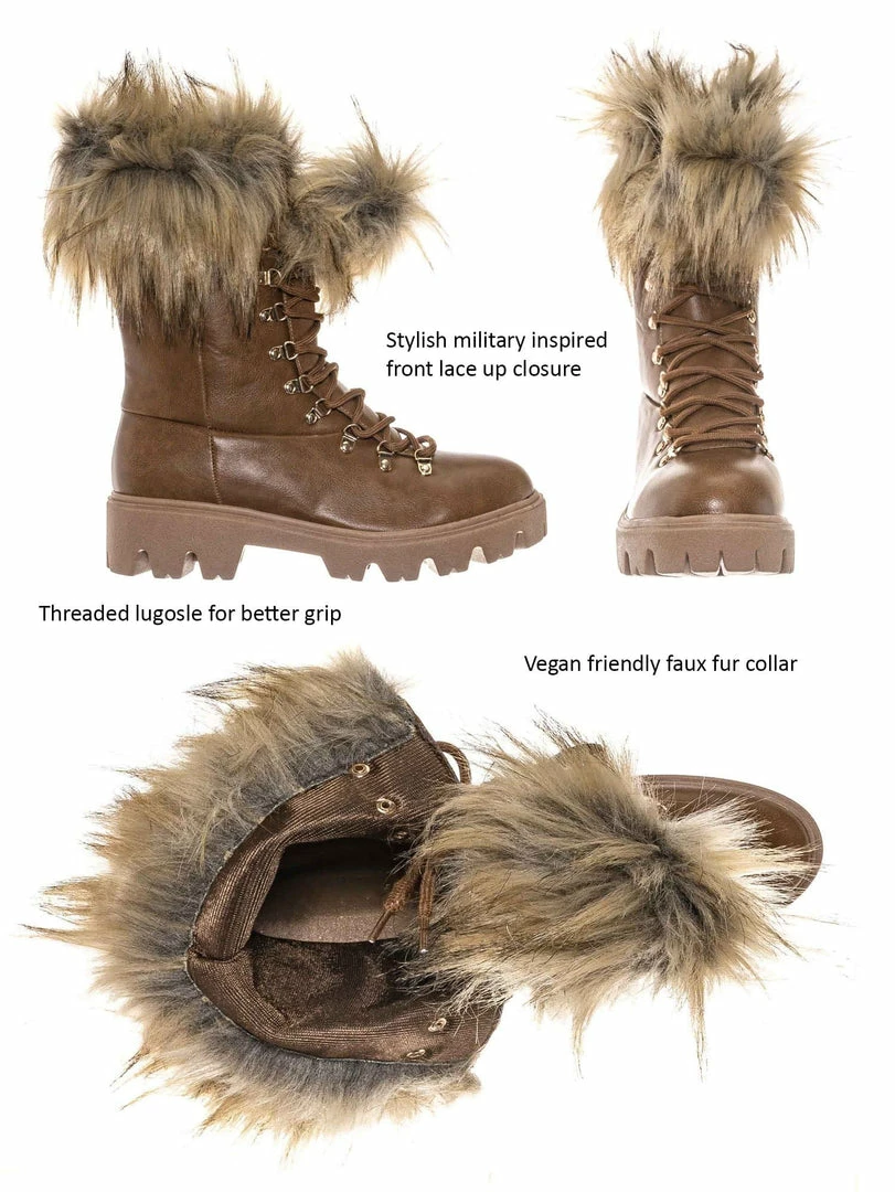 Product Detail : These boots features a military inspired combat boot silhouette, threaded lug sole for better grip, rounded closed toe, vegan friendly faux fur collar, lightly padded insole.