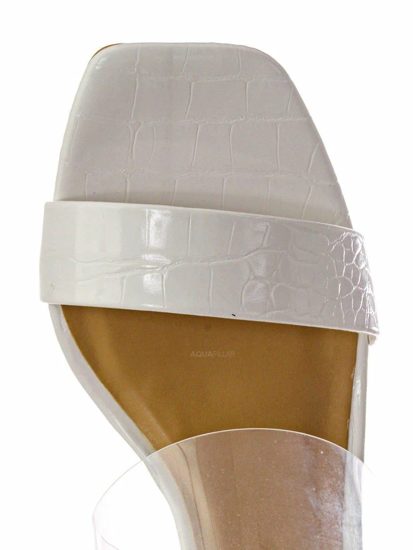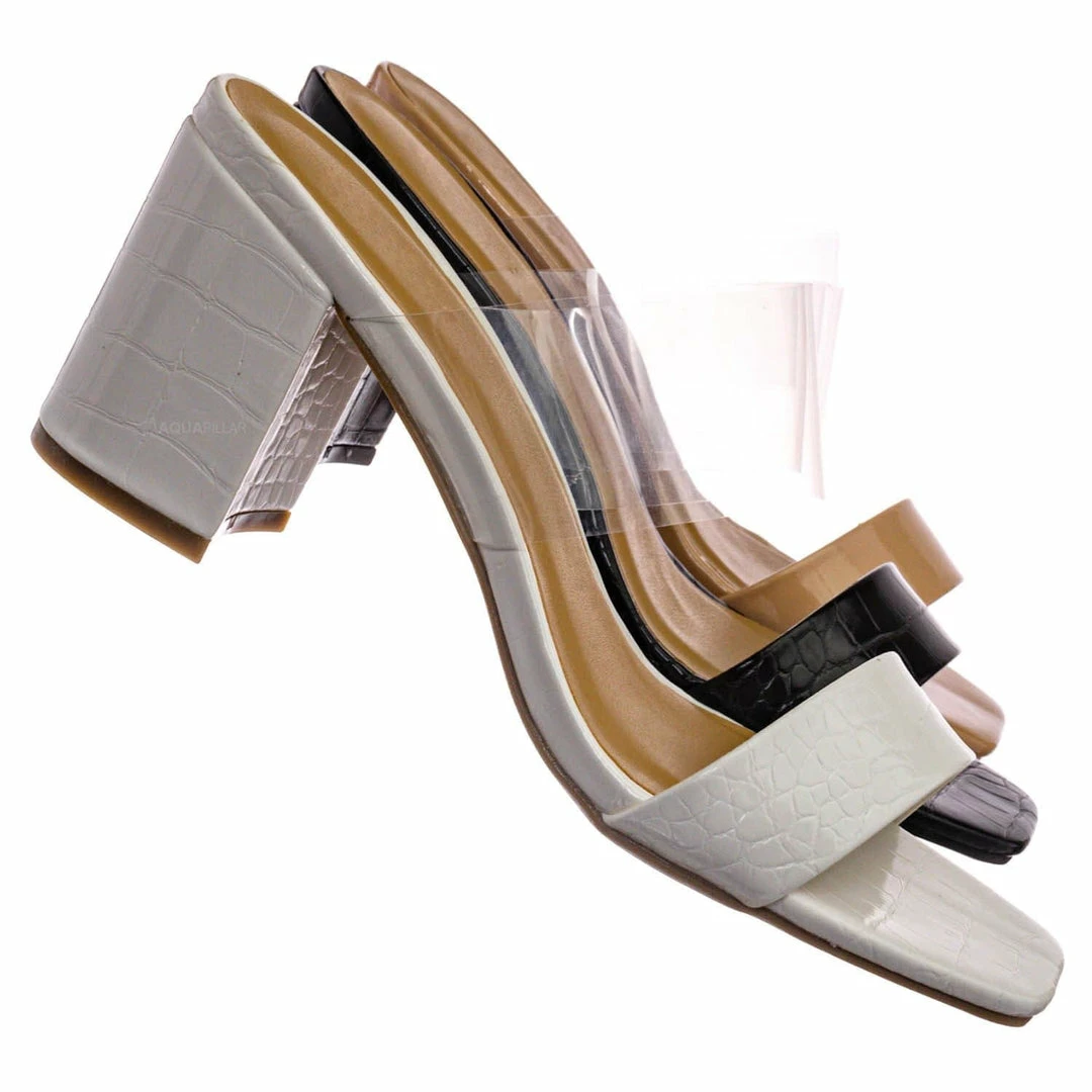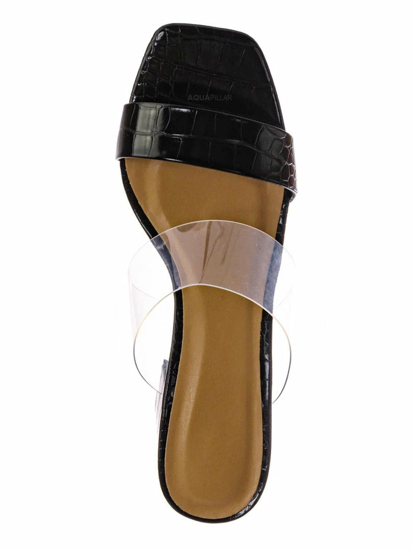Product Detail : these sandals features a low chunky block high heel, opened square toe, clear transparent / Lucite vinyl upper strap, matching lower strap, lightly padded insole and slide in mule construction. Choose from solid or croc embossed prints.