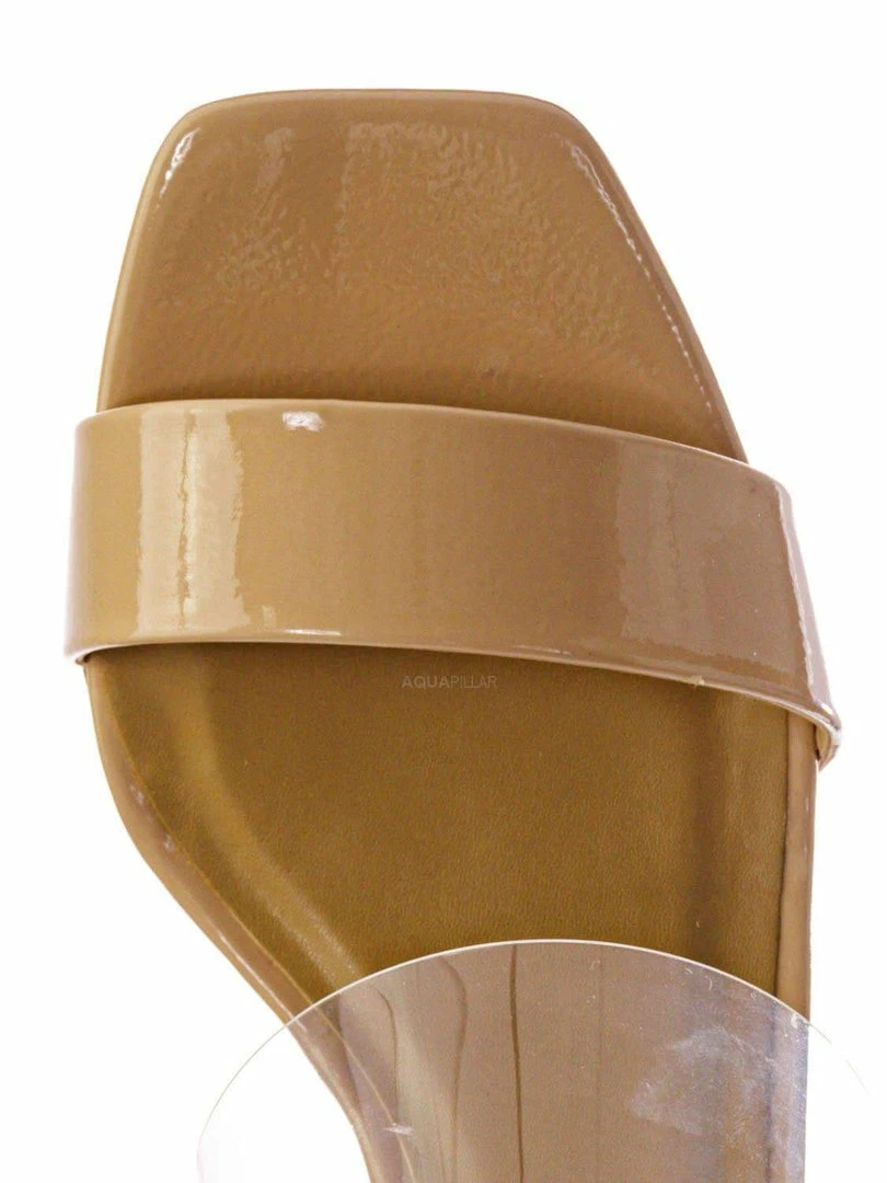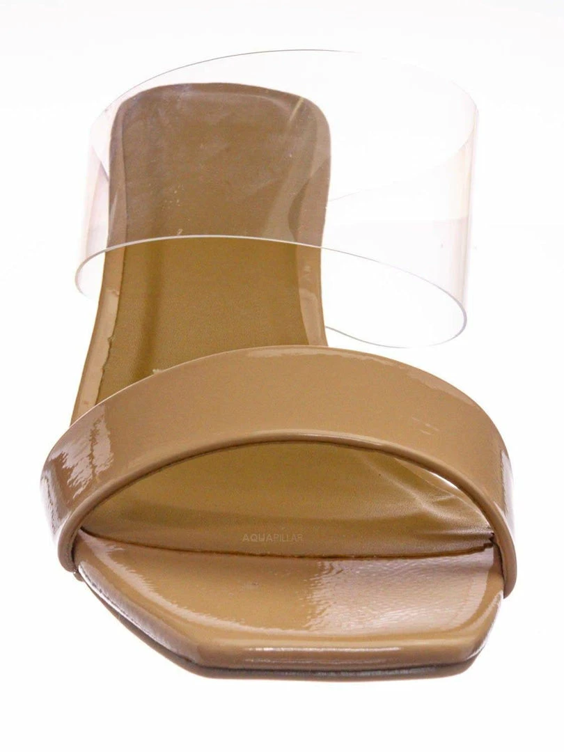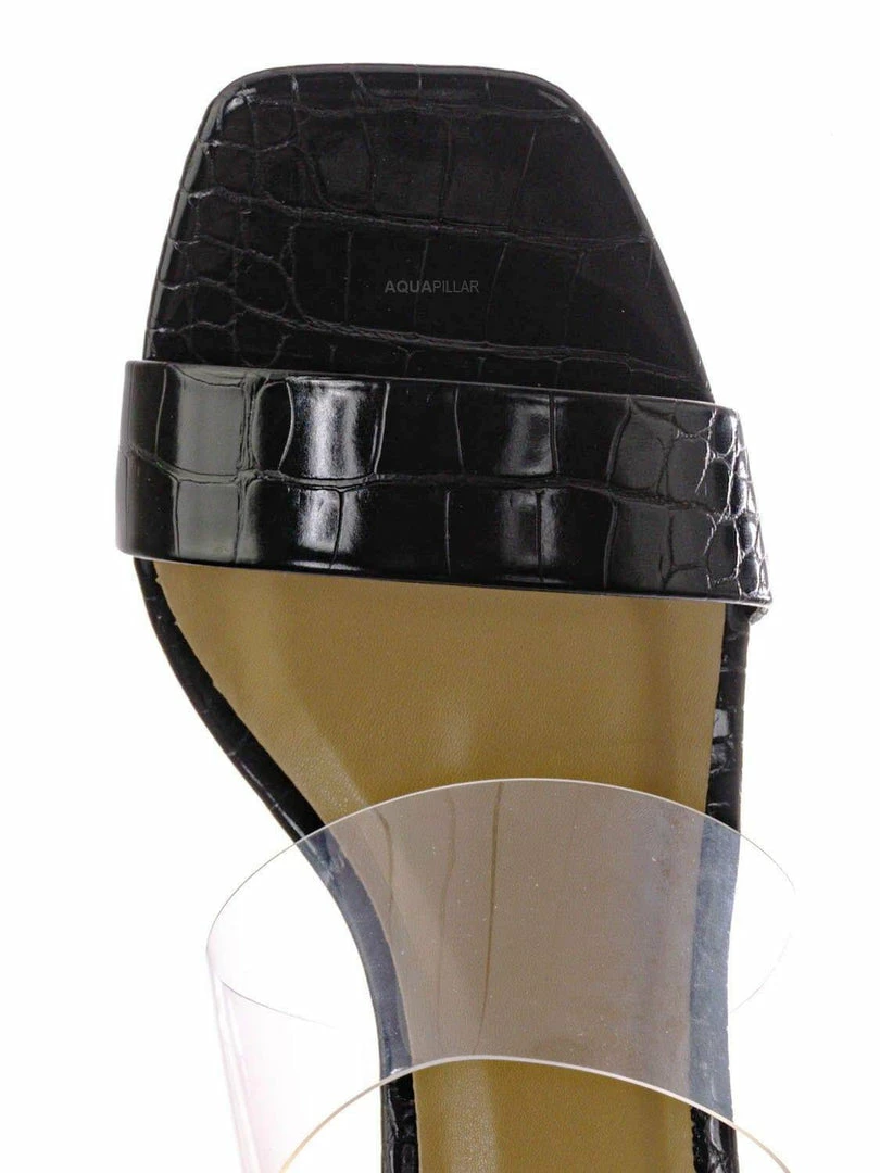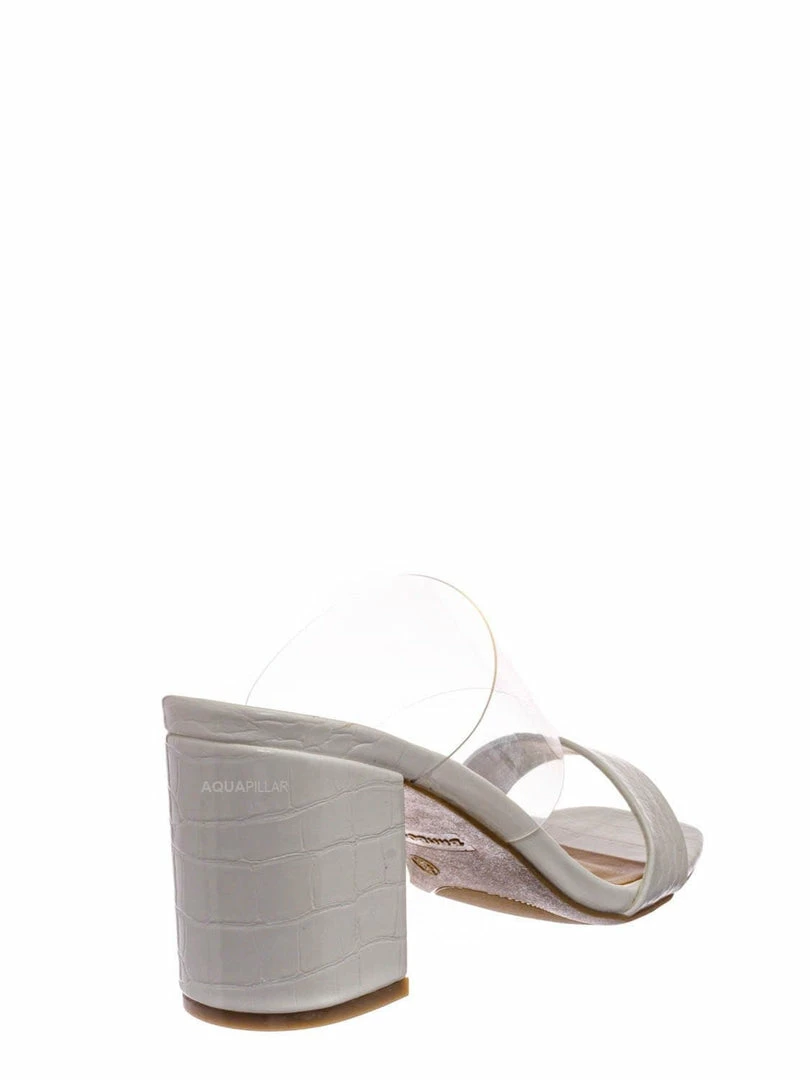Product Detail : these sandals features a low chunky block high heel, opened square toe, clear transparent / Lucite vinyl upper strap, matching lower strap, lightly padded insole and slide in mule construction. Choose from solid or croc embossed prints.