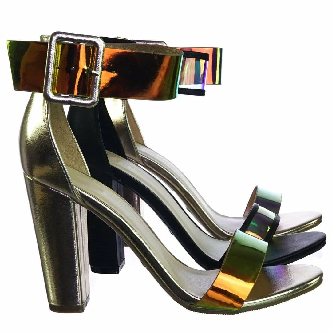 Bamboo Frenzy94 Holographic Iridescent Block High Heel Dress Sandal W Thick Ankle Strap