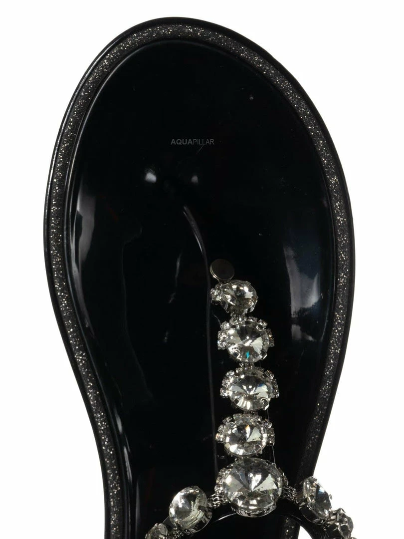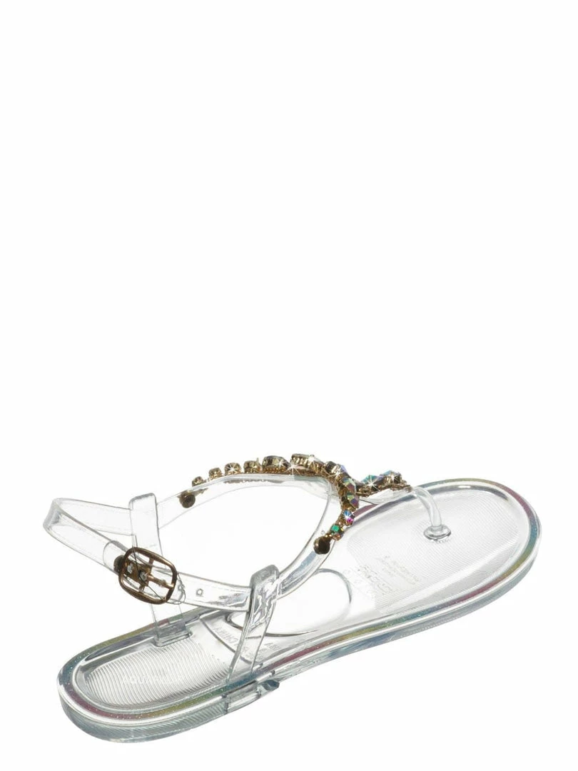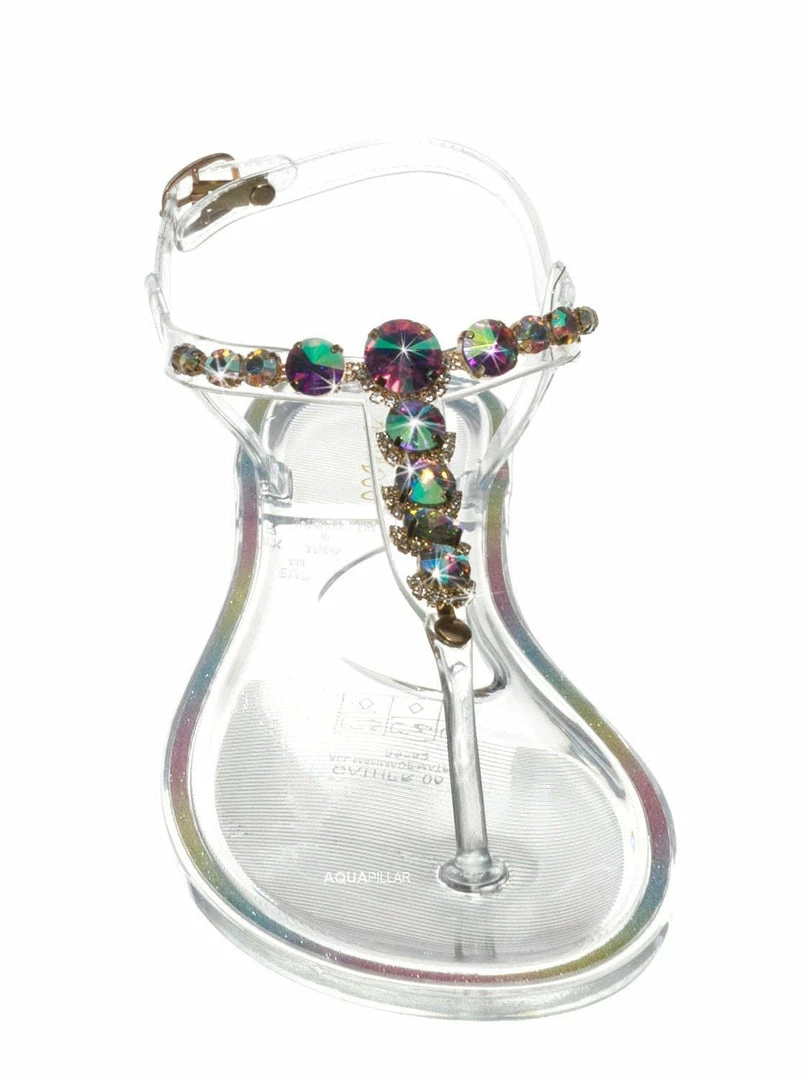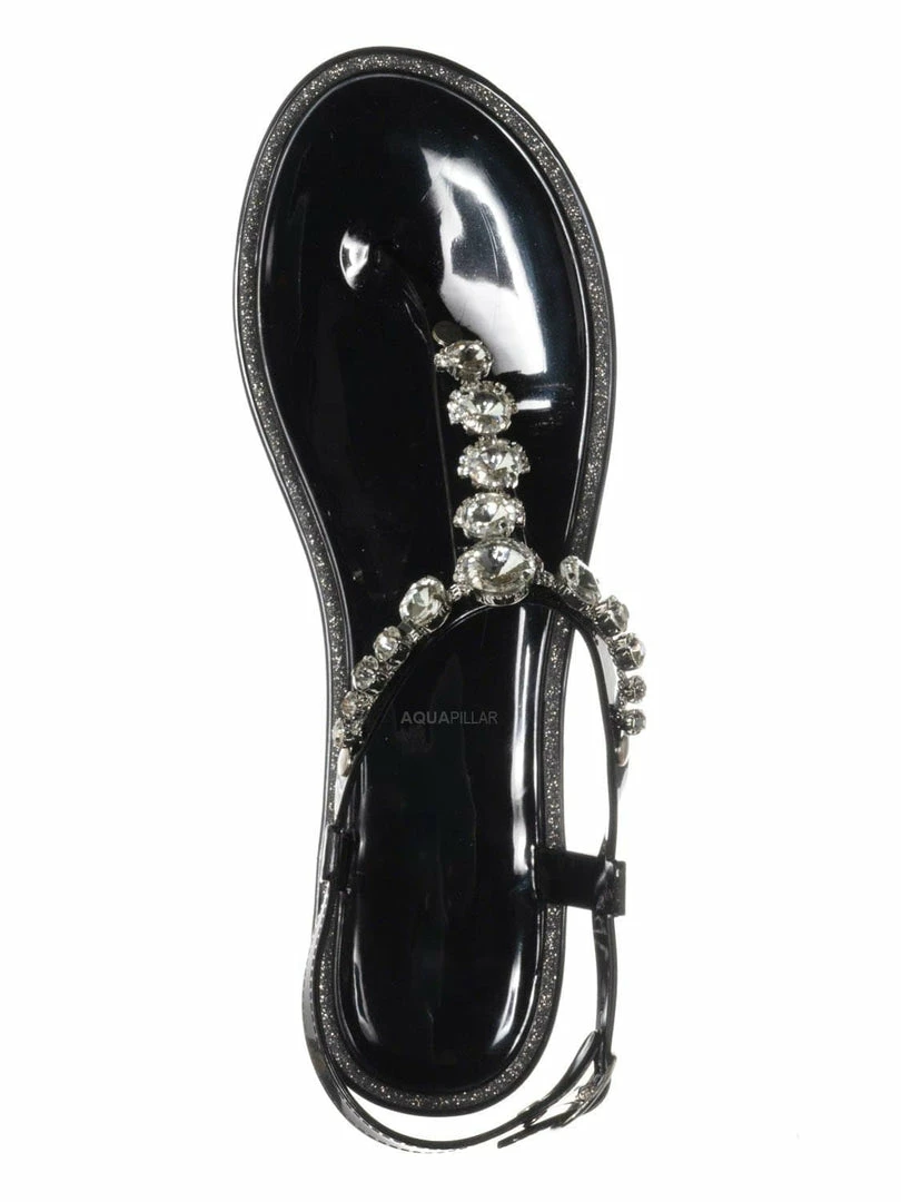 Product Detail : These jelly sandals features an adjustable ankle strap, rhinestone jewel ornamentation t-strap, small rhinestone crysal embellishement along the larger jewels, metal stud detail, thon strap, soft jelly like pvc material, glitter outter detail on the insole and lightly padded insole.