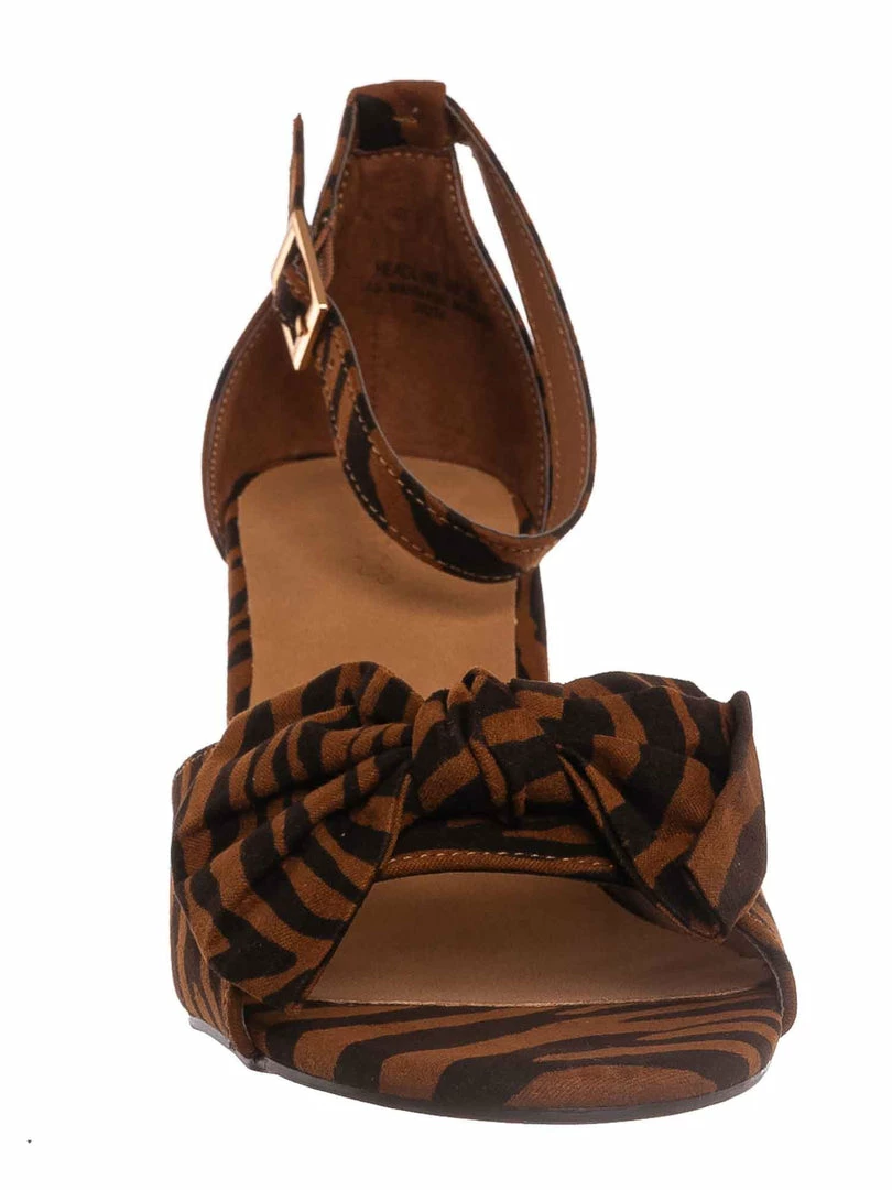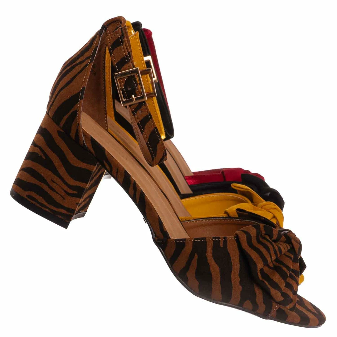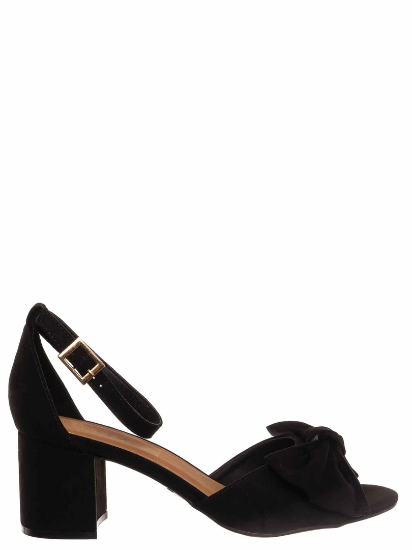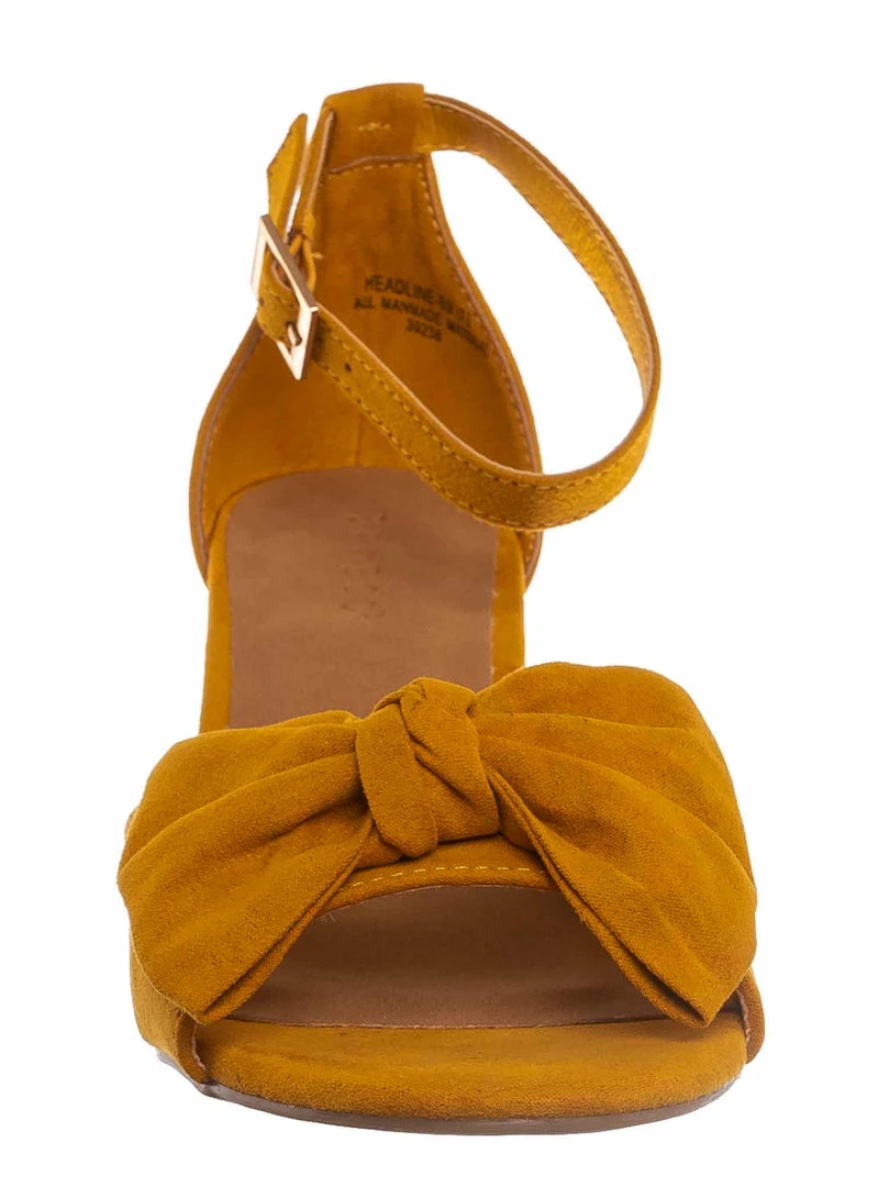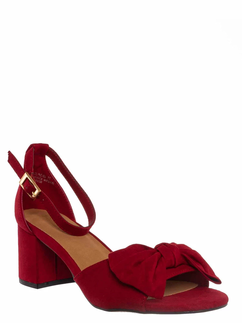 Product Detail : This dress sandal features a two-piece construction, adjustable ankle strap, chunky high block heel, oversized bow ornamentation, open rounded toe, and double open shank.