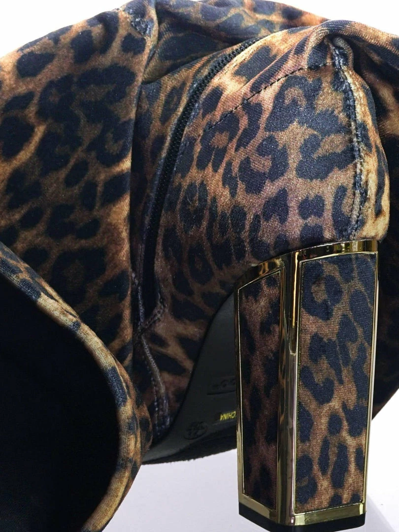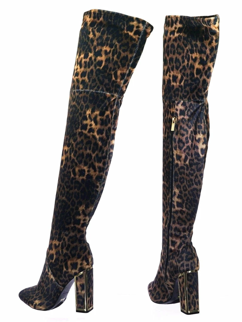 Make a statement with these metal framed block heel boots featuring pointed toe, chunky heel, thigh high shaft that is soft and stretchy. The circumference of this boots is slightly smaller than normal, please measure your thigh size carefully before making the purchase.