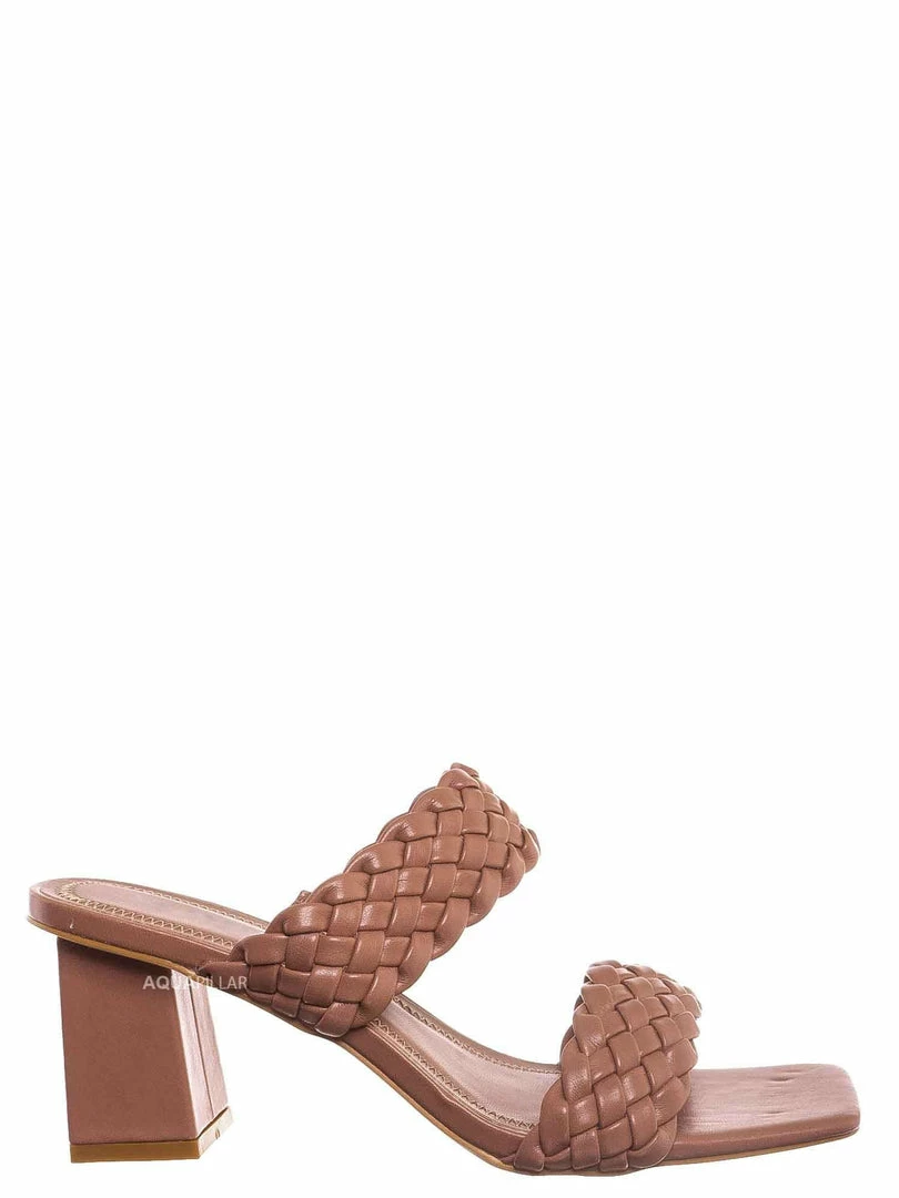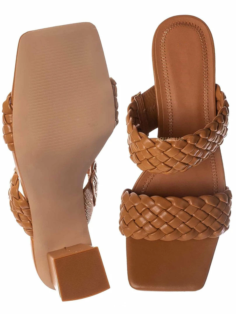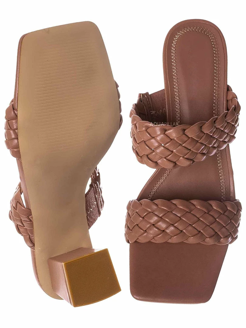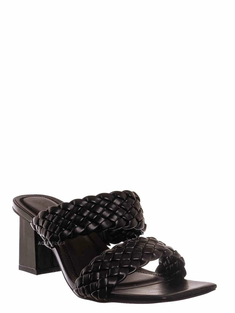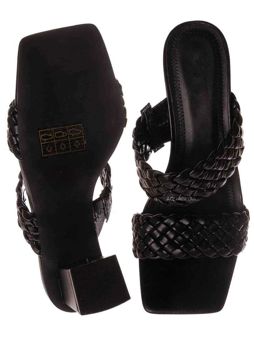 Product Detail: This slide-in slipper features a chunky tapered block heel, open square toe, basket-woven / braided double strap, slide in mule construction and lightly padded insole