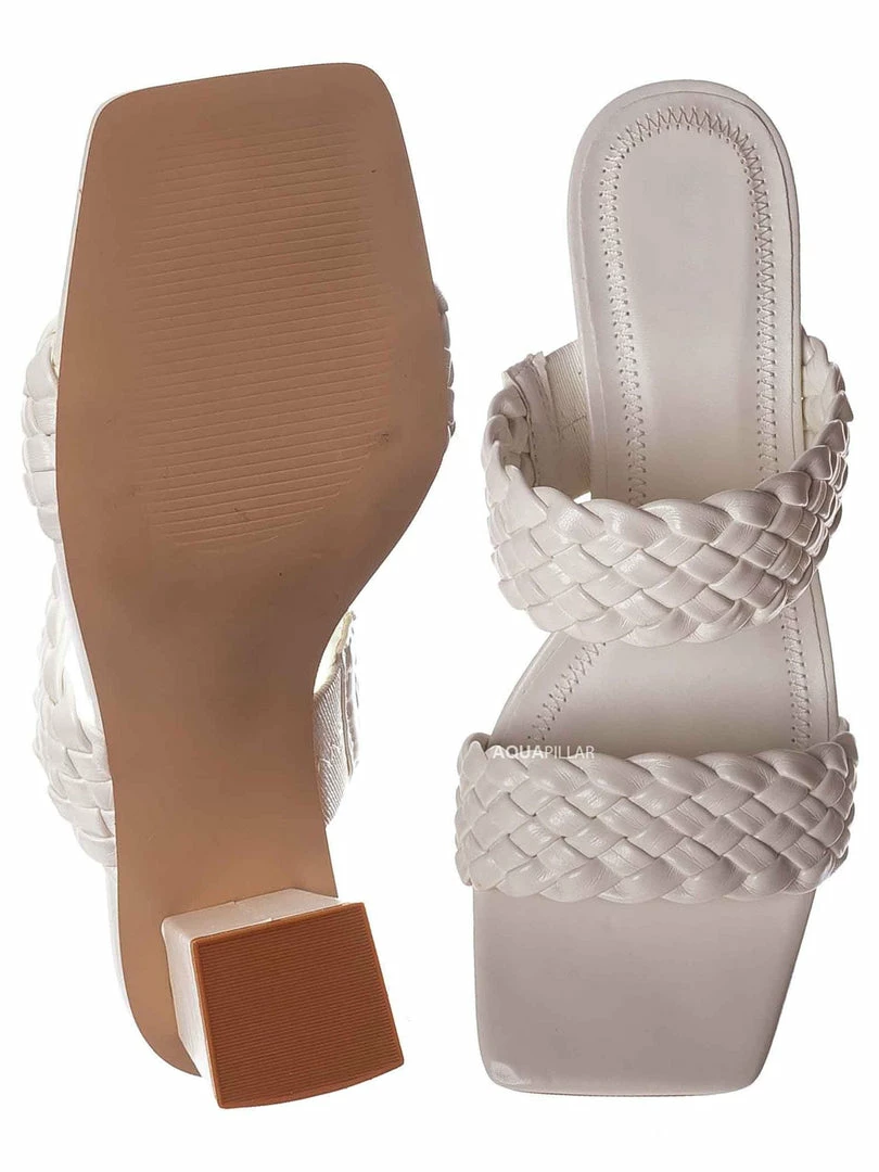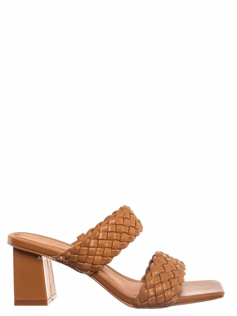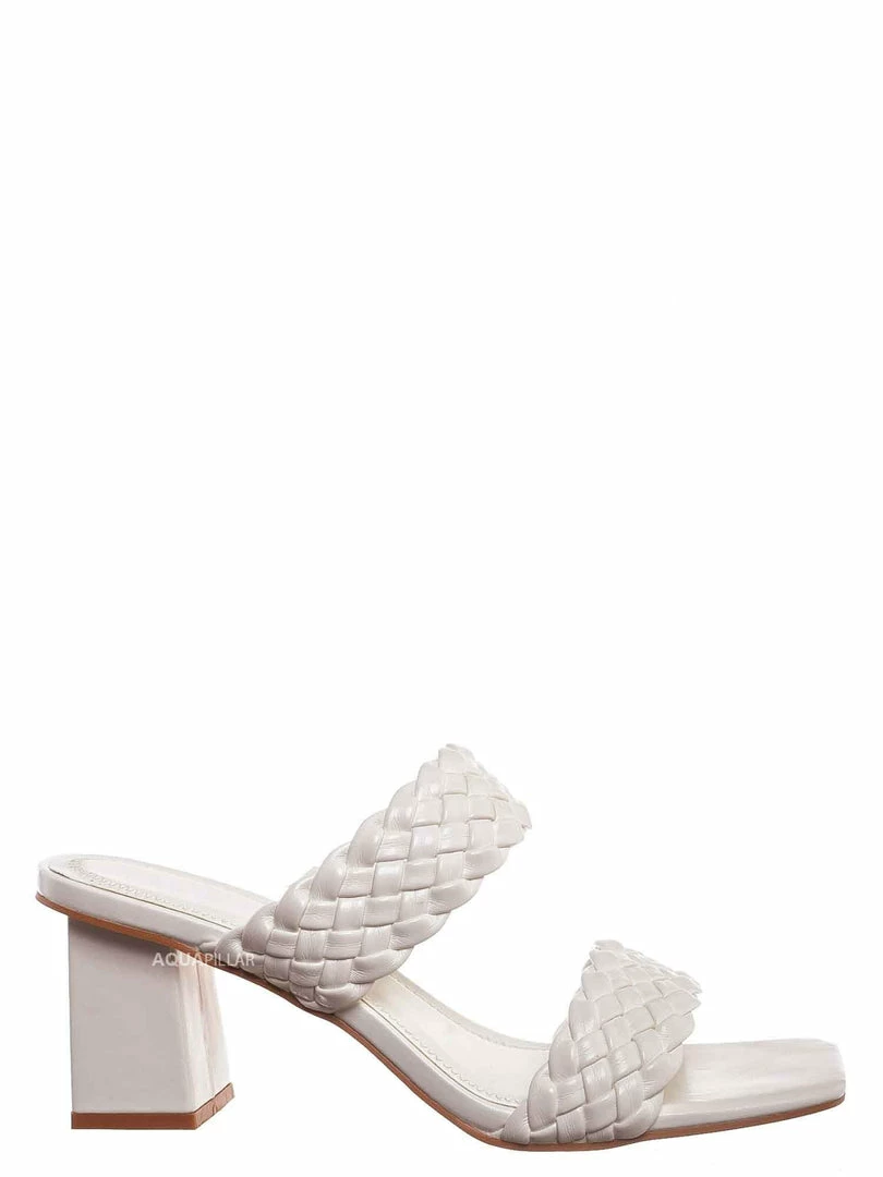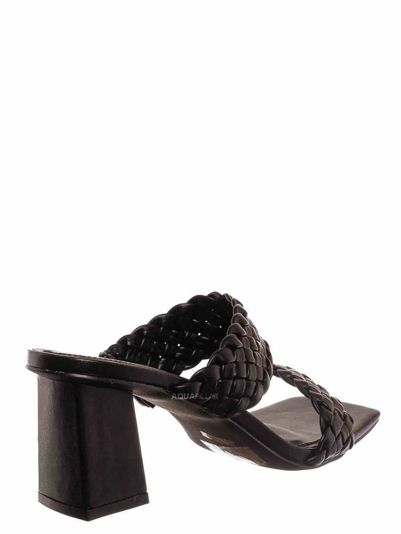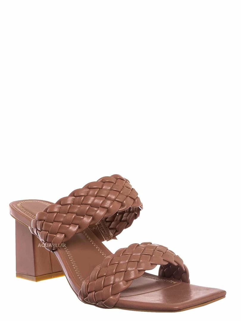 Product Detail: This slide-in slipper features a chunky tapered block heel, open square toe, basket-woven / braided double strap, slide in mule construction and lightly padded insole