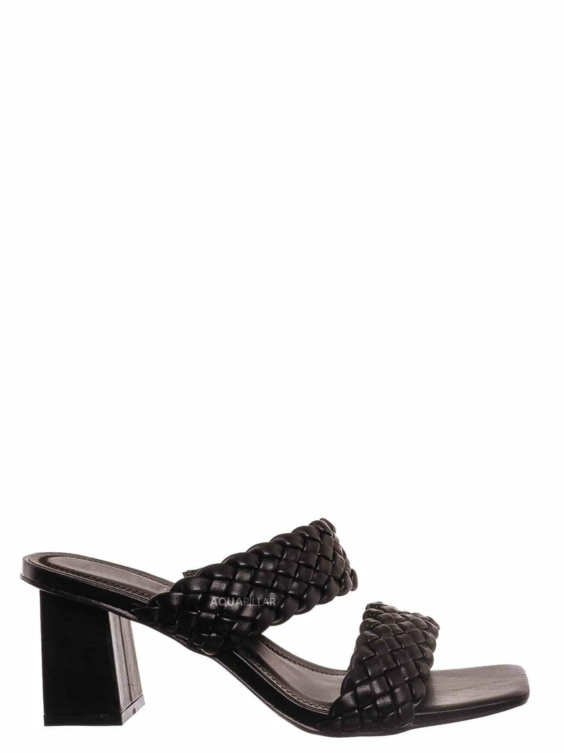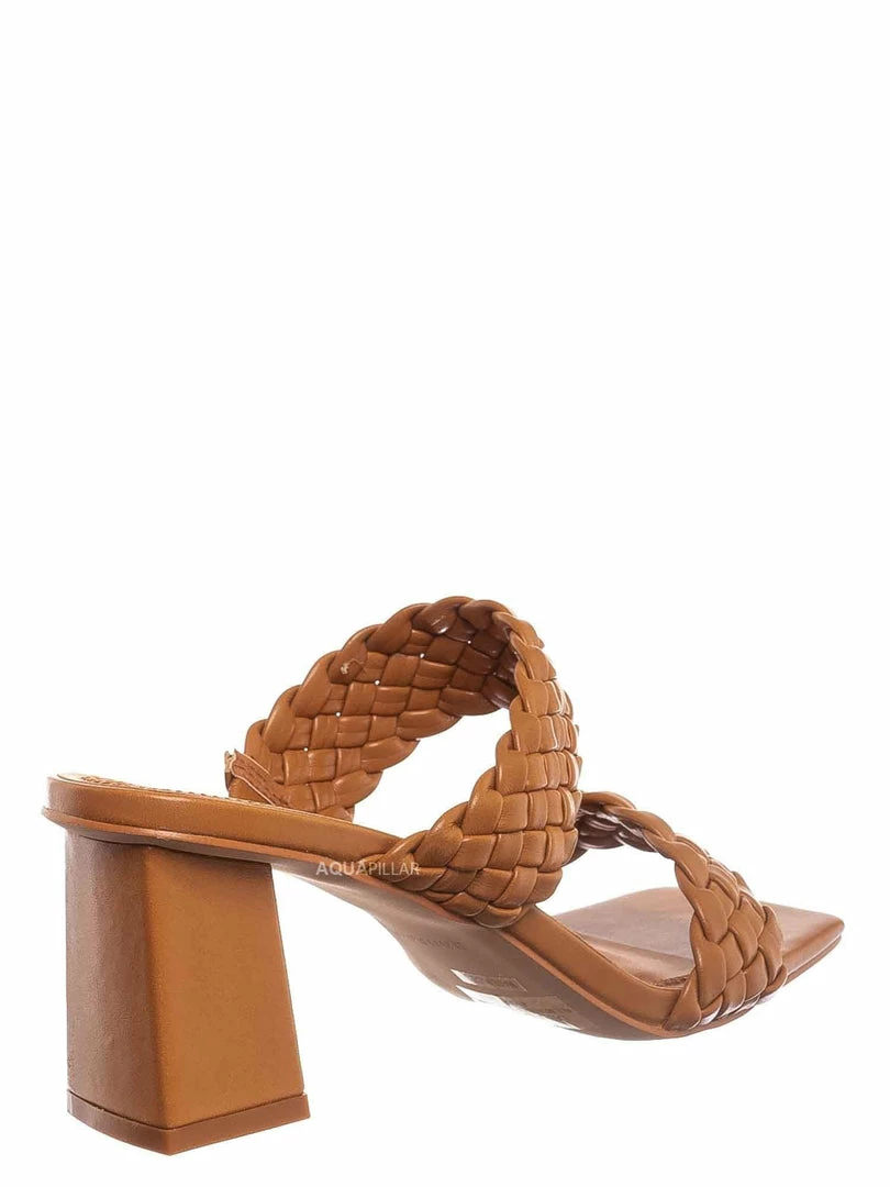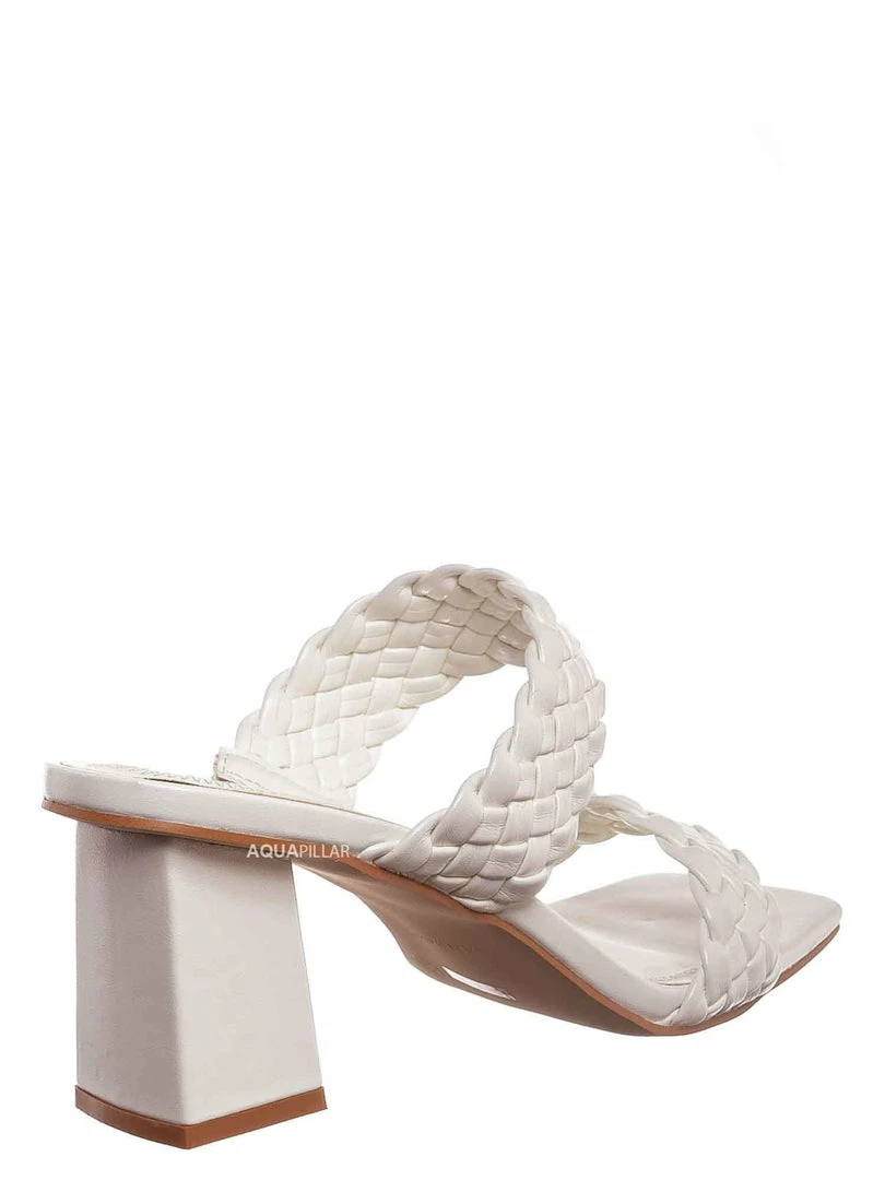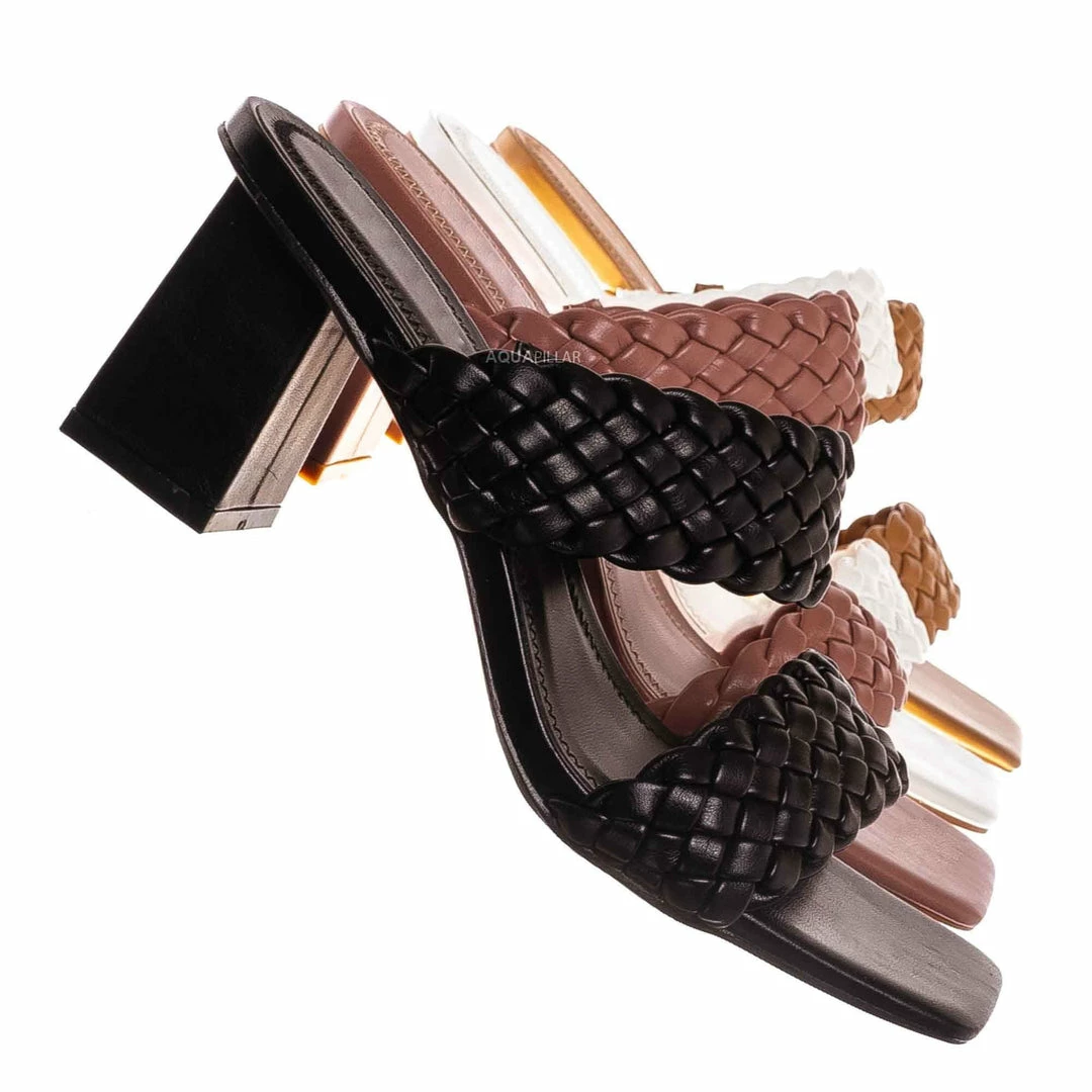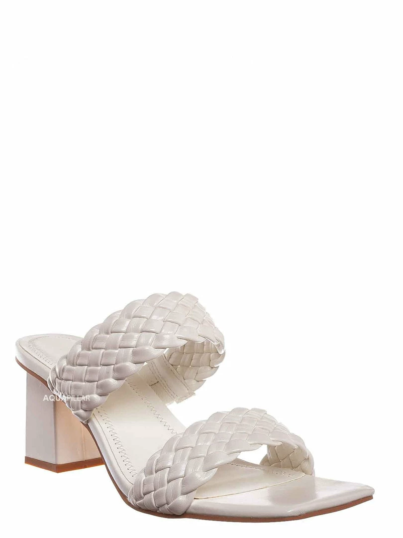 Product Detail: This slide-in slipper features a chunky tapered block heel, open square toe, basket-woven / braided double strap, slide in mule construction and lightly padded insole