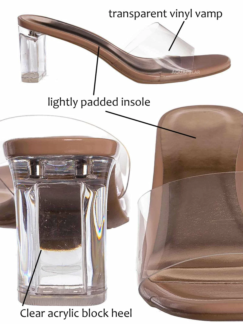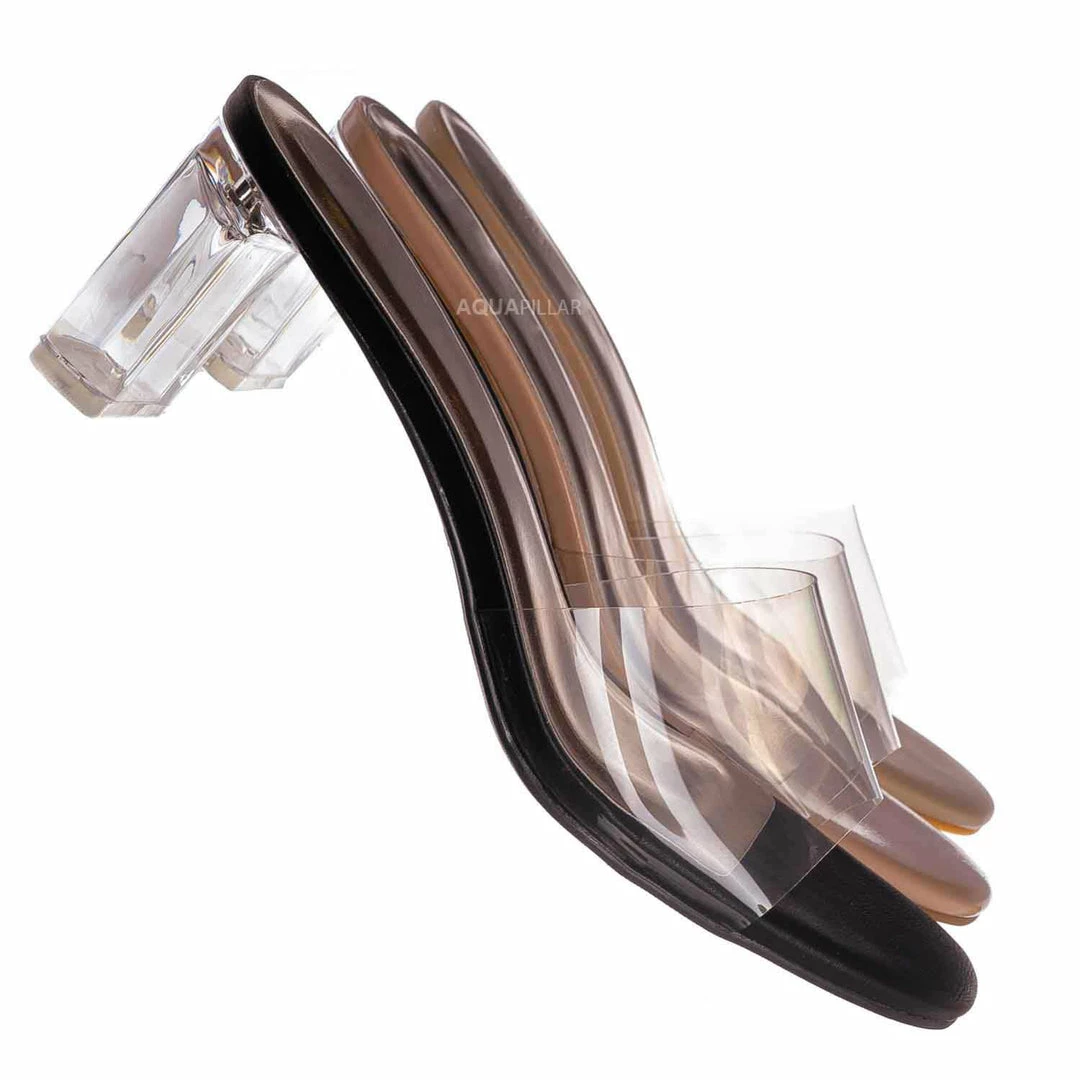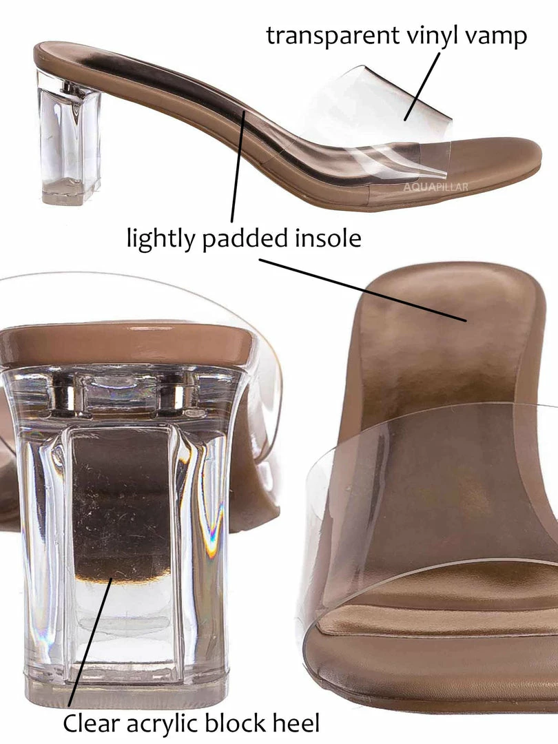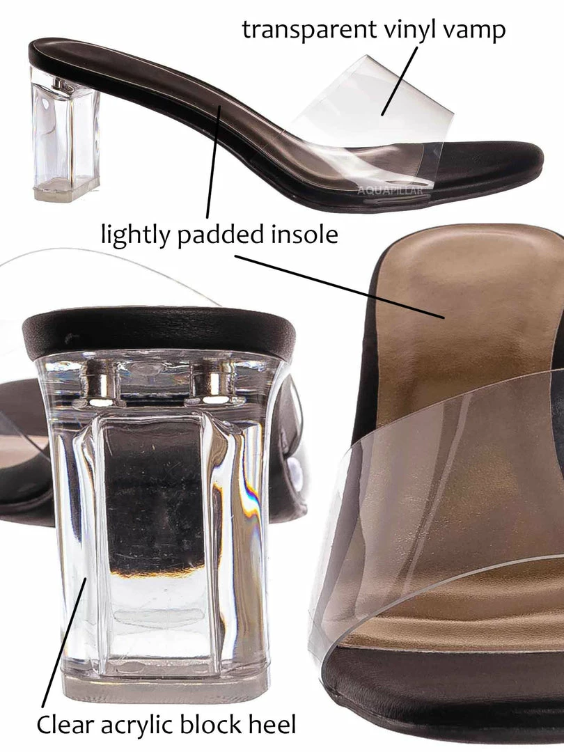 Product Detail : These “glass” slipper features a lightweight acrylic block heel, clear lucite / transparent vinyl vamp and lightly padded insole. These shoes can be easily slide into the open toe mule silhouette. Choose from matted fabric or patent