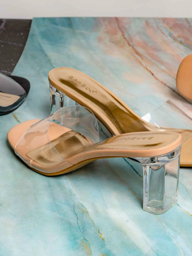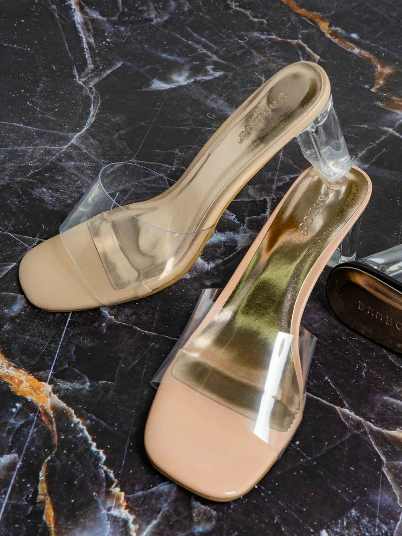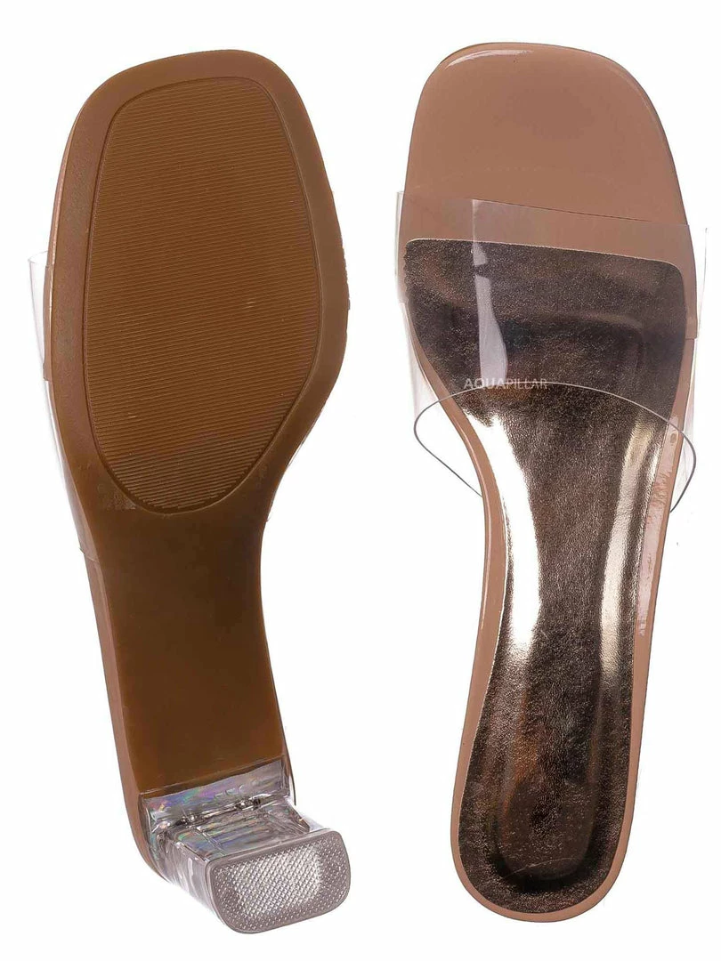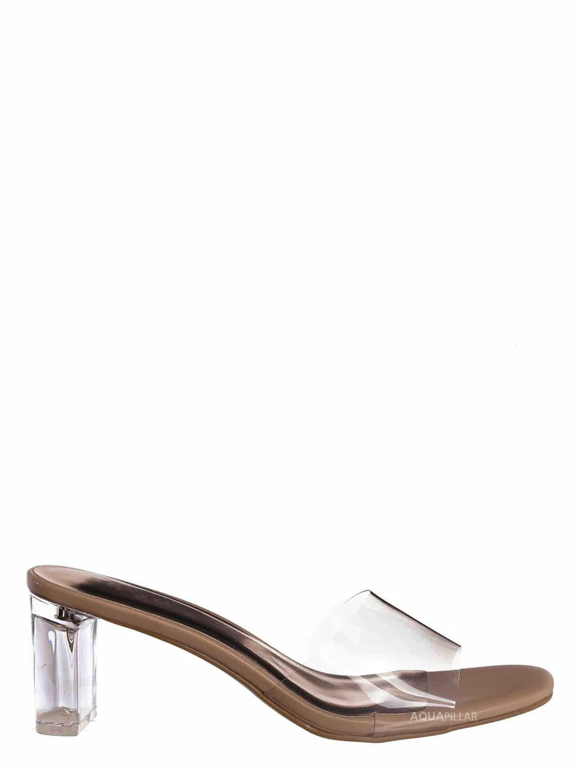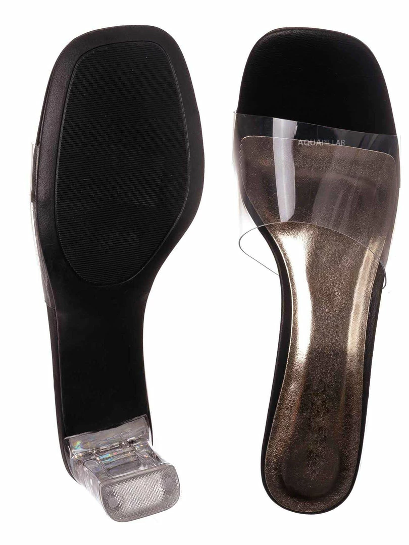 Product Detail : These “glass” slipper features a lightweight acrylic block heel, clear lucite / transparent vinyl vamp and lightly padded insole. These shoes can be easily slide into the open toe mule silhouette. Choose from matted fabric or patent