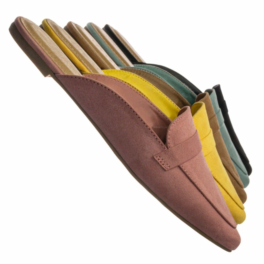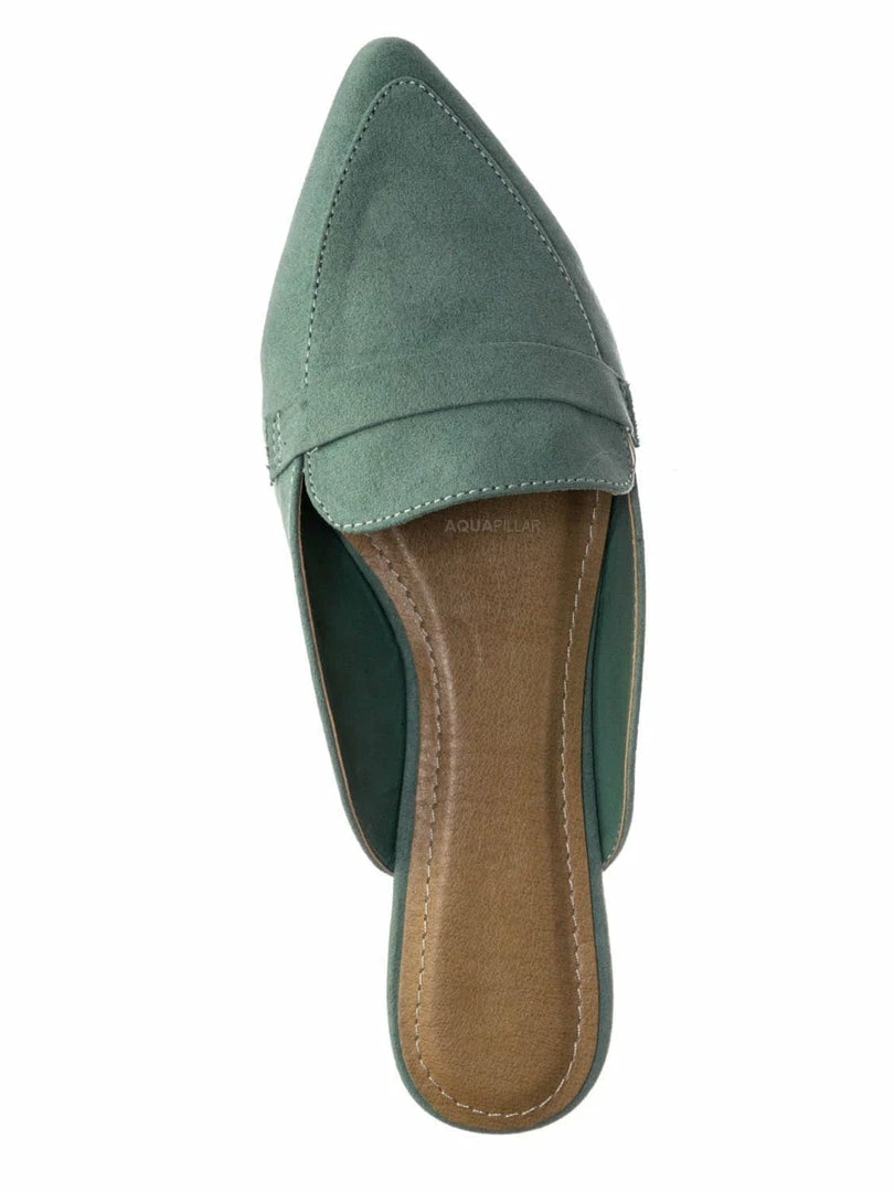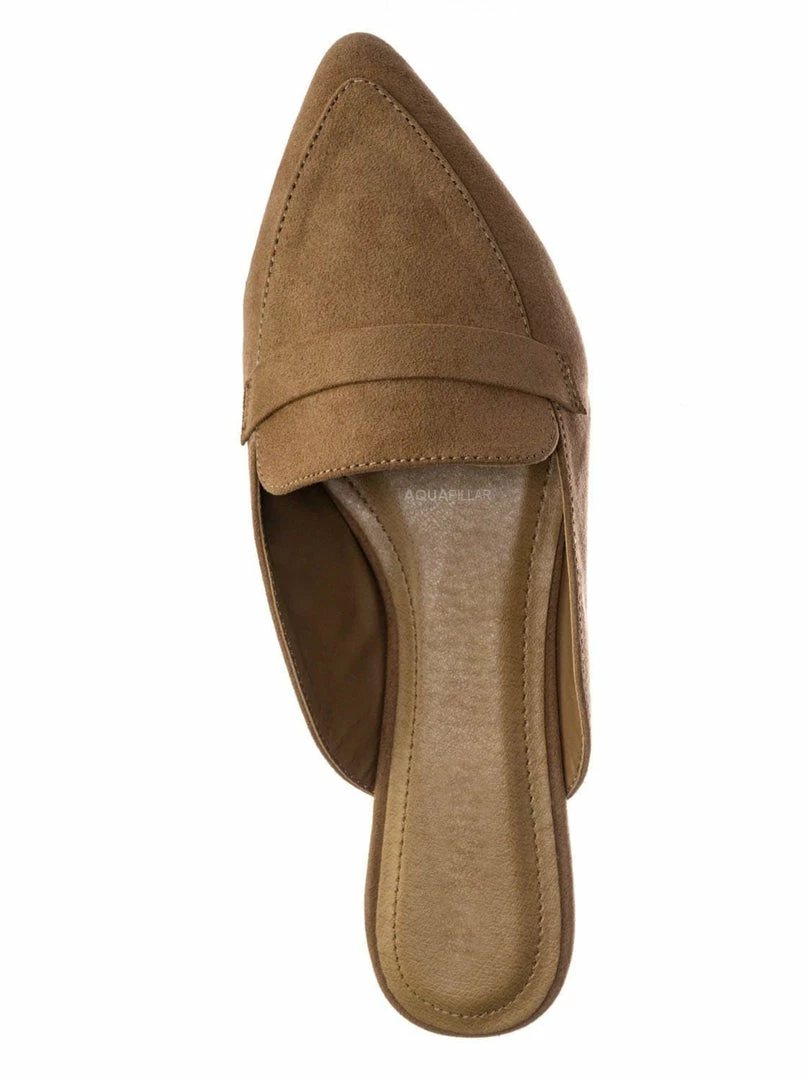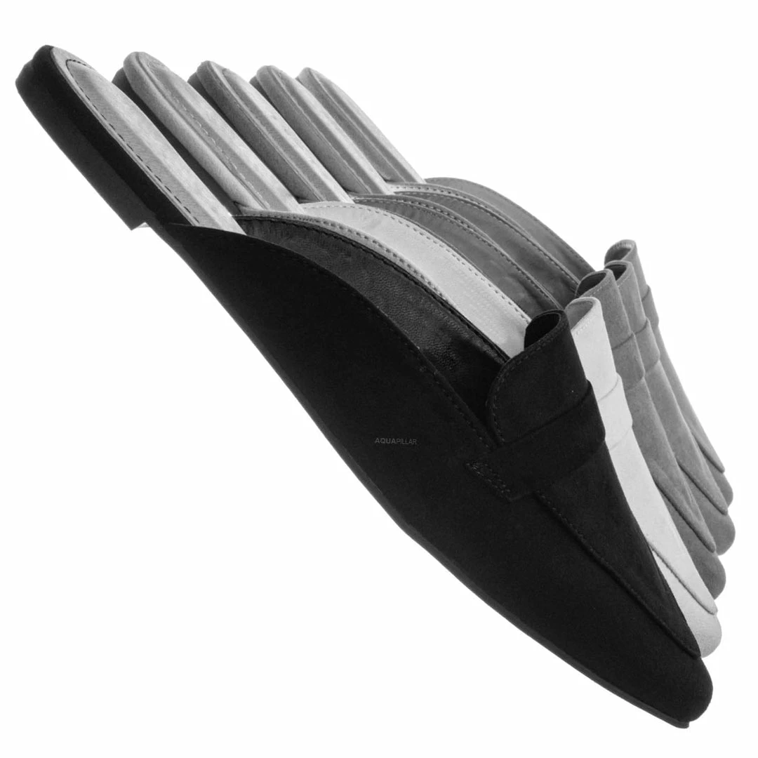 Product Detail : These flats features a pointed closed toe, backless loafer silhoueete, slide in mule construction, parallel cross band oranmentation cross the front of the shoes and lightly padded insole.