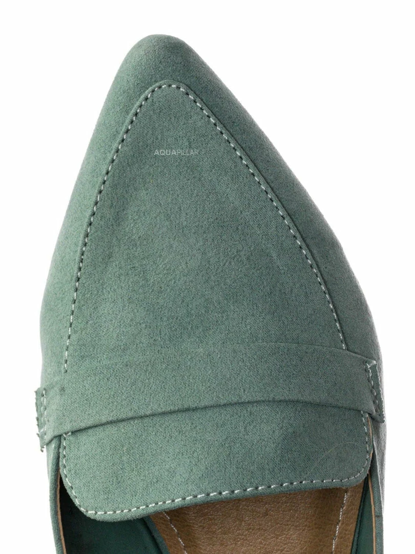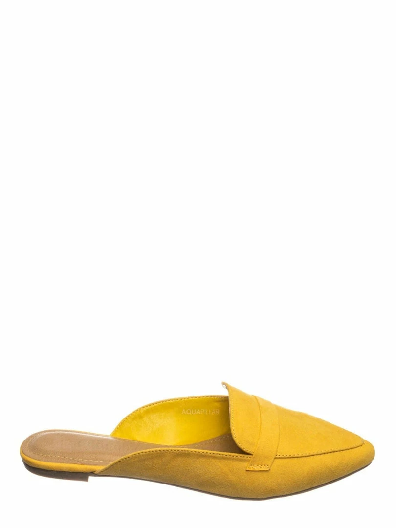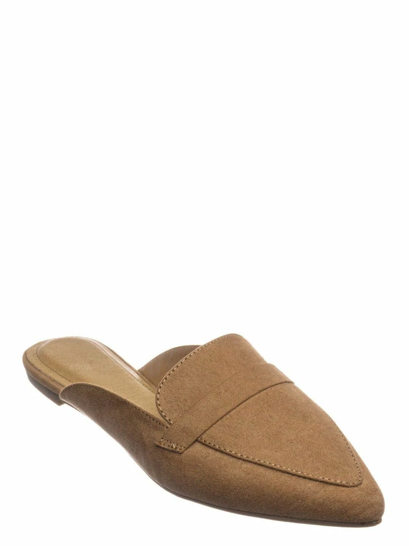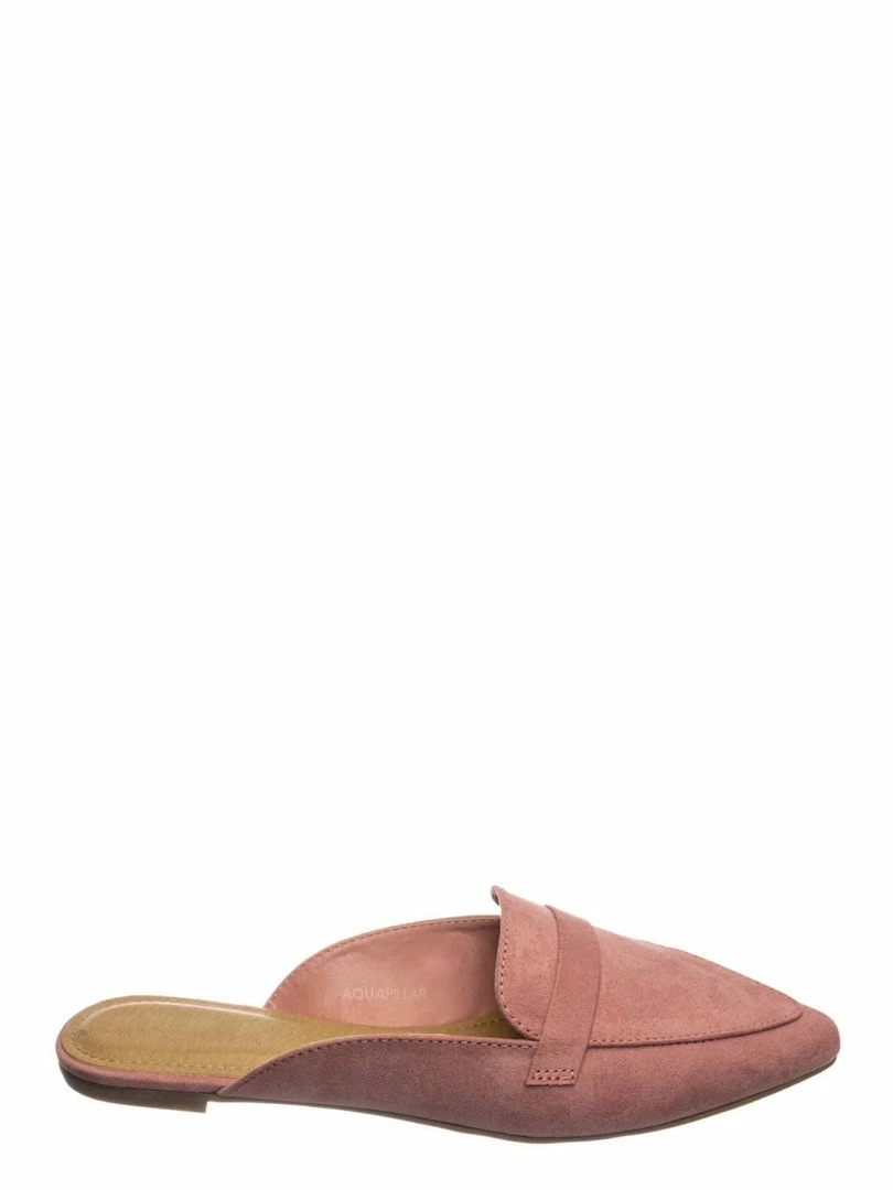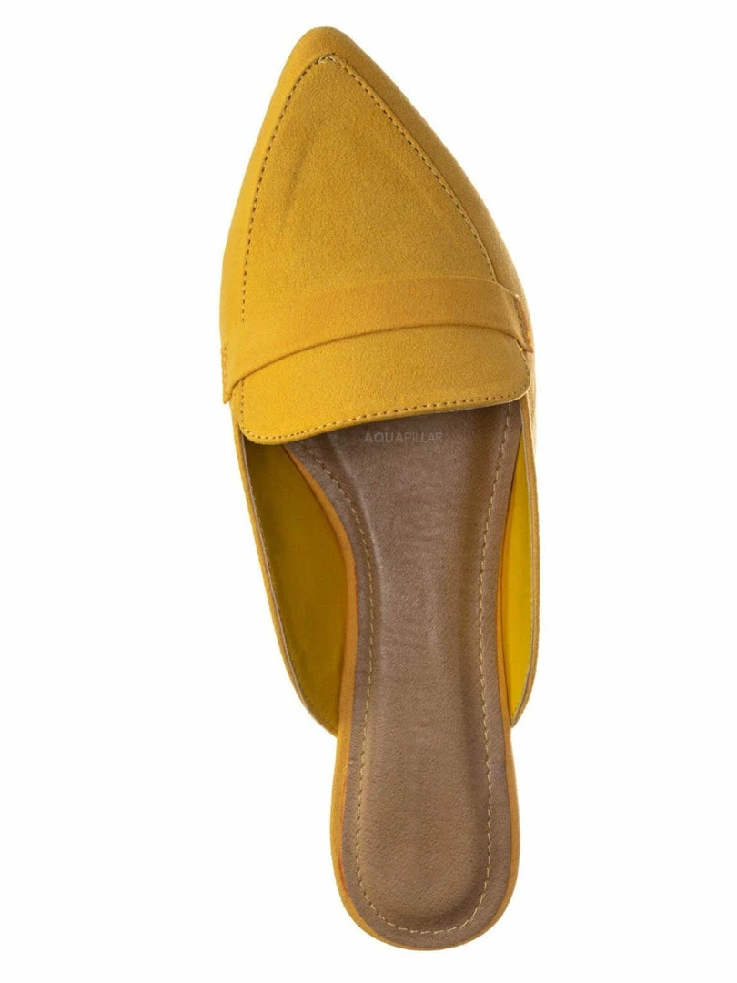 Product Detail : These flats features a pointed closed toe, backless loafer silhoueete, slide in mule construction, parallel cross band oranmentation cross the front of the shoes and lightly padded insole.