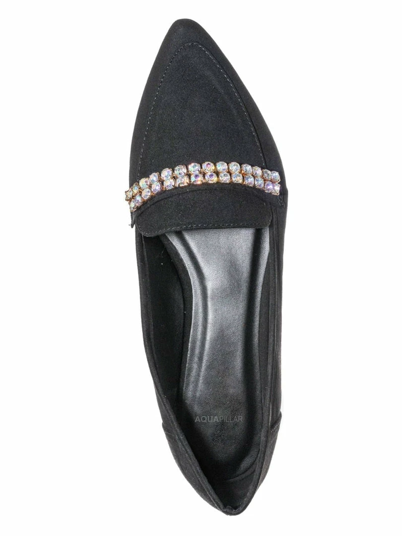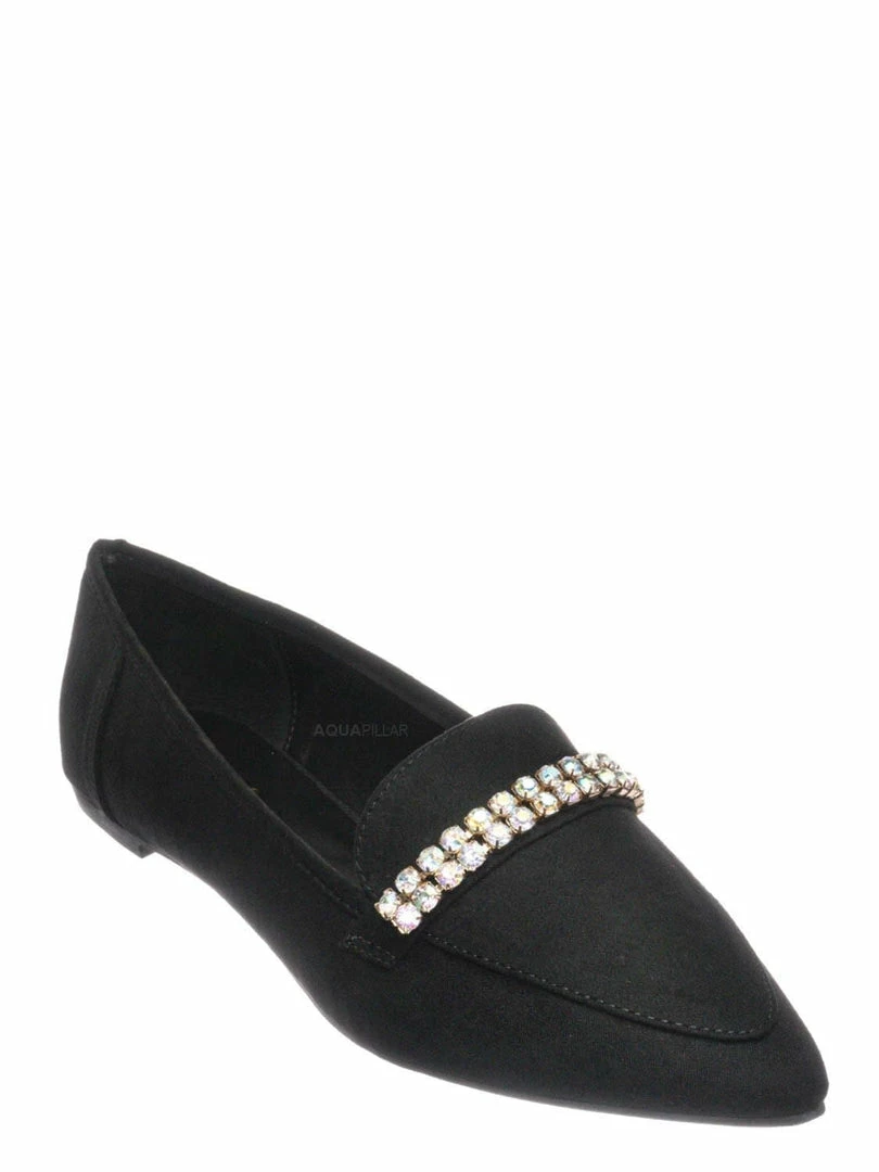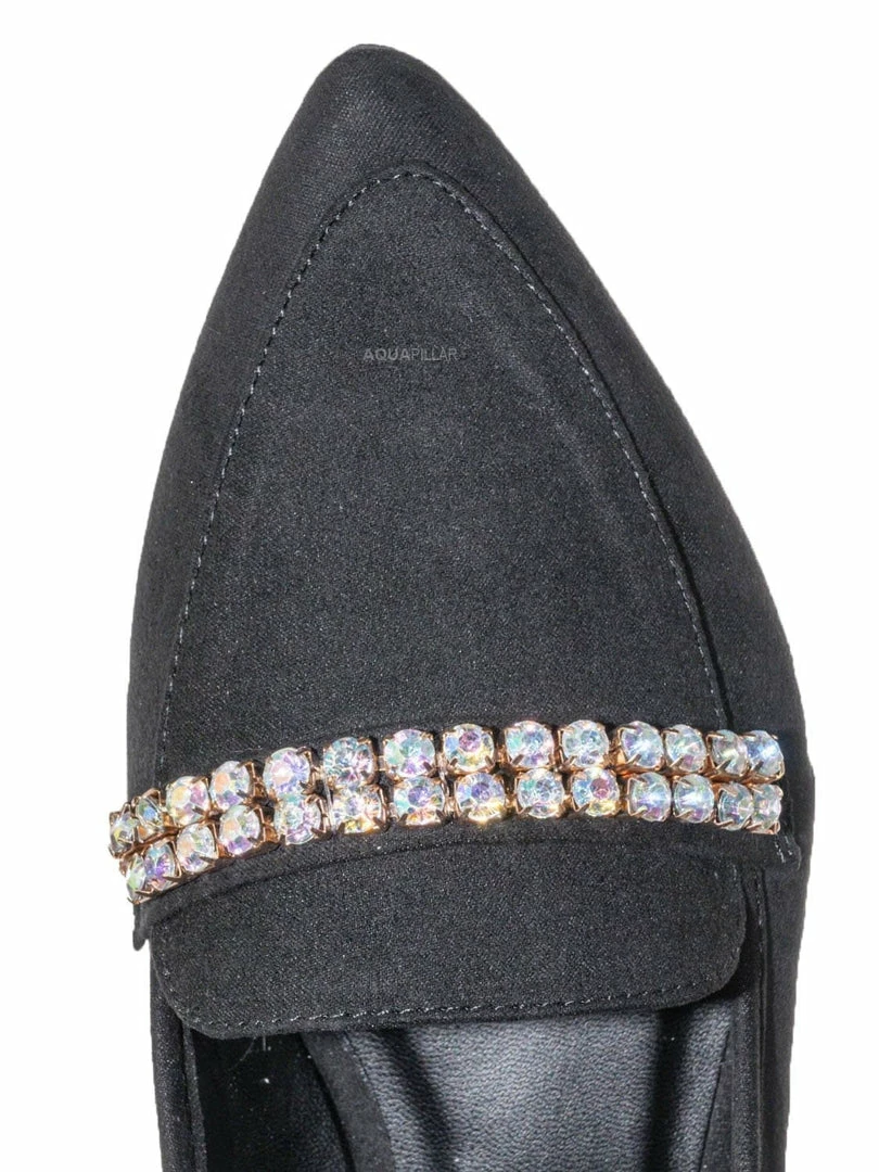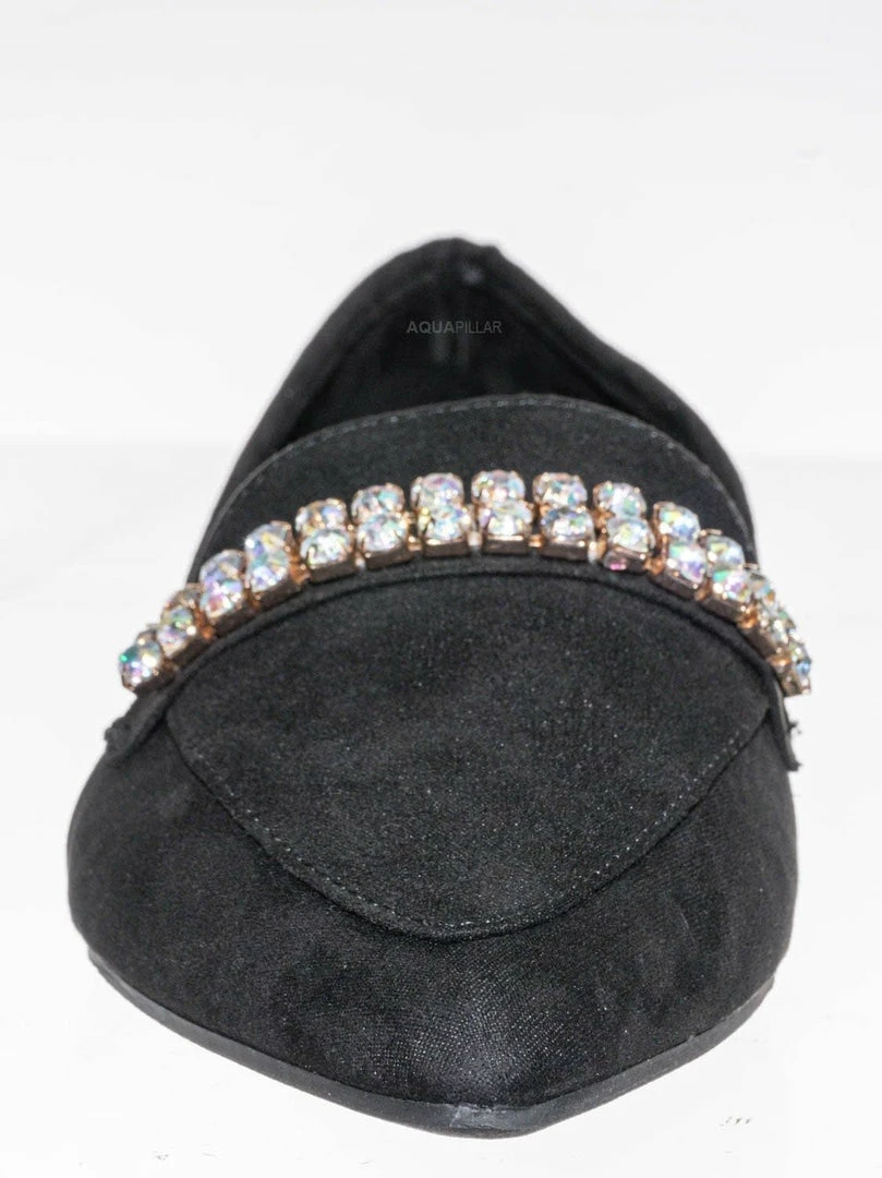 Product Detail :These flats features a classic loafer silhouette, notched collar, double rhinestone band embellished across the front, pointed close toe and lightly padded insole.