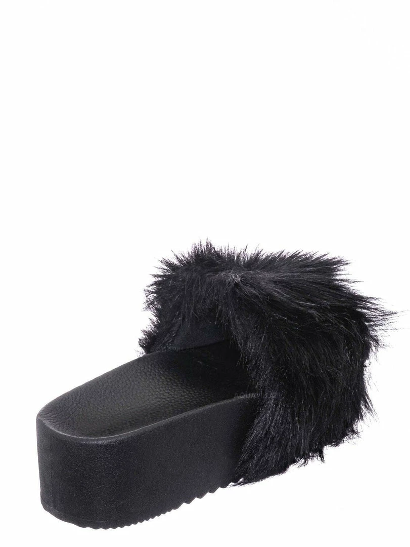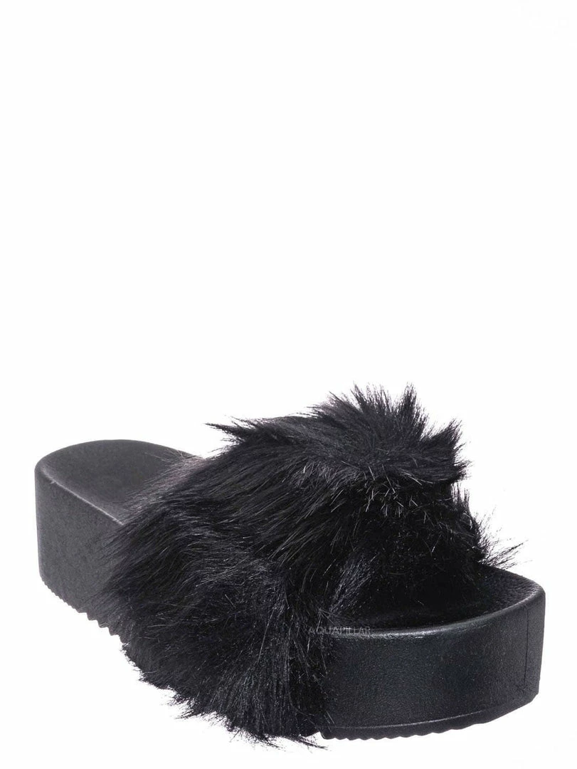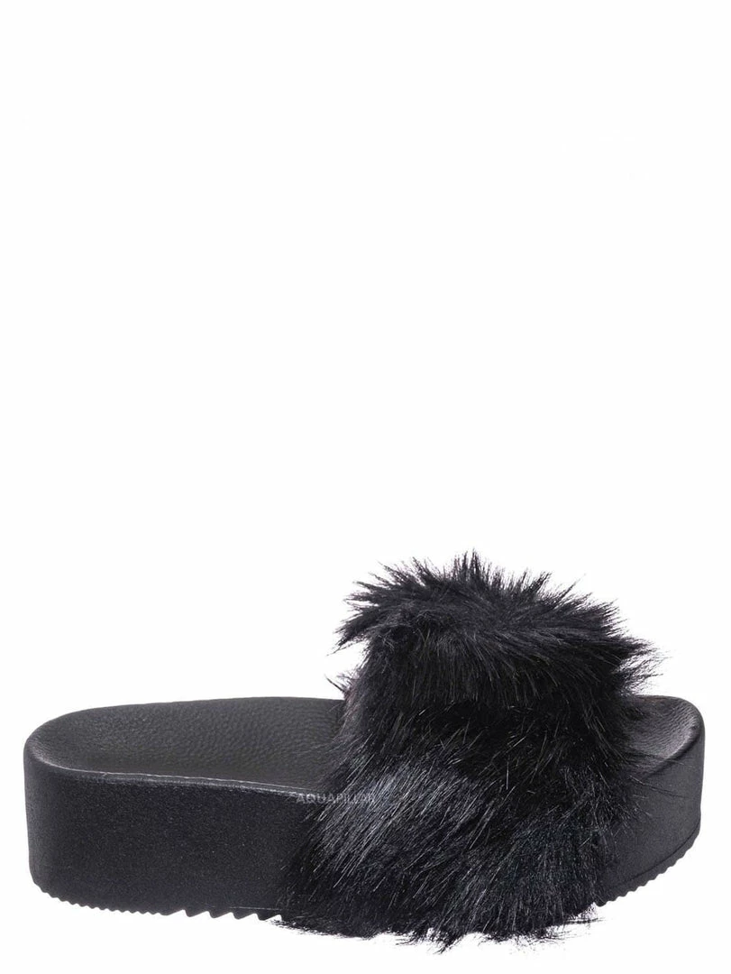 Benefits : Be comfy in these super thick platform slides with vegan friend faux fur topping.