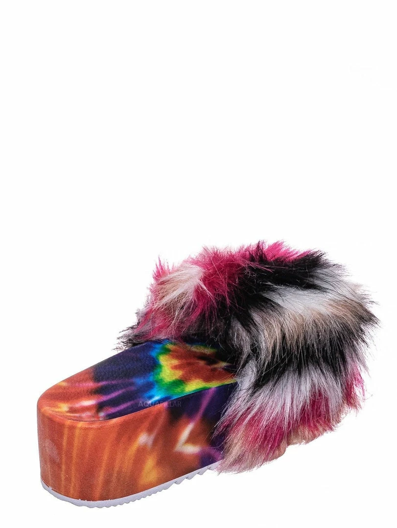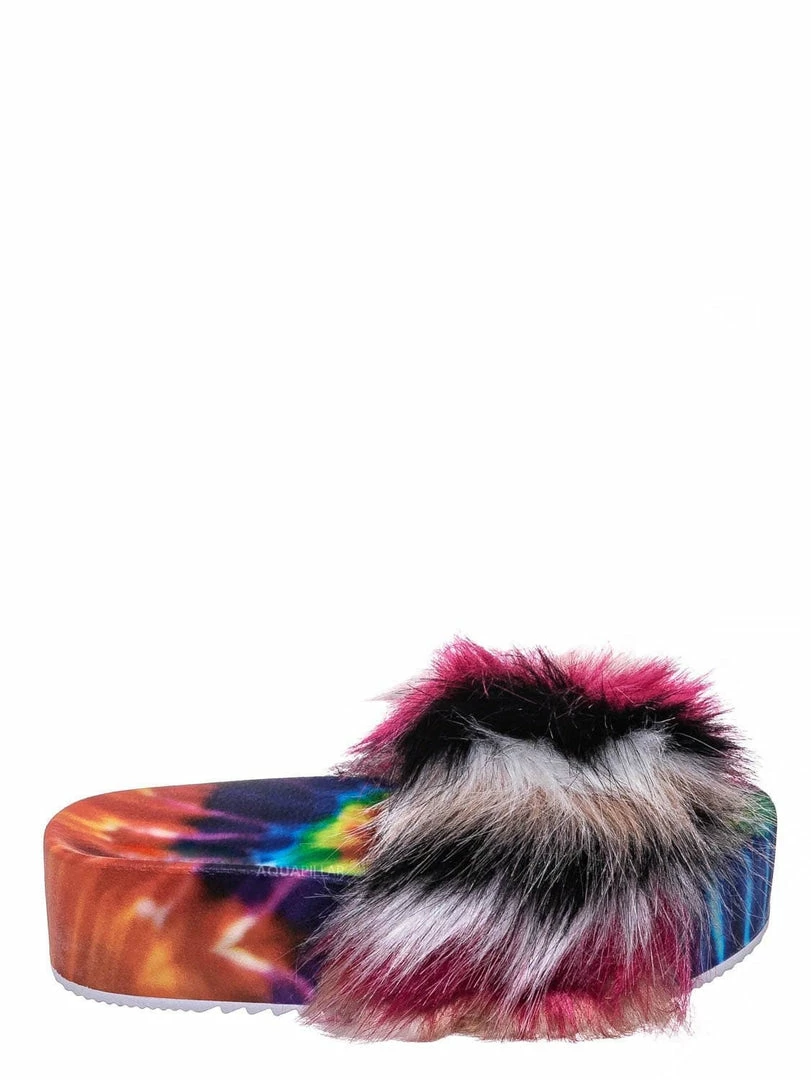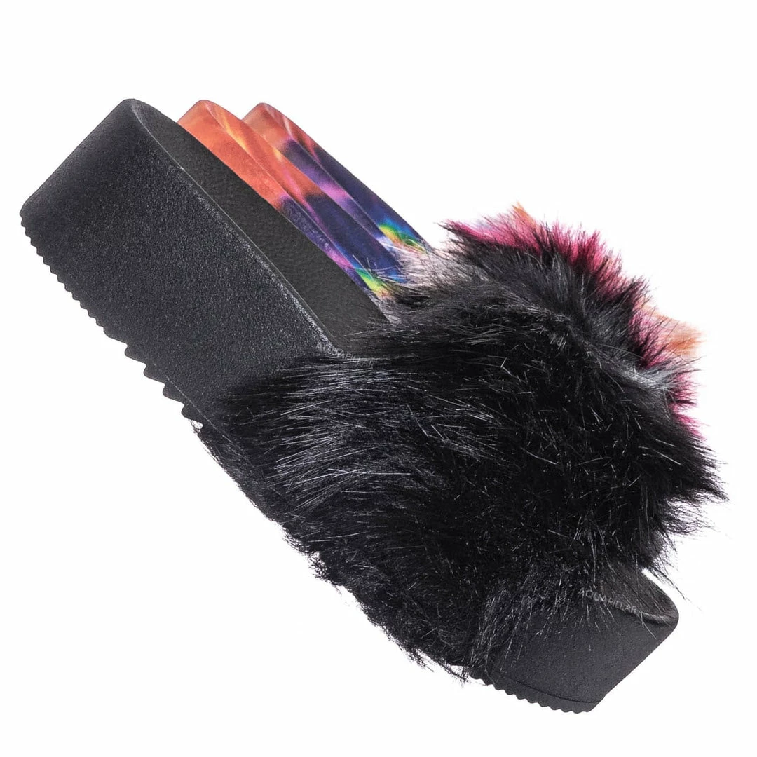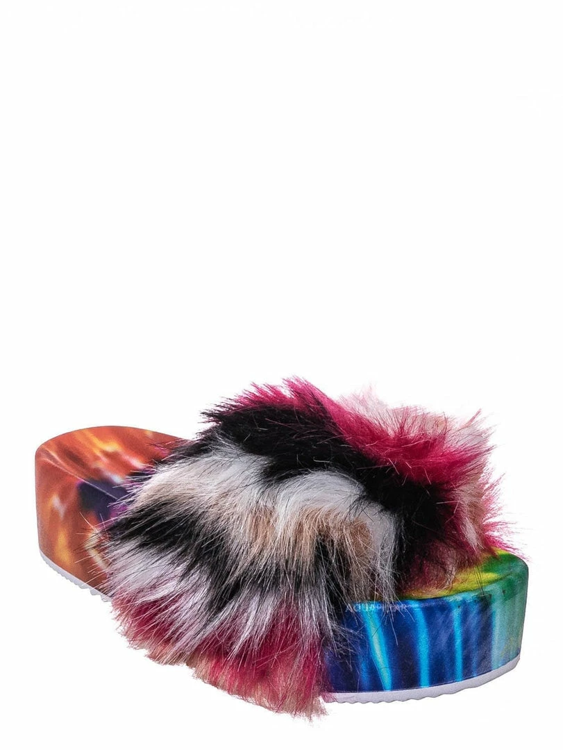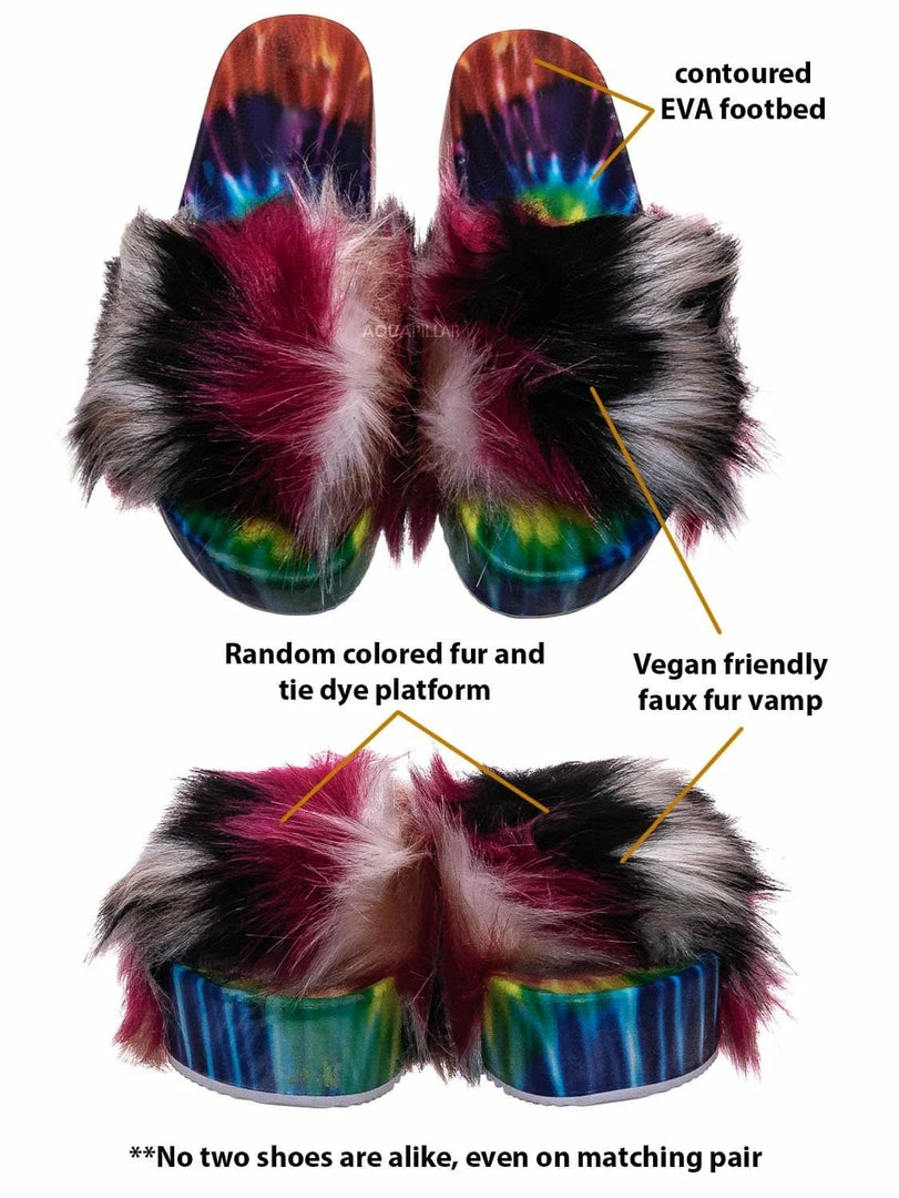 Product Detail : These sandals features a comfy thick foam platform, contoured molded footbed insole, slide in construction, vegan friendly synthetic fur vamp. Choose from solid color or tie dye or solid color. The tie dye is completely random, no two pair are alike even on matching pair.