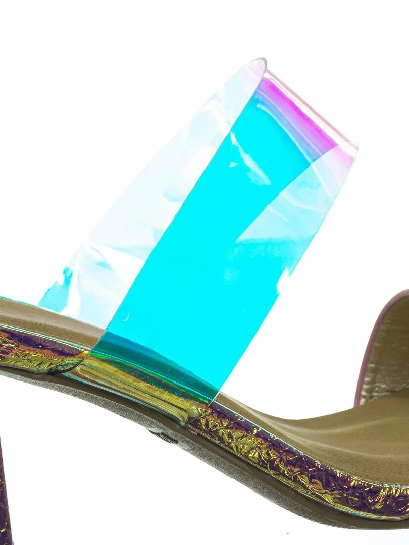 Product Detail : These mule heel sandals features a chunky mid height heel, double strap transparent/clear design, color changing iridescent see through fabric, man made sole and lightly padded insoles.