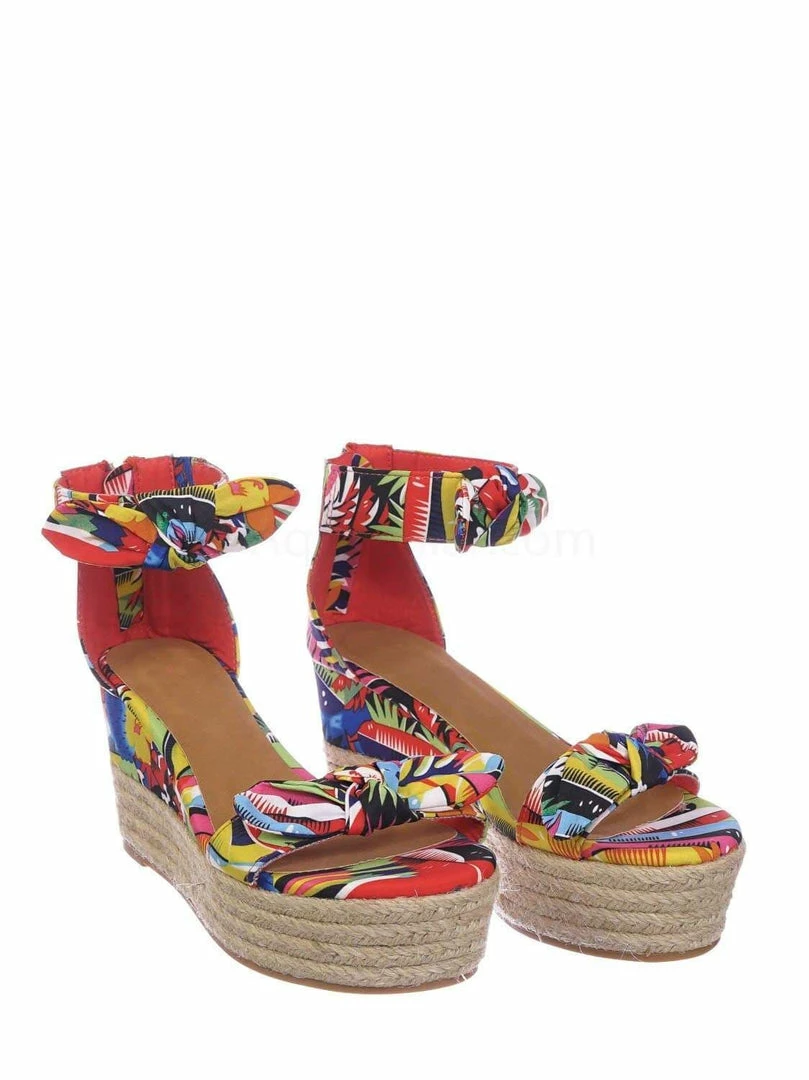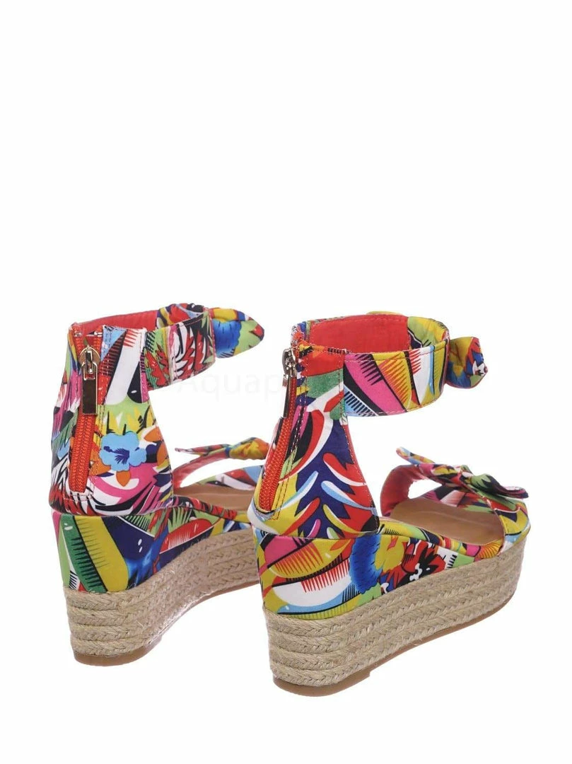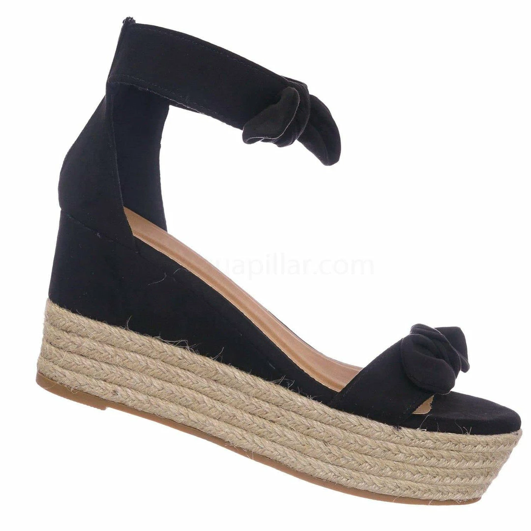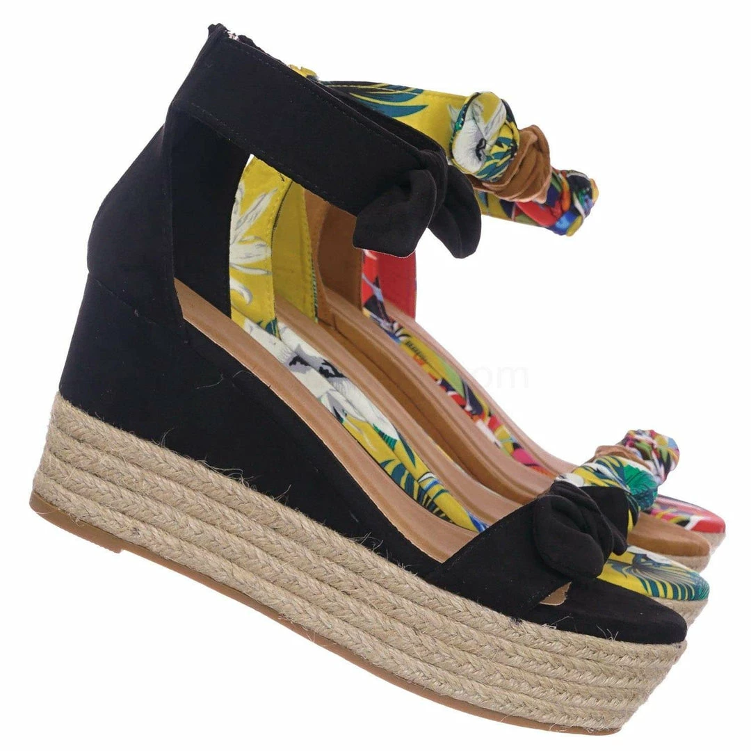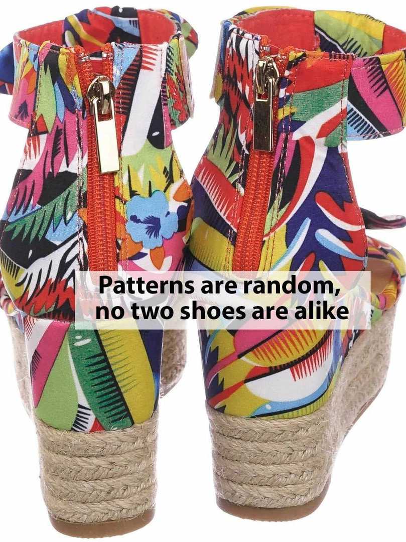 Product Detail : These sandals features a thick espadrille jute braided wrapped platform, low wedge, canvas or faux suede upper, bow ornamentation on foot strap and ankle strap, lightly elastic ankle strap, closed heel counter, zipper closure and lightly padded insole. Choose from solid or floral prints, the floral prints are not symmetrical, it’s randomly distribute so what you get will not look like the photo.