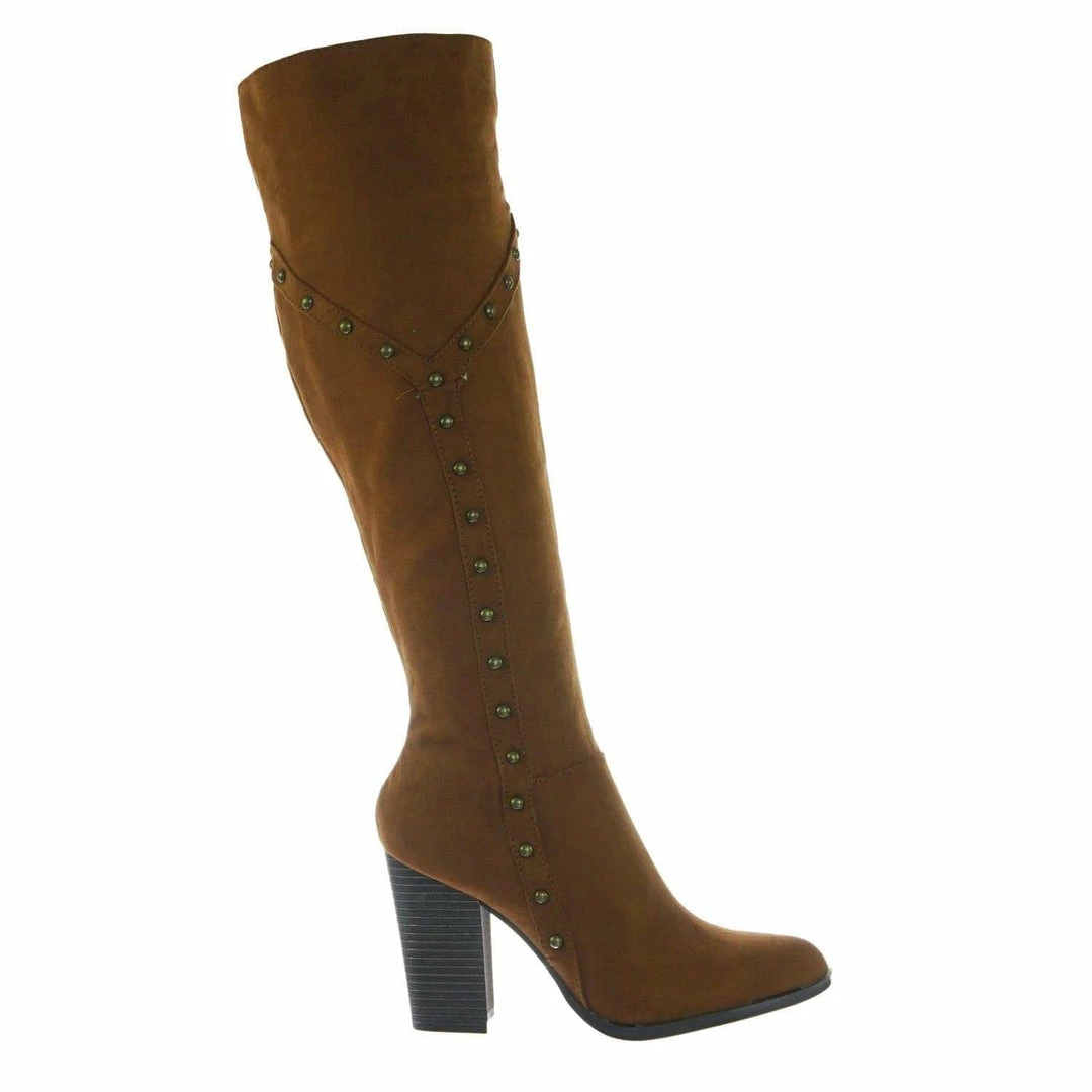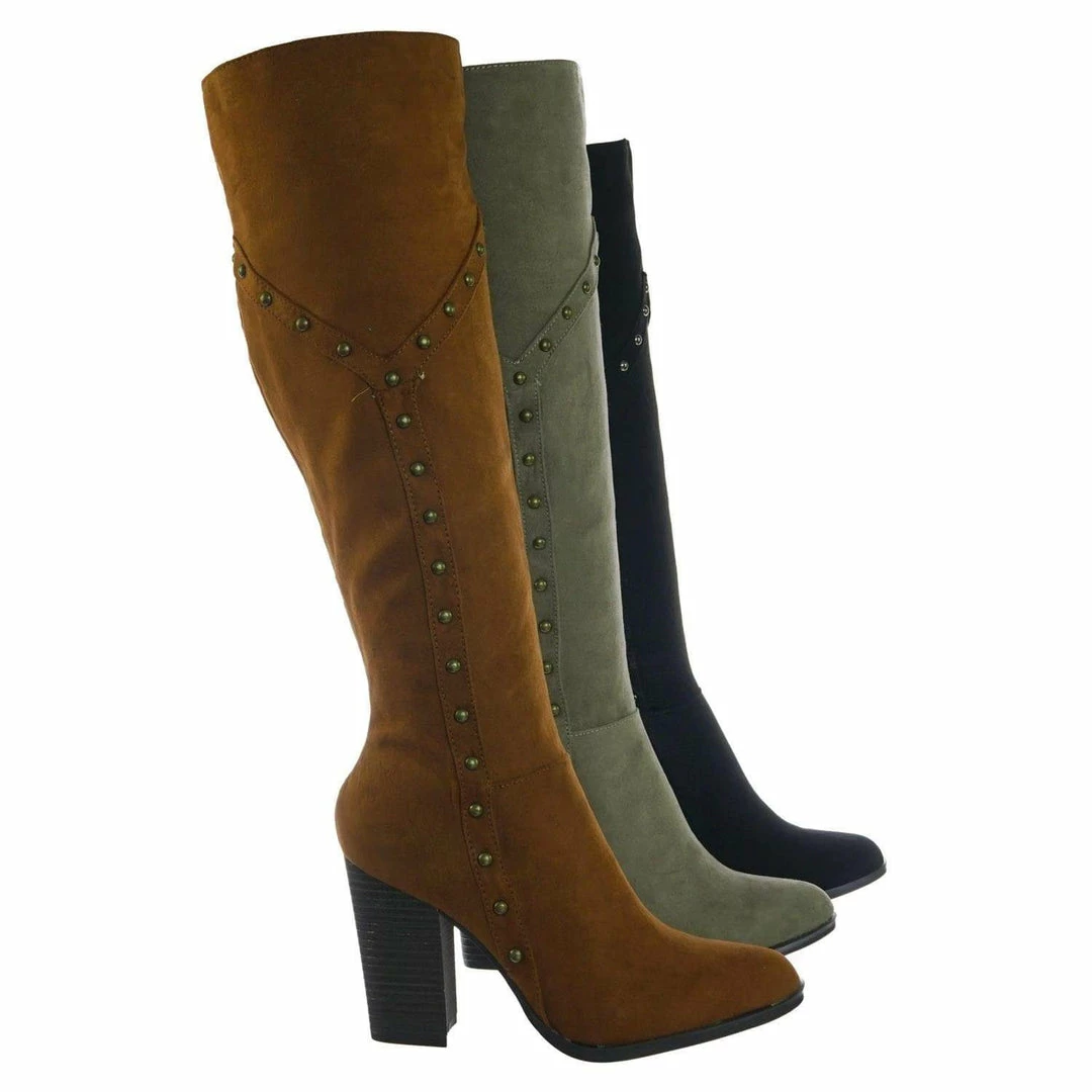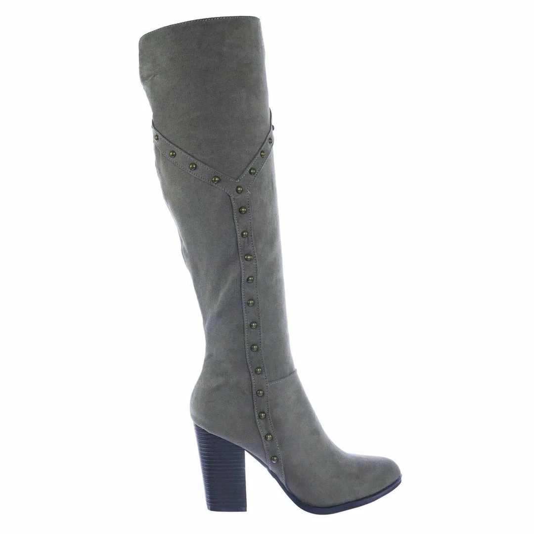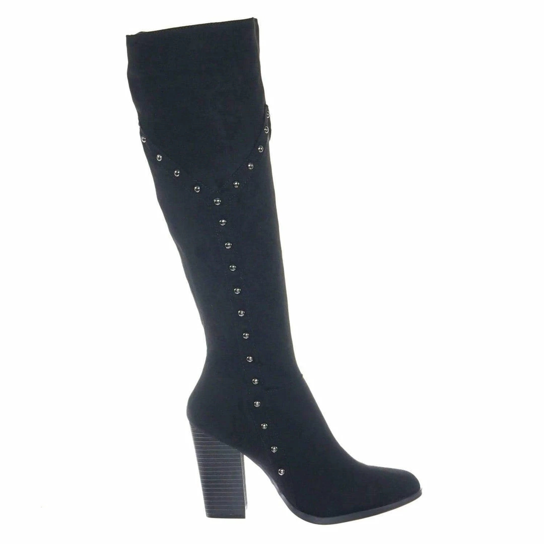 Bamboo New Showcase06 Faux Fur Lining Antique Metal Stud Detail, Knee High Stack Block Heel