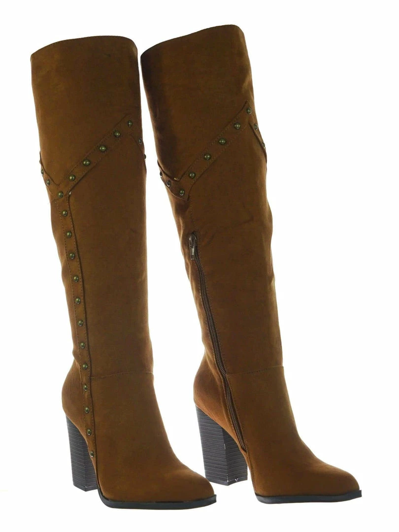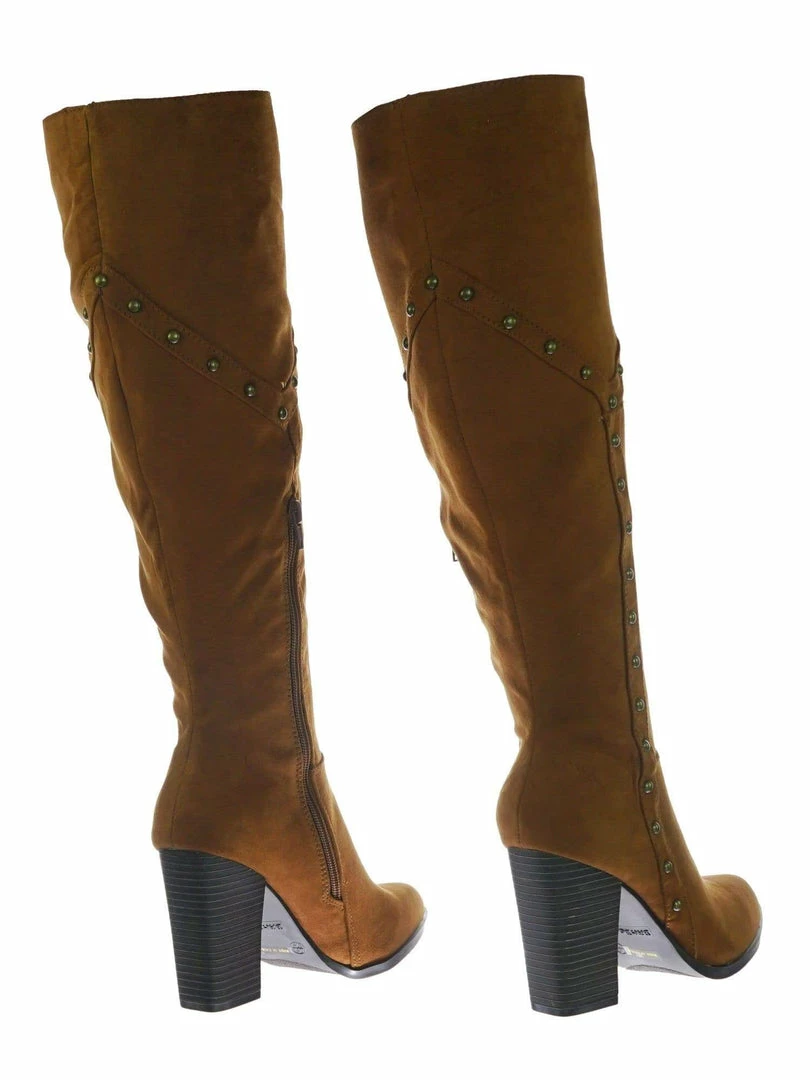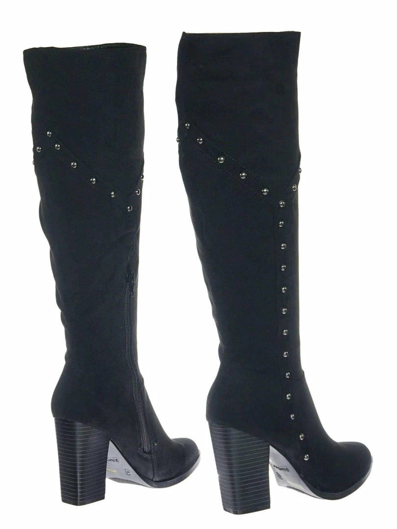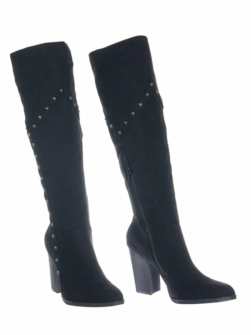 Be the first to review “Bamboo New Showcase06 Faux Fur Lining Antique Metal Stud Detail, Knee High Stack Block Heel” Cancel reply