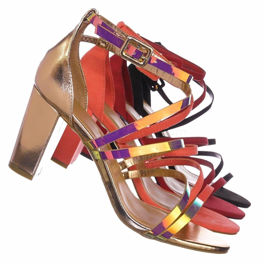 Product Detail : These heel sandals features a chunky block high heel, gladiator inspired cross strap silhouette, adjustable ankle strap, closed heel counter and lightly padded insole. Choose from solid color or “unicorn” hologram, these change color depending on the light and view angle.