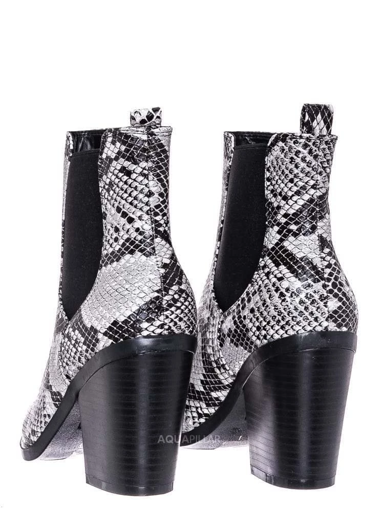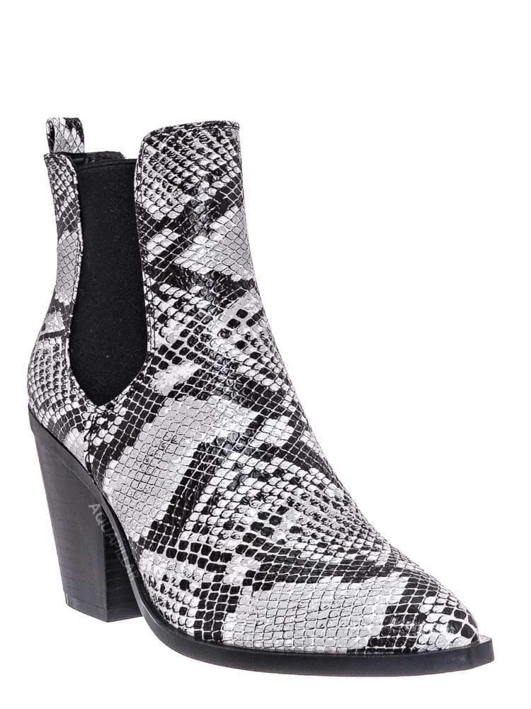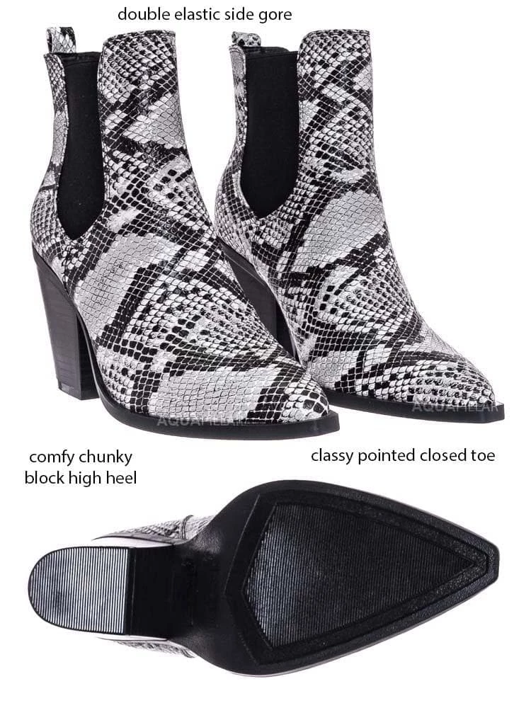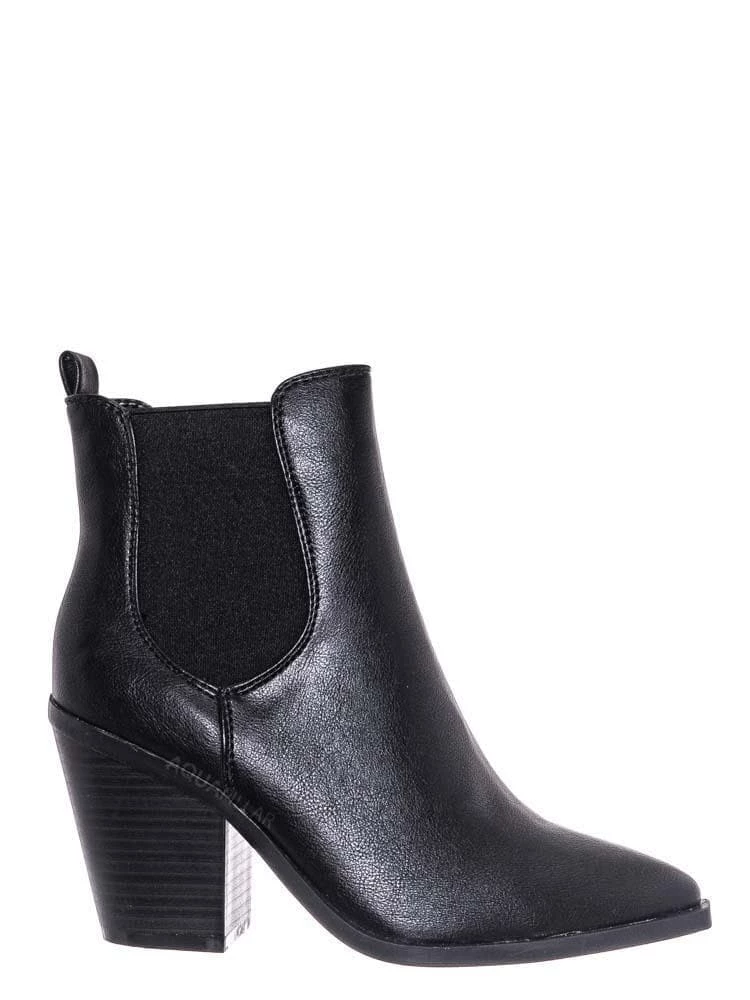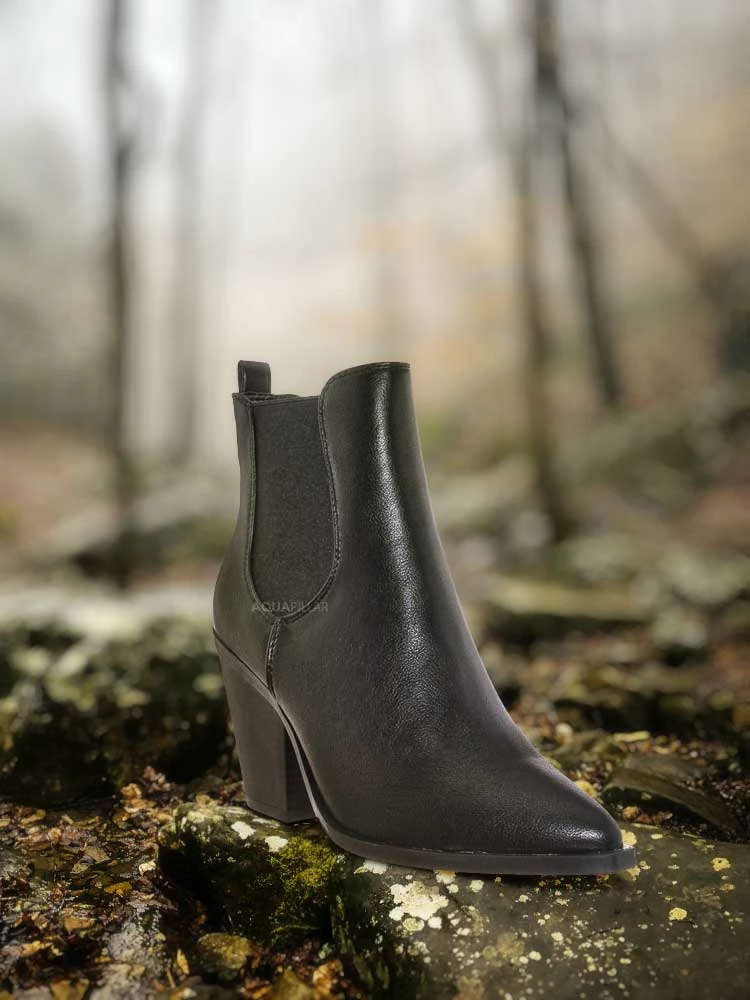 Product Detail : These ankle booties features a classic Chelsea boots silhouette, stretchy / elastic side gore, chunky high stack heel, pointed close toe, rear pull tab, ankle height shaft and lightly padded insole