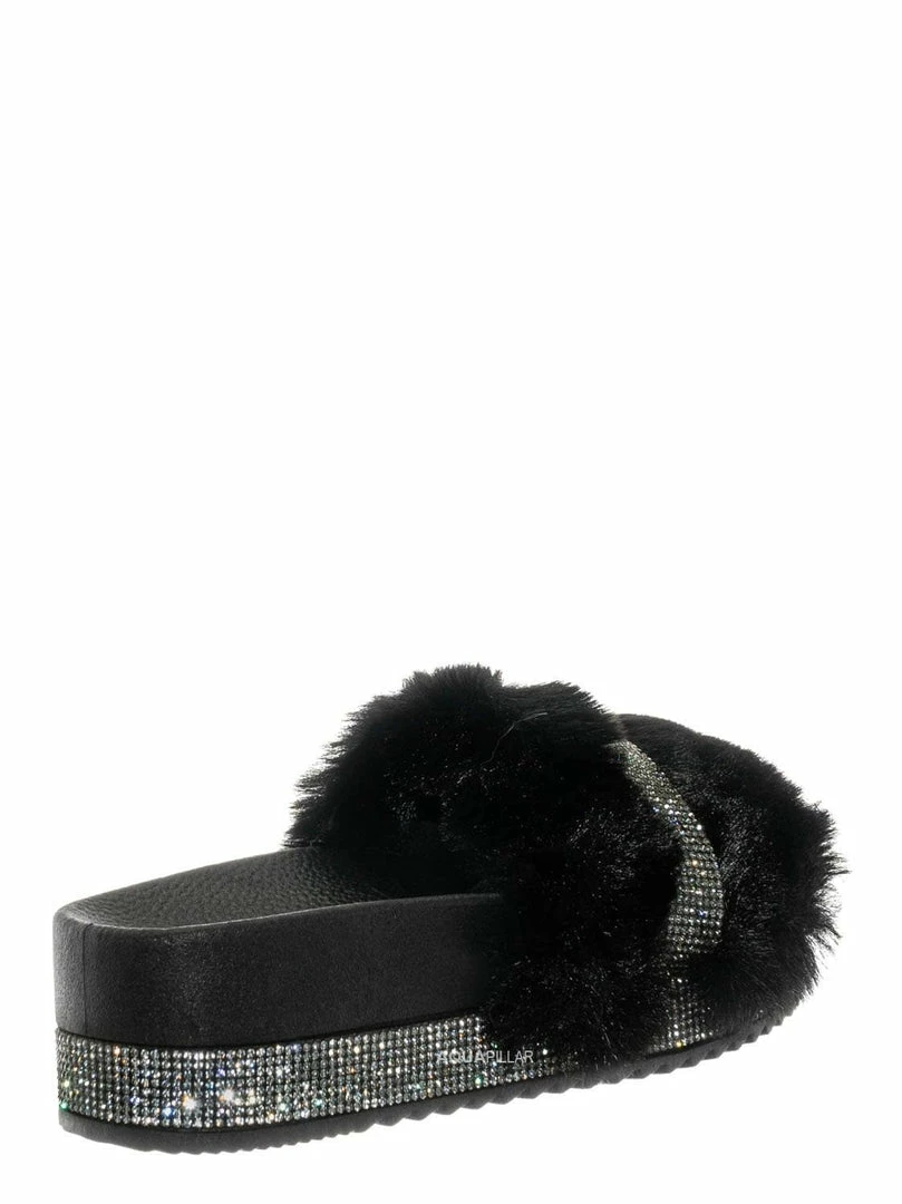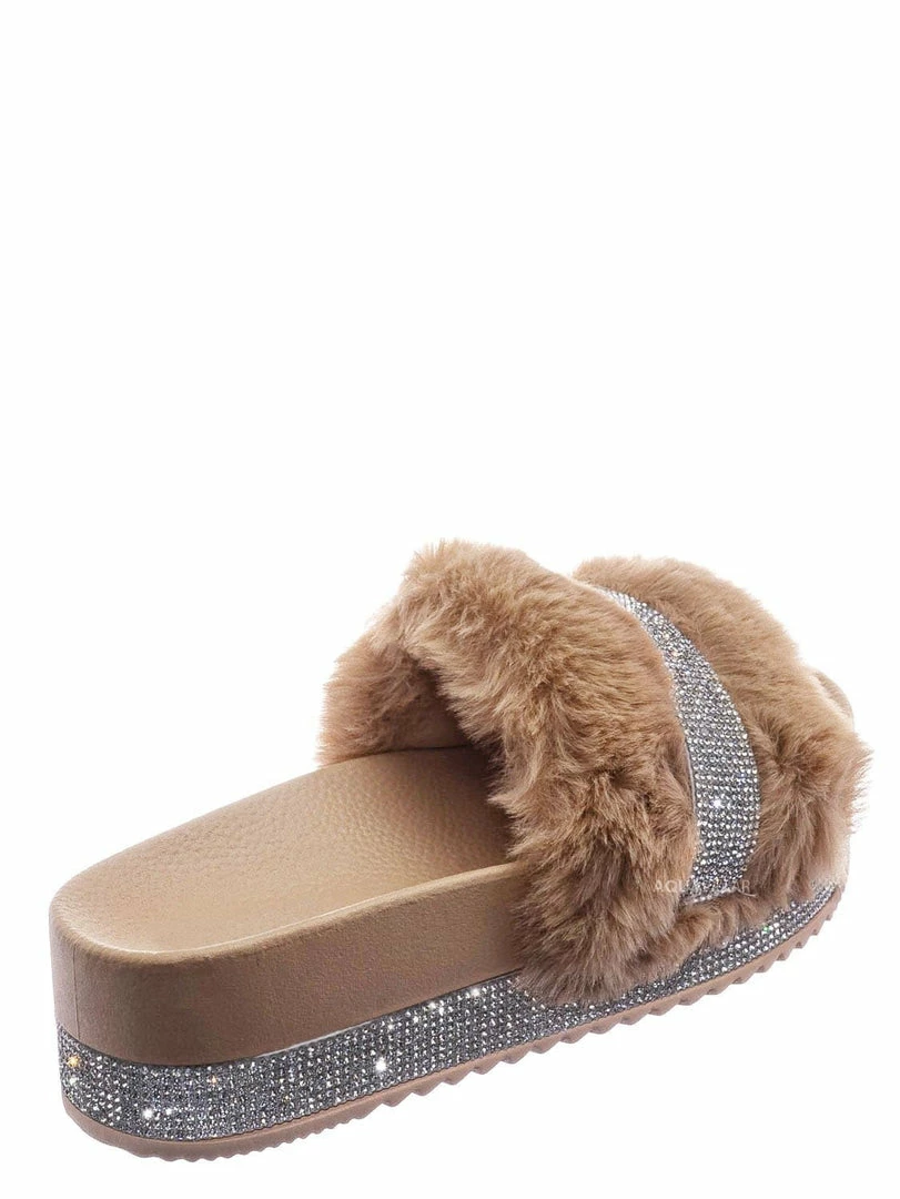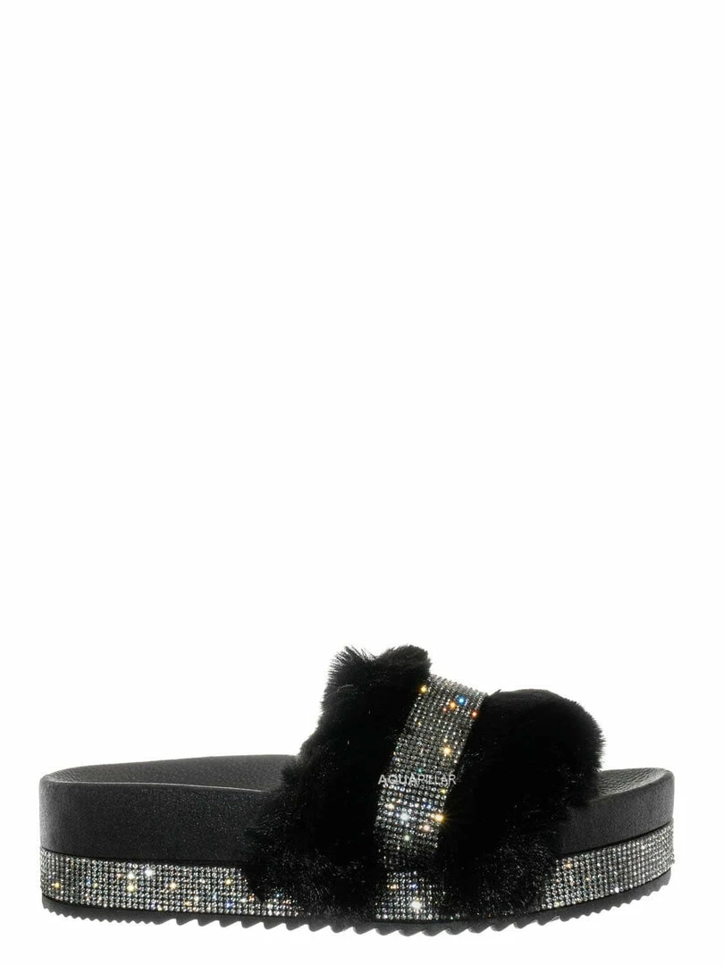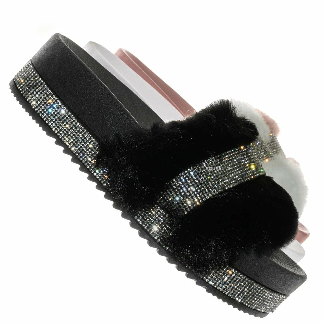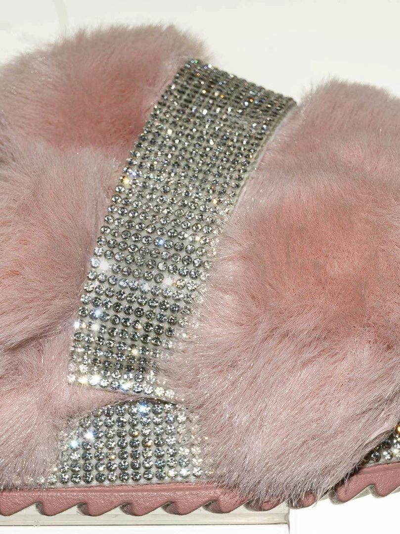 Product Detail : These furry slides features a soft comfy molded footbed, faux fur and rhinestone embellished wide band, thick rubber platform, threaded outsole, rhinestone crystal encrusted platform, slide in construction and lightly padded insole.