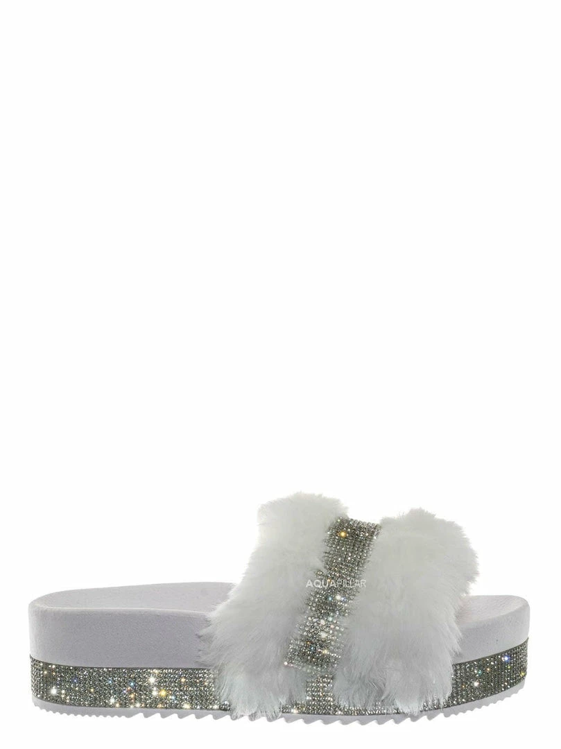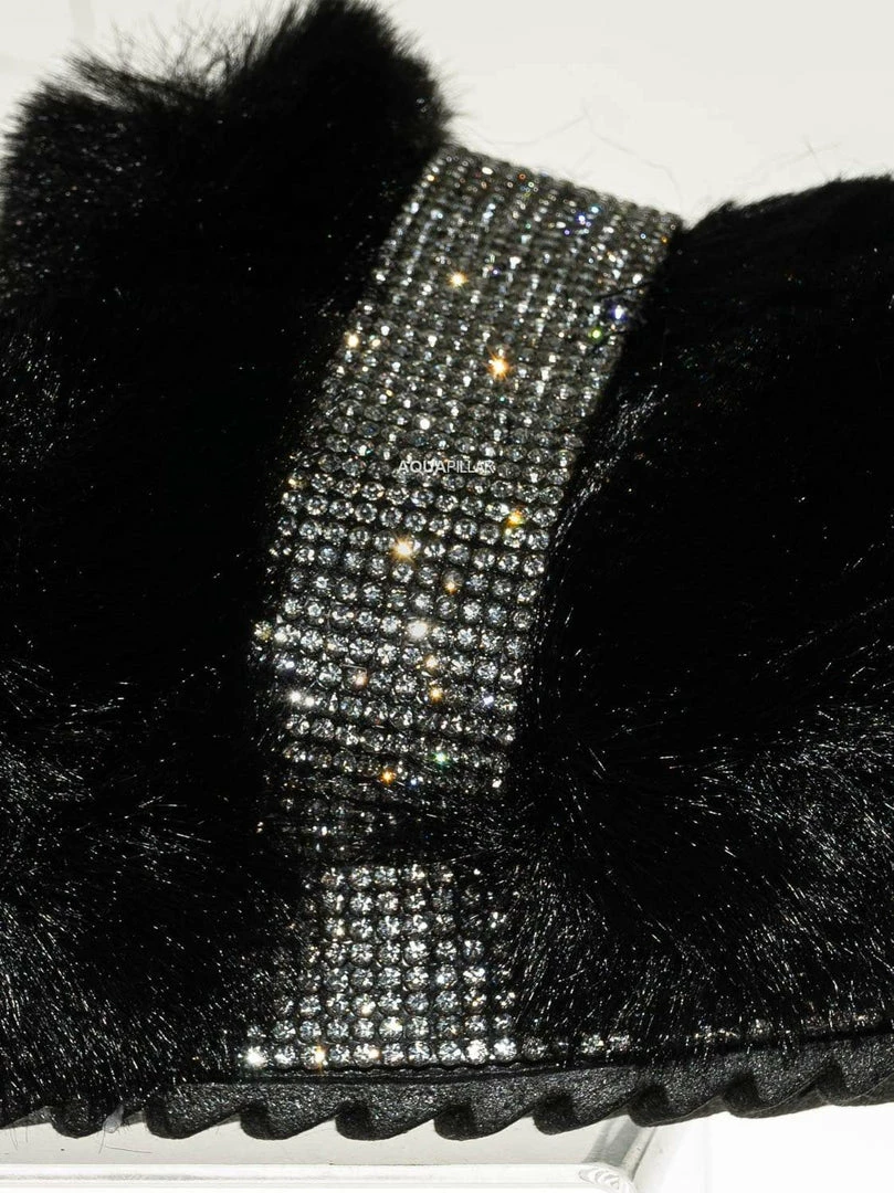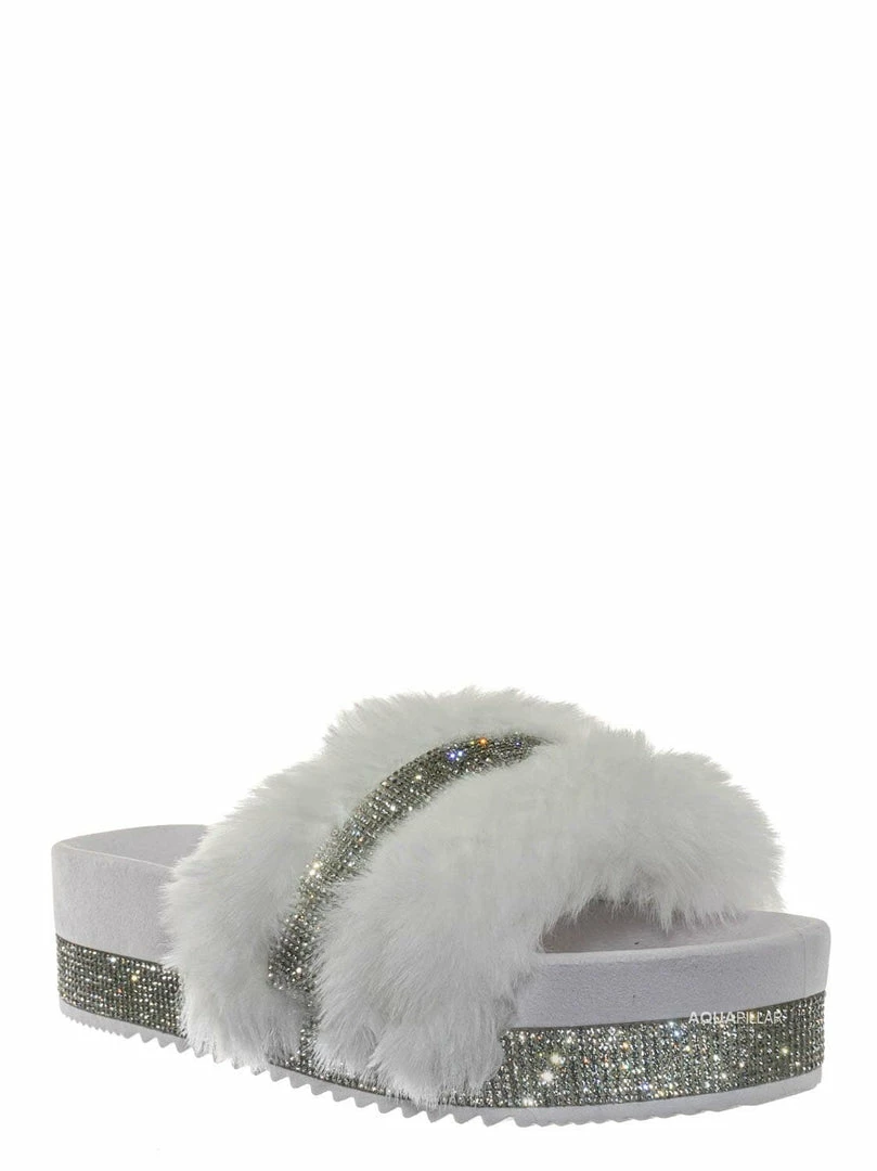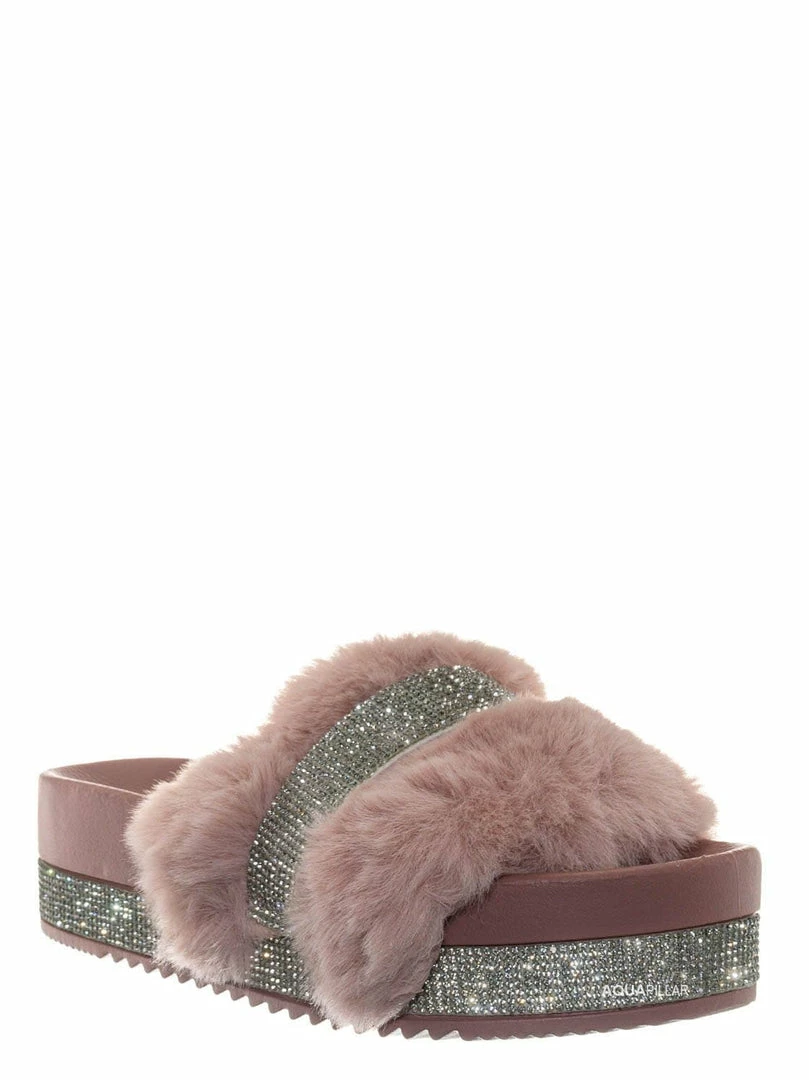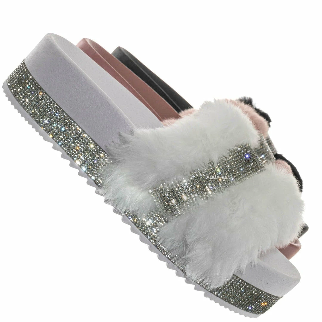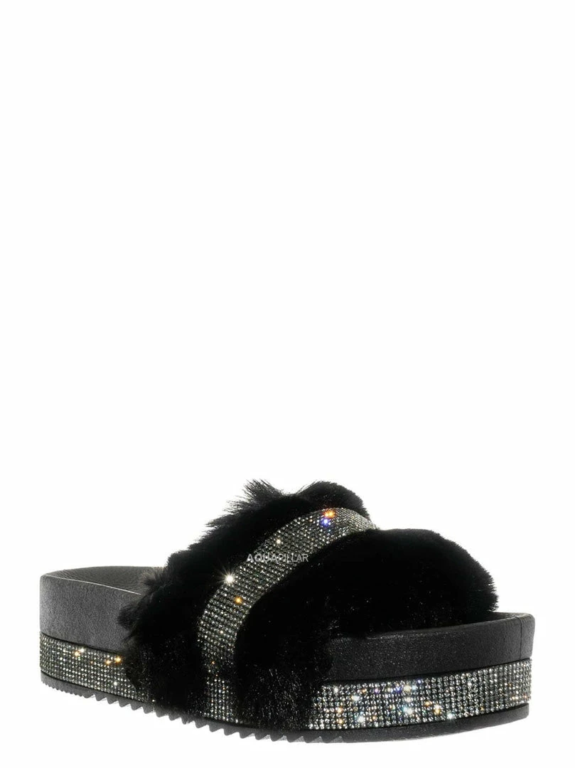 Product Detail : These furry slides features a soft comfy molded footbed, faux fur and rhinestone embellished wide band, thick rubber platform, threaded outsole, rhinestone crystal encrusted platform, slide in construction and lightly padded insole.