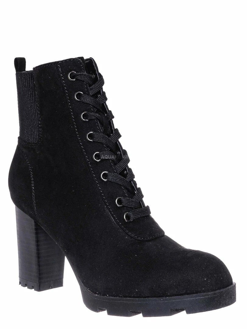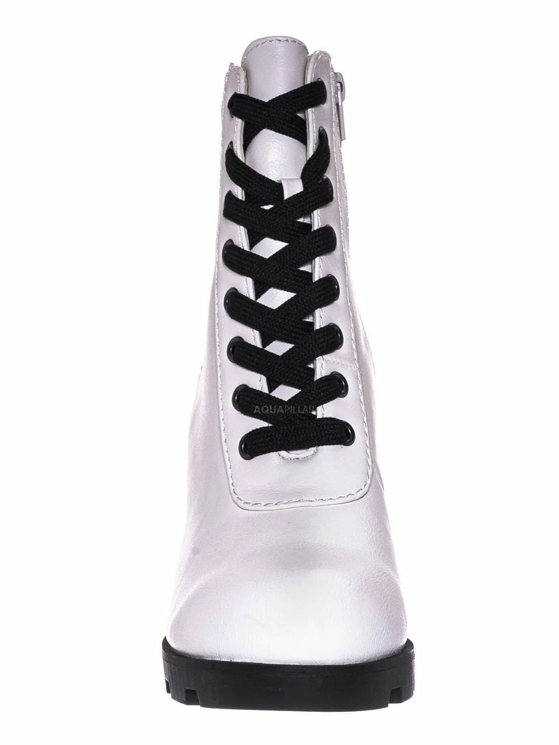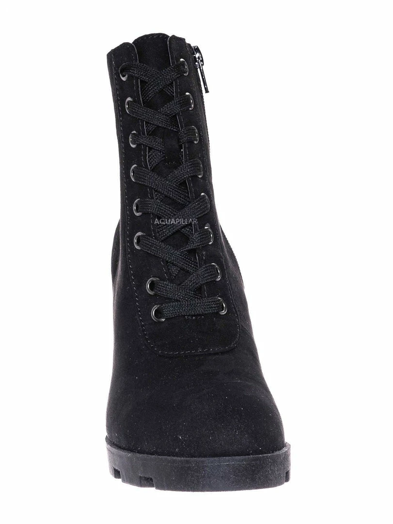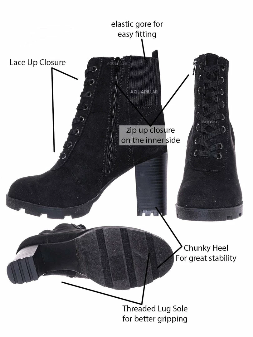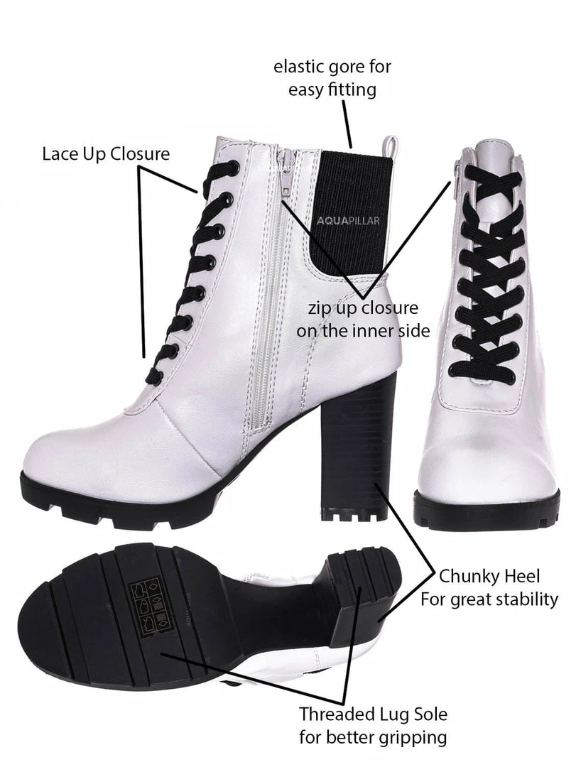 Product Detail : These military inspired combat boots features a chunky block high heel, thick threaded lug sole, elastic back panel for easy fitting, inner zip up closure, high ankle shaft, back pull tab, rounded closed toe and lightly padded insole.