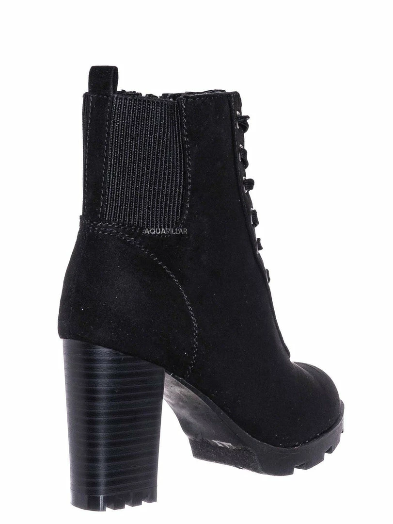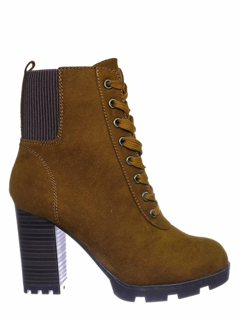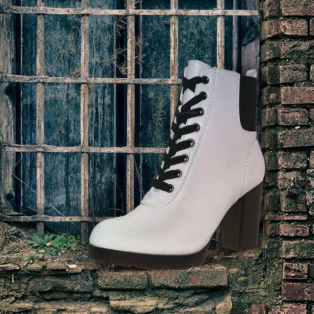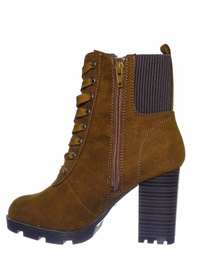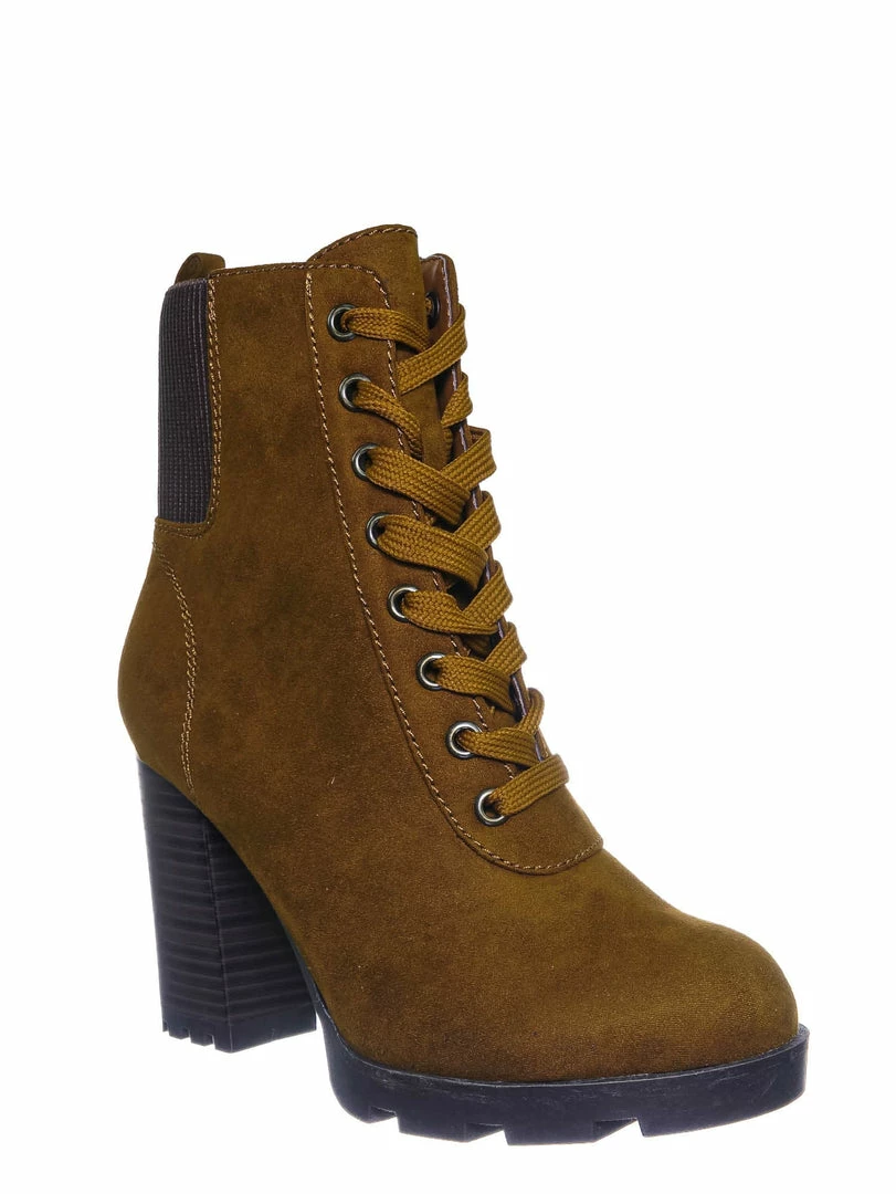 Product Detail : These military inspired combat boots features a chunky block high heel, thick threaded lug sole, elastic back panel for easy fitting, inner zip up closure, high ankle shaft, back pull tab, rounded closed toe and lightly padded insole.