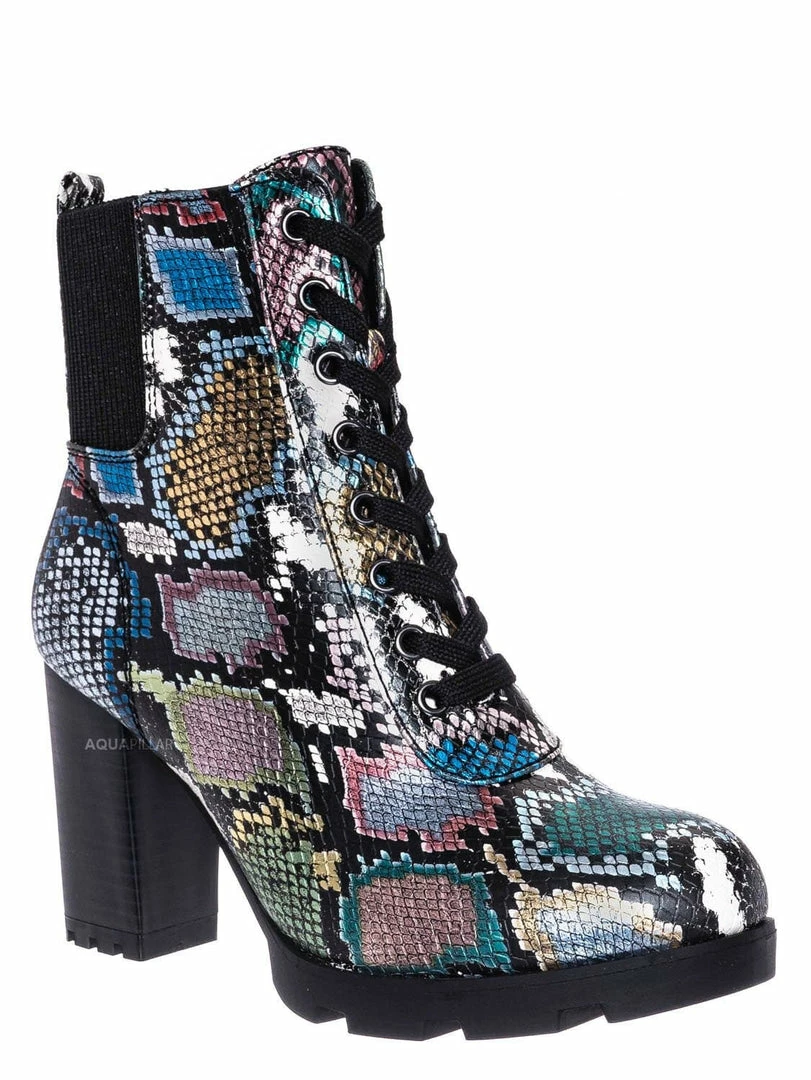 Benefits : These fashionable combat boots are perfect for everyday use or to complete your steampunk, goth or pictorial costumes. The multi snake version is completely random, no two shoes has the same pattern.