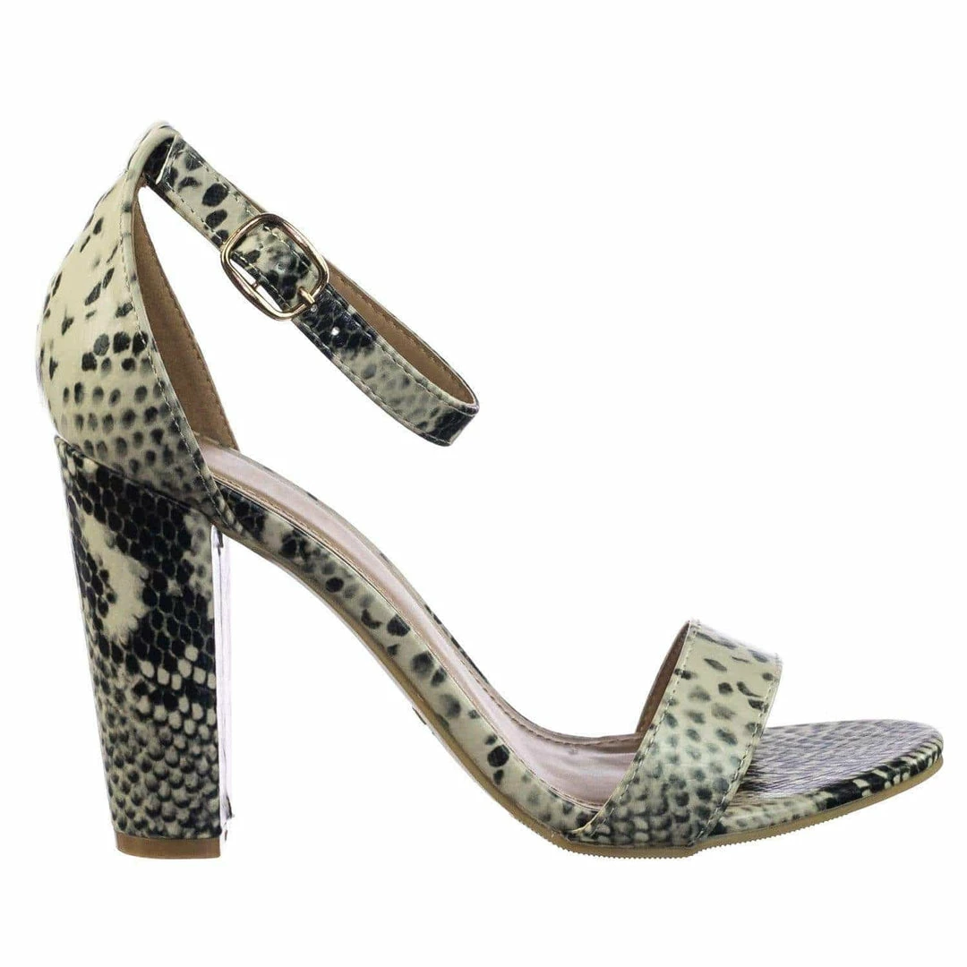 These classic open dress sandal comes with an updated chunky block heel, single toe strap, covered heel counter, and adjustable ankle strap. Choose from solid and animal and lizard prints