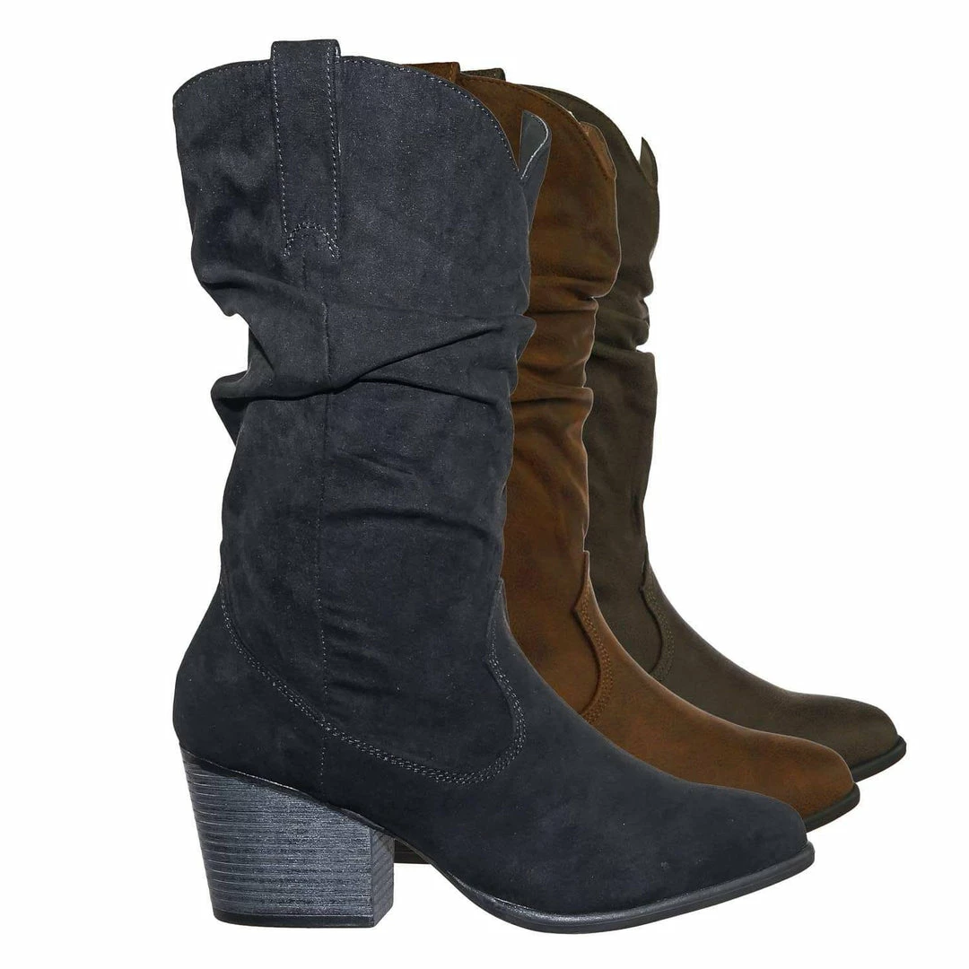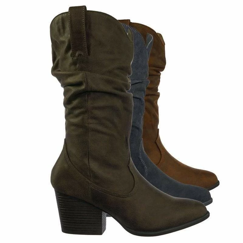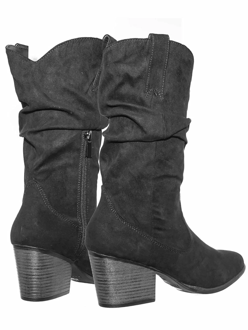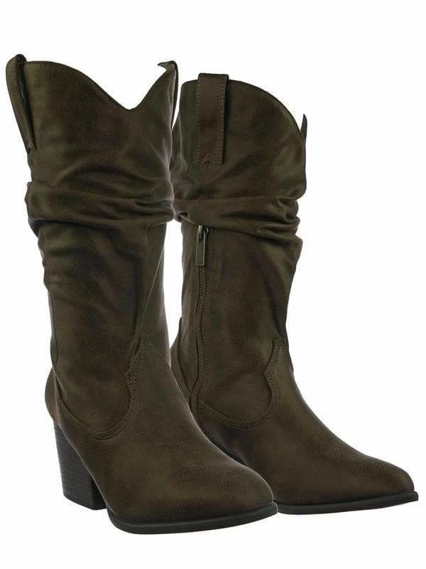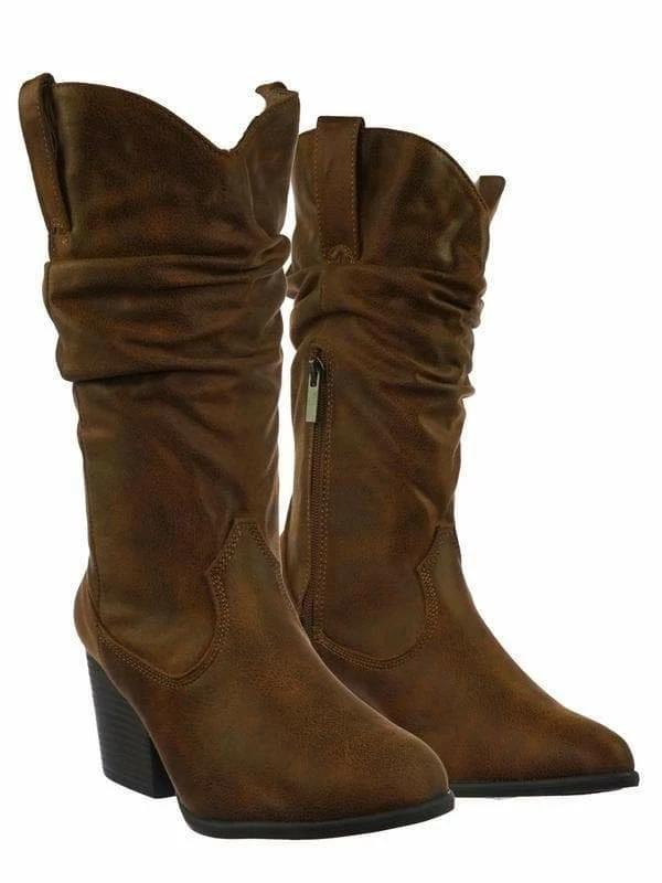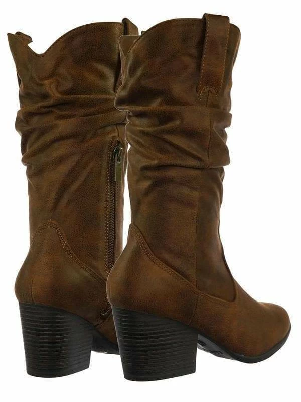 These cowboy inspired western boots features a chunky block high heel, faux woodgrain texture on the heel, contrasting stitch details, almond toe, slouchy shaft, inner zipper closure, calf high shaft, double side pull tab, vintage texture and cozy faux fur inner lining.