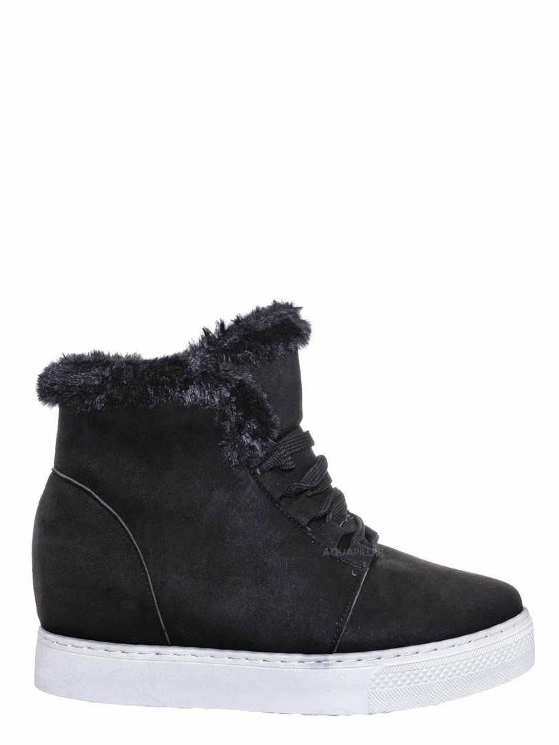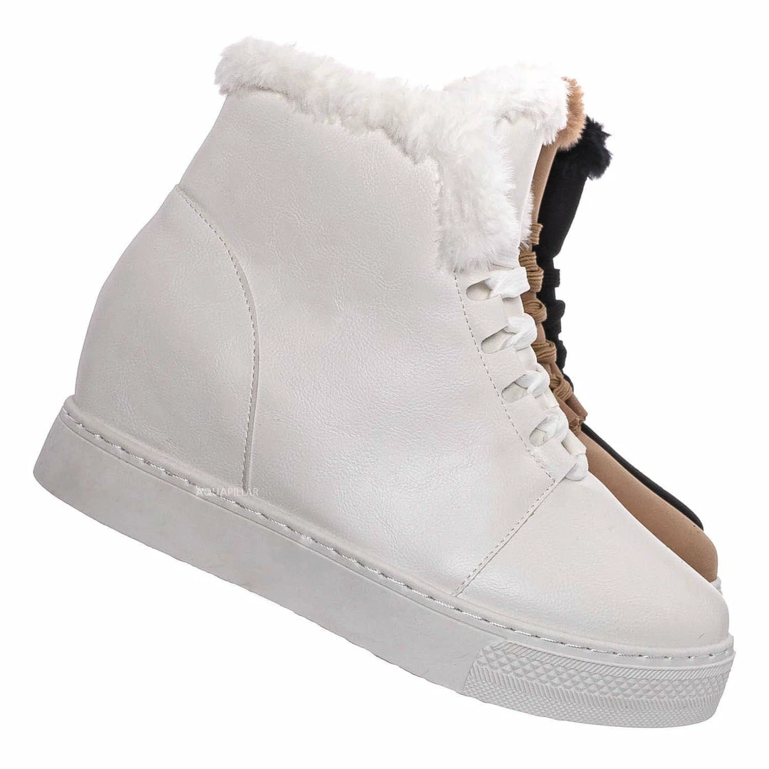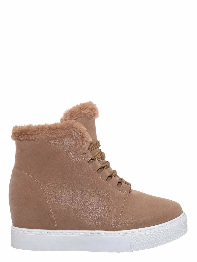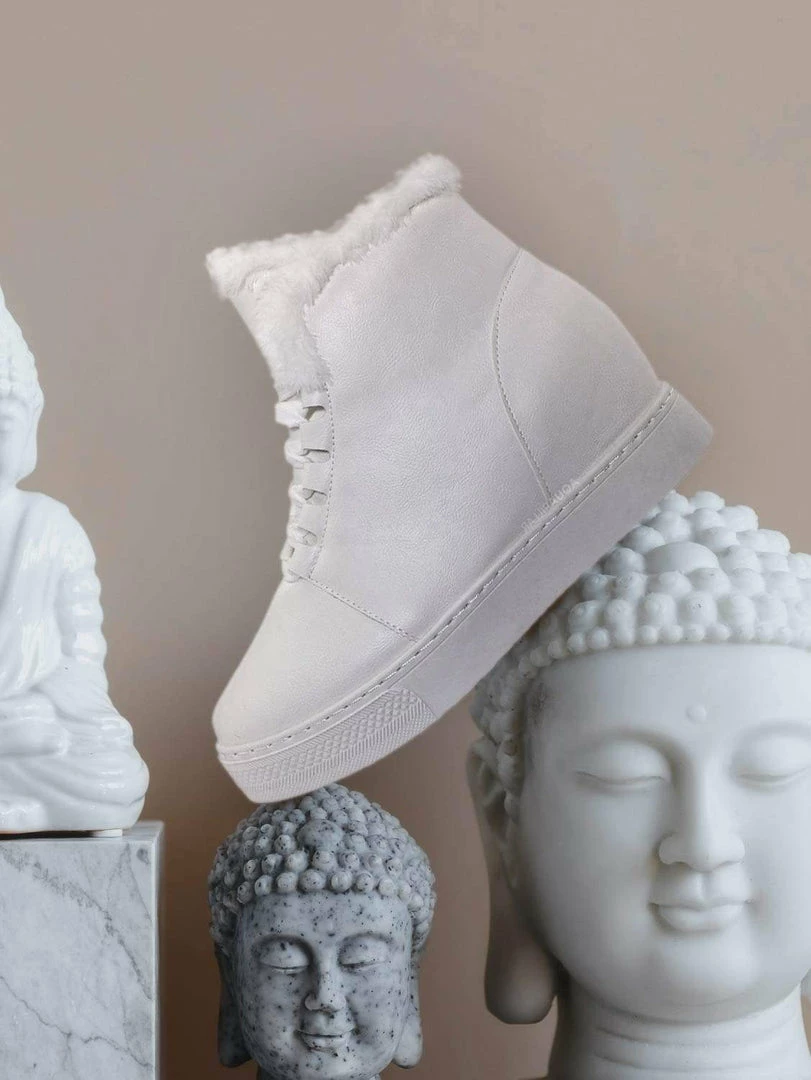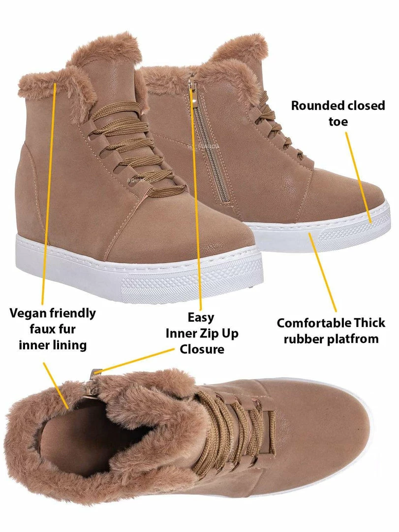 Product Detail : These sneakers features a hidden wedge, thick rubber platform, vegan friendly faux fur collar and inner lining, inner zip up closure, rounded closed toe, full frontal lace up closure and lightly padded insole.