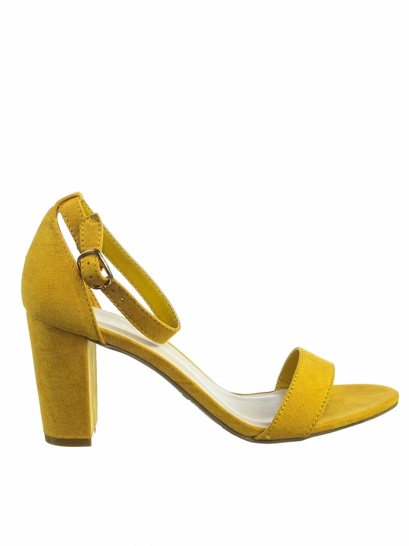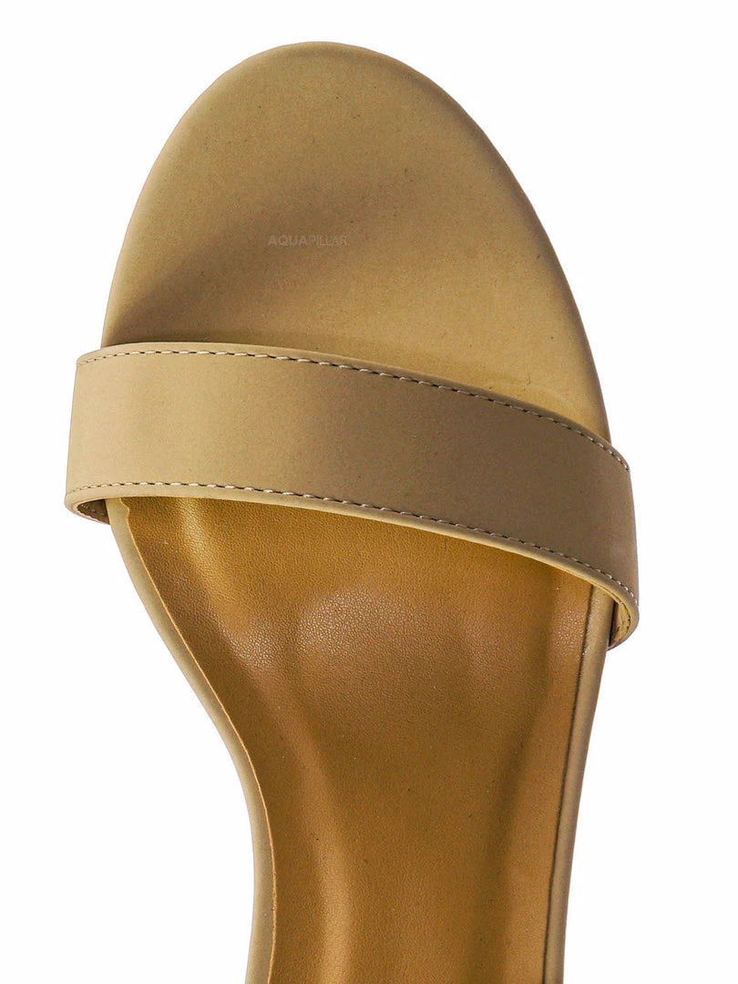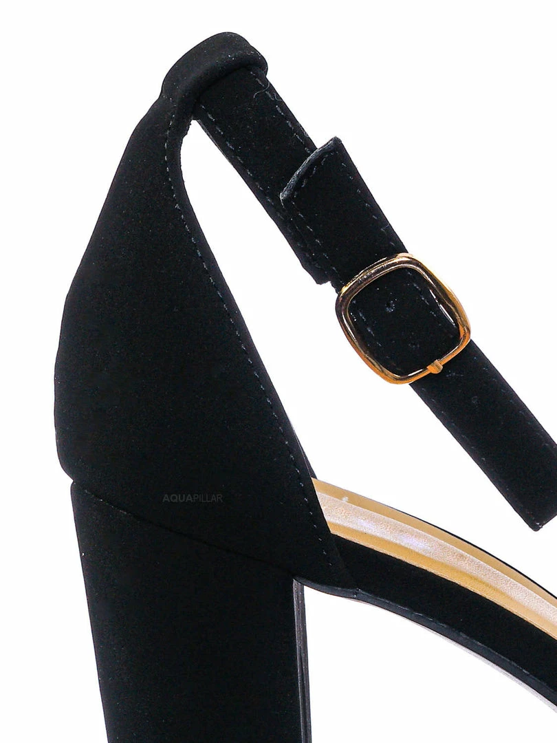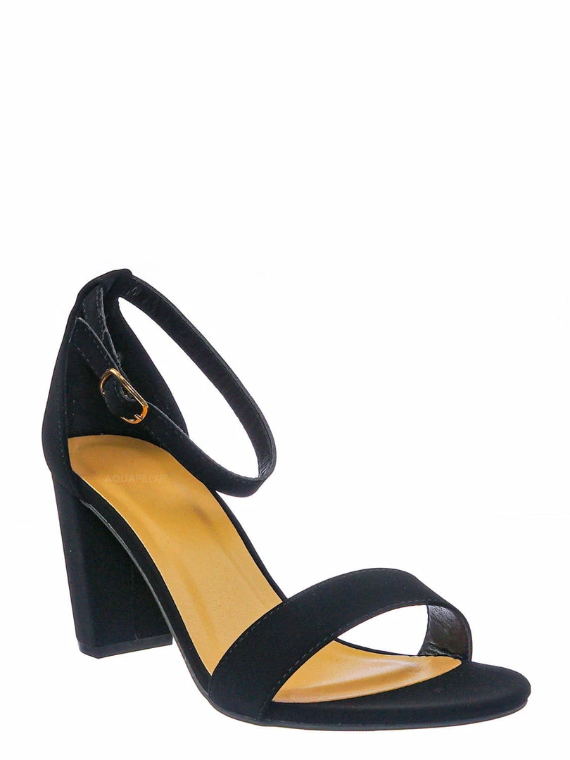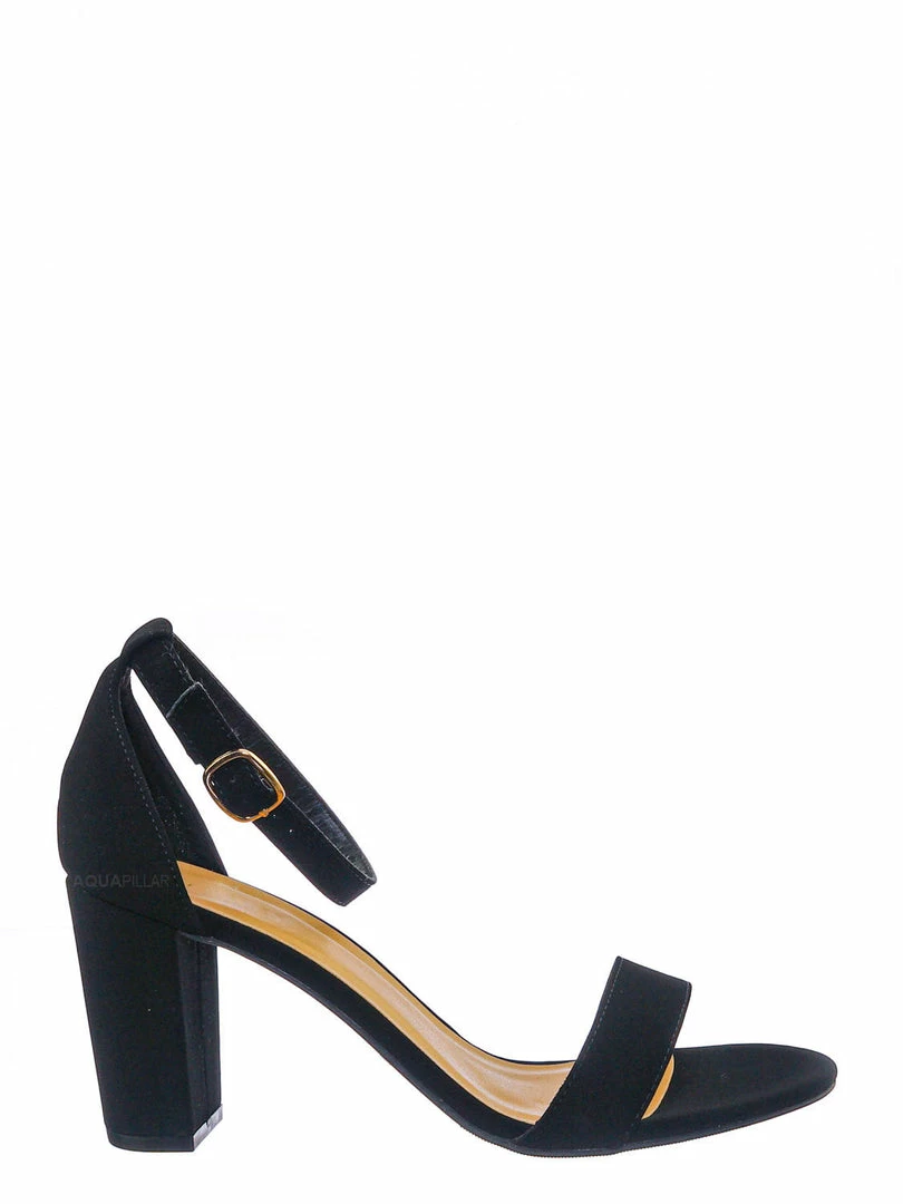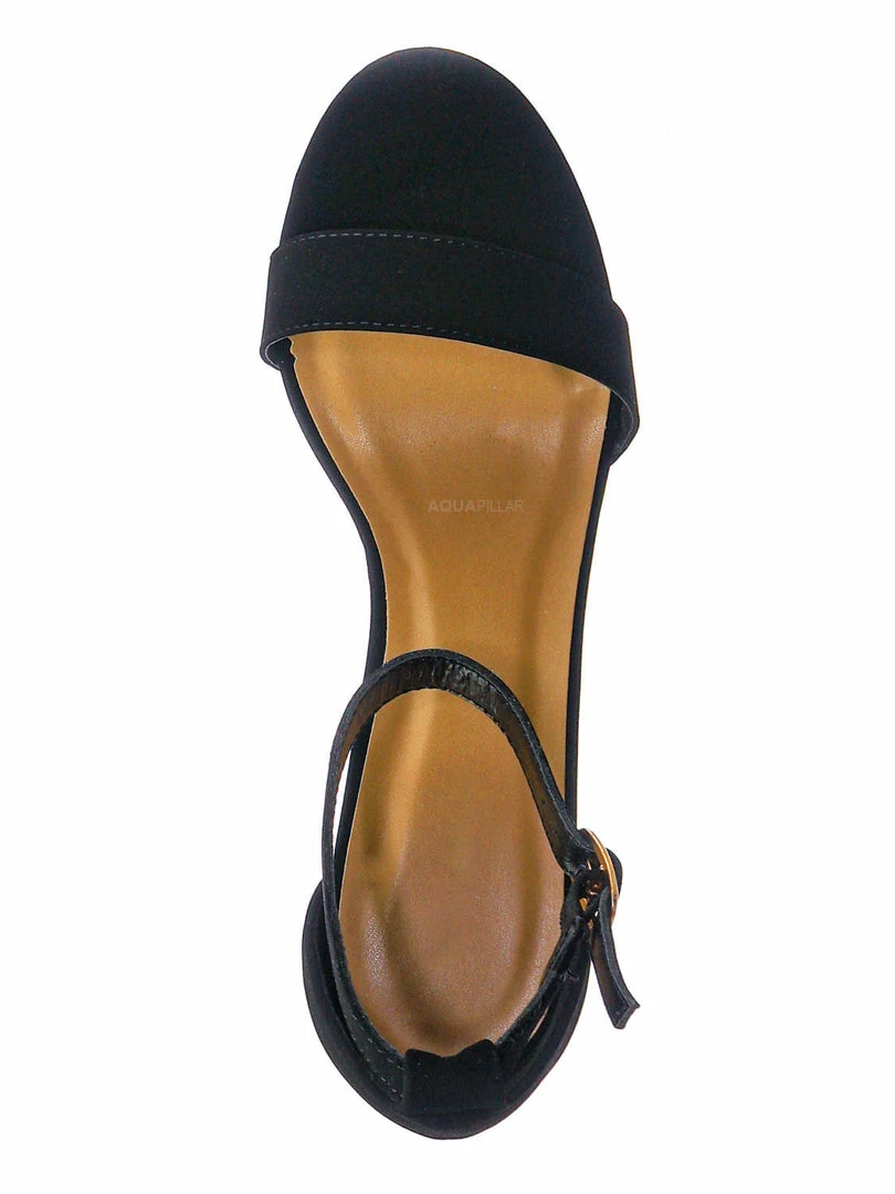 Product Detail : These heel sandals features a two piece construction, adjustable pin needle buckle with hidden side elastic, open rounded toe, mid height chunky block heel, lightly padded insoles and man made outsoles.