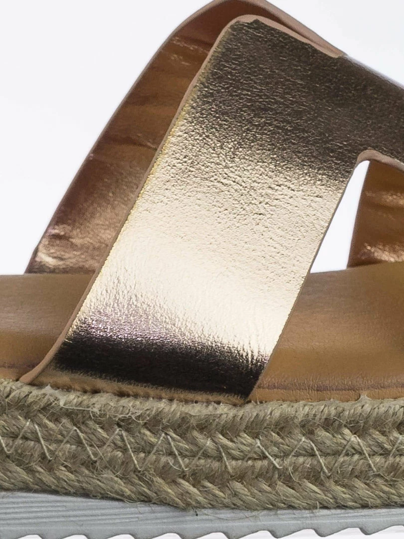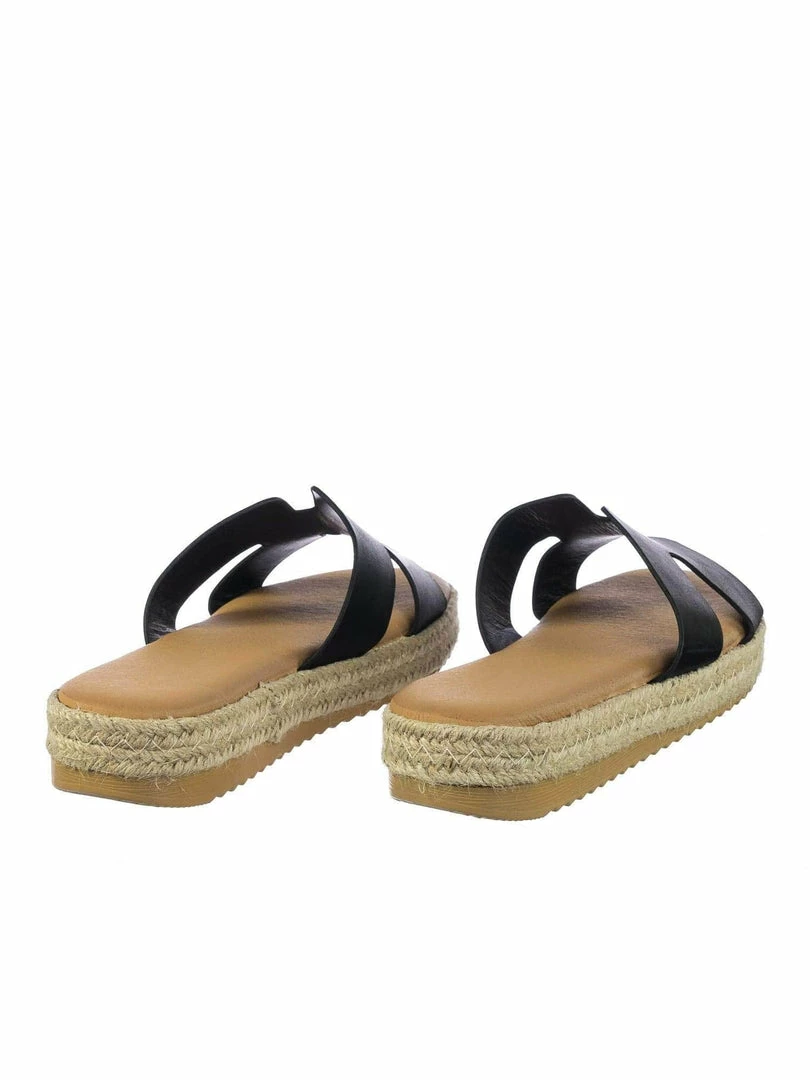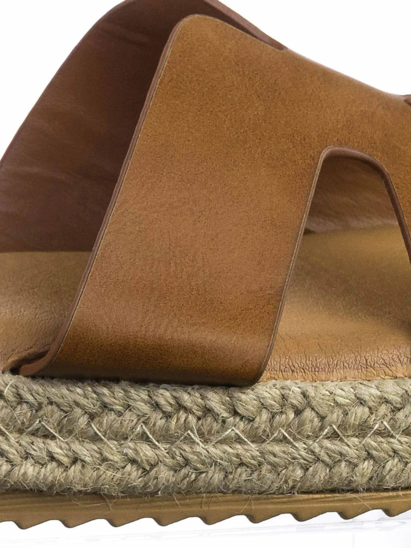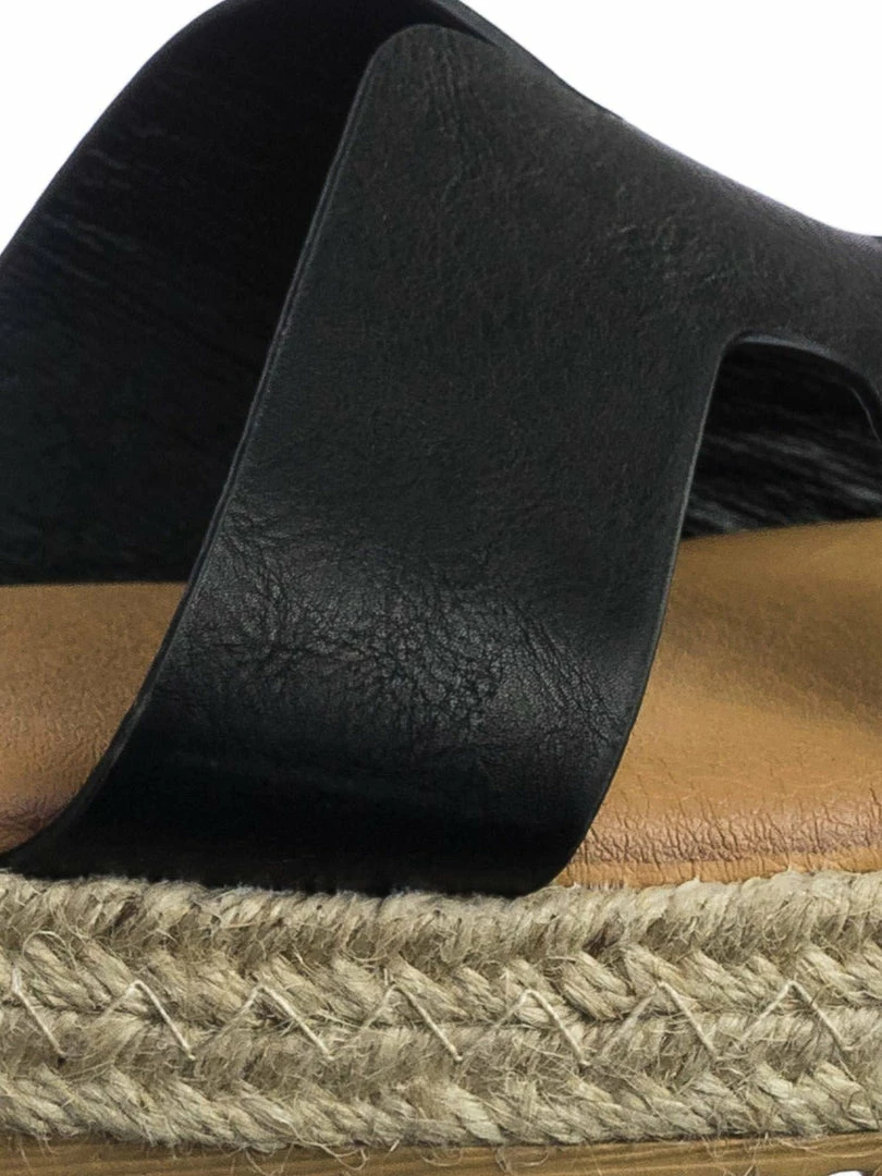 These slides features a thick espadrille jute wrap platform, white rubber shark tooth outsole, slide in construction, h-shaped strap and soft padded insole.