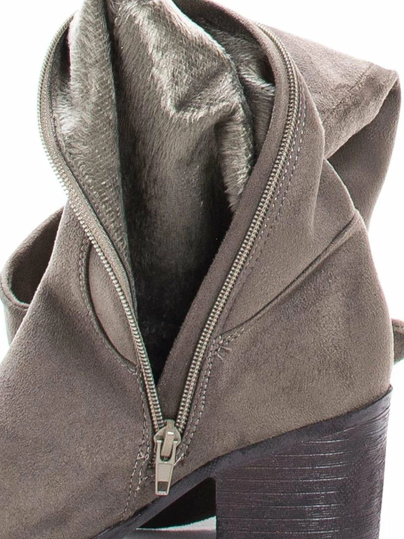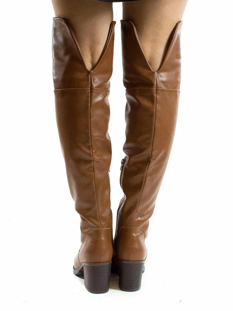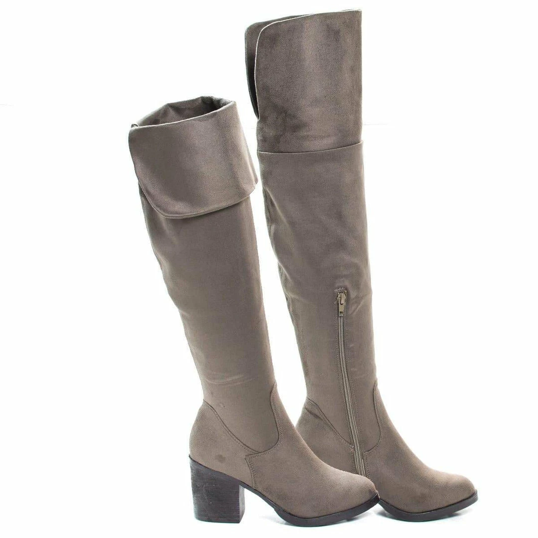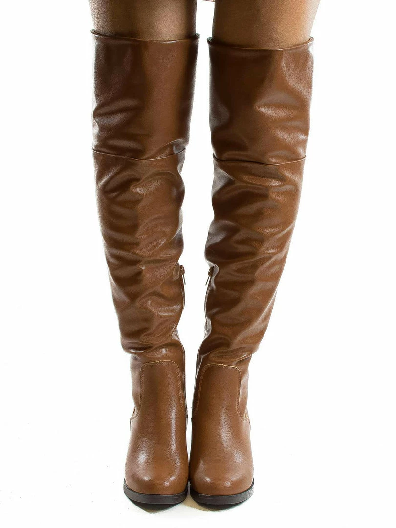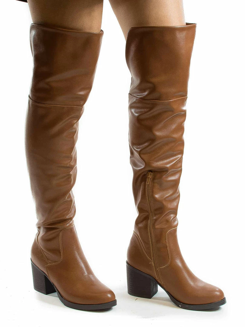 These dress boots features an over the knee shaft with fordable flap to make it about knee high, faux fur inner lining, rounded toe, stack chunky block heel, inner zipper closure and lightly padded insole. The shaft is about 21 inches from the front and folds down to 16 inches from the back slit.