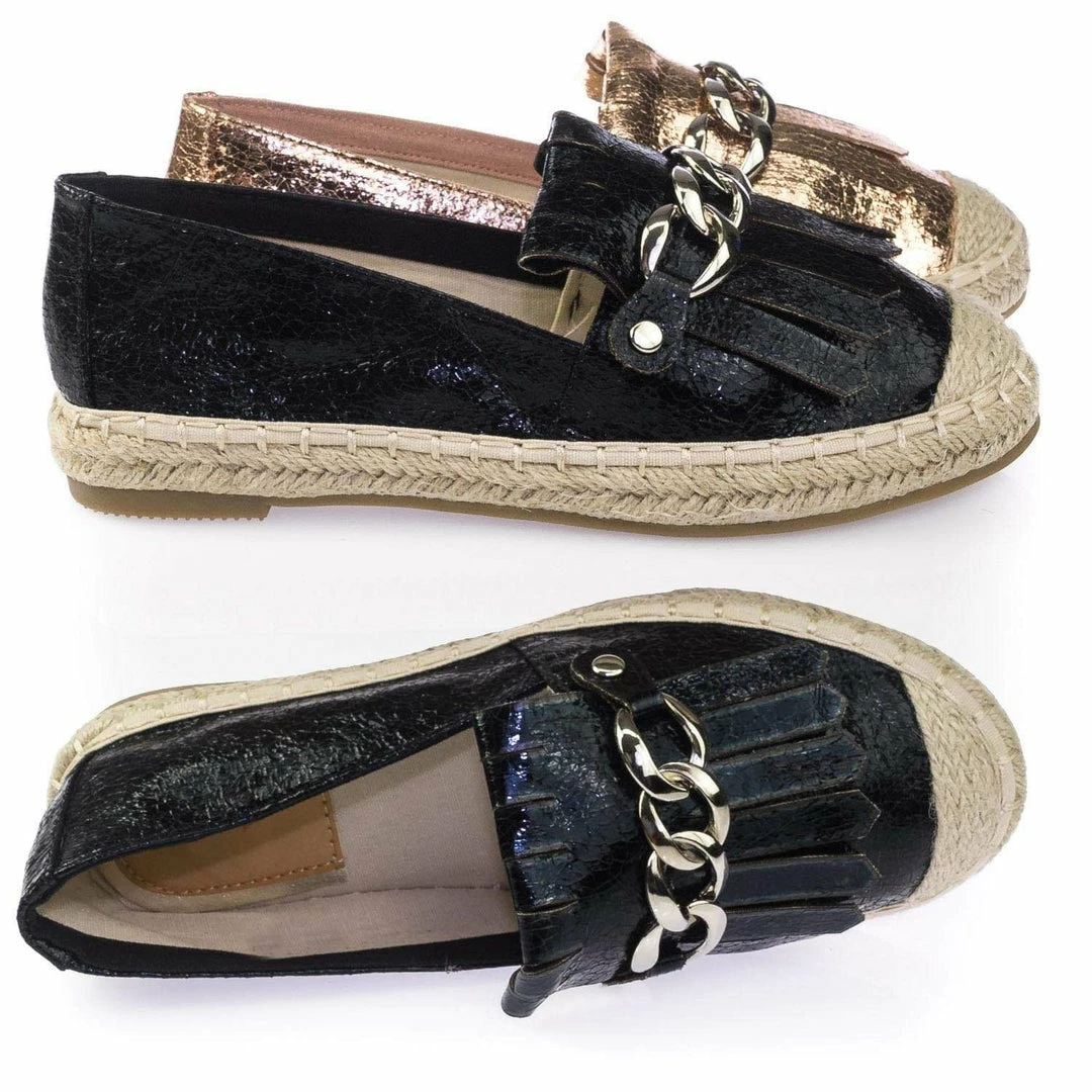 These native inspired flats moccasins features a thick espadrille outsole, stitching detail, woven toe cap, metal stud detail, metal chain ornamentation, slip on construction, padded insole, fold over fringe decoration on the front and rubber outsole.