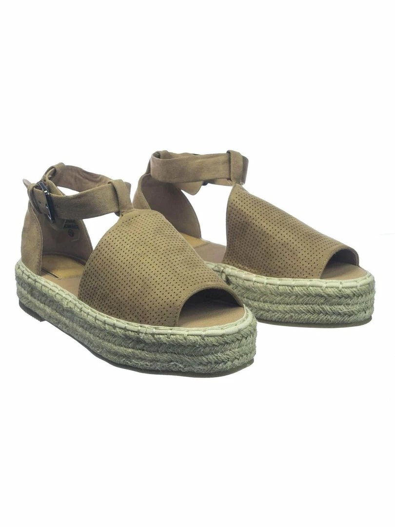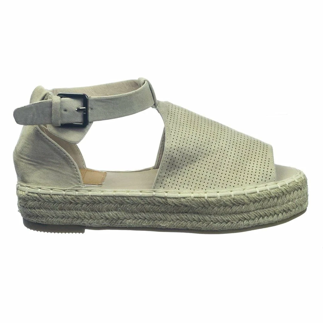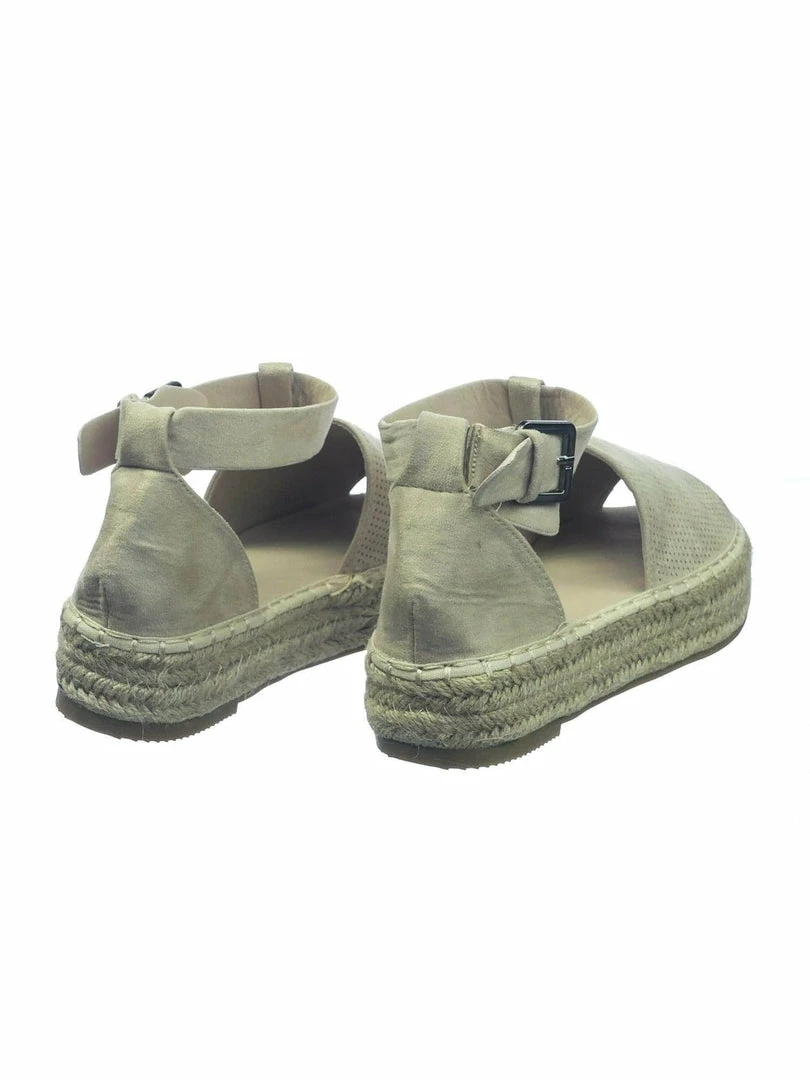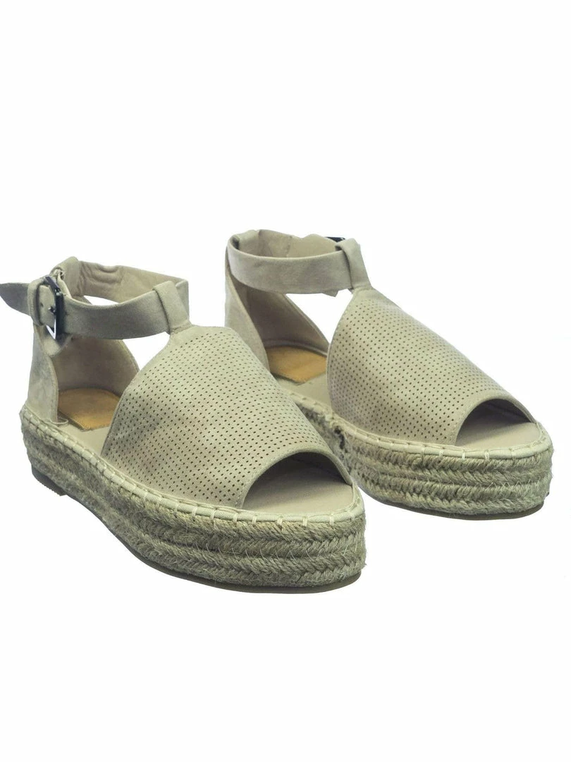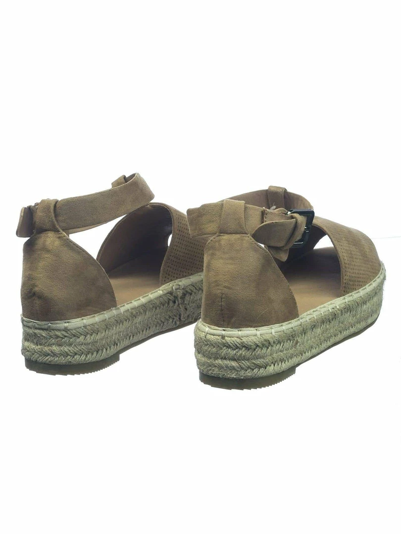 These flatform sandals features a thick espadrille jute wrapped platform, peep toe opening, double open side, perforated dot pattern, adjustable ankle strap, lightweight hallow platform and lightly padded insole. Note that the shoe labeled brown is very light, it’s more of a tan brown than a dark brown.