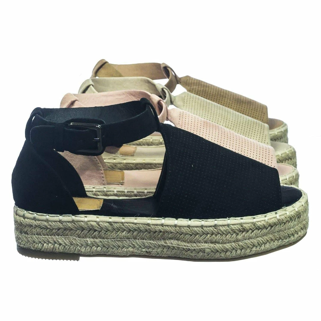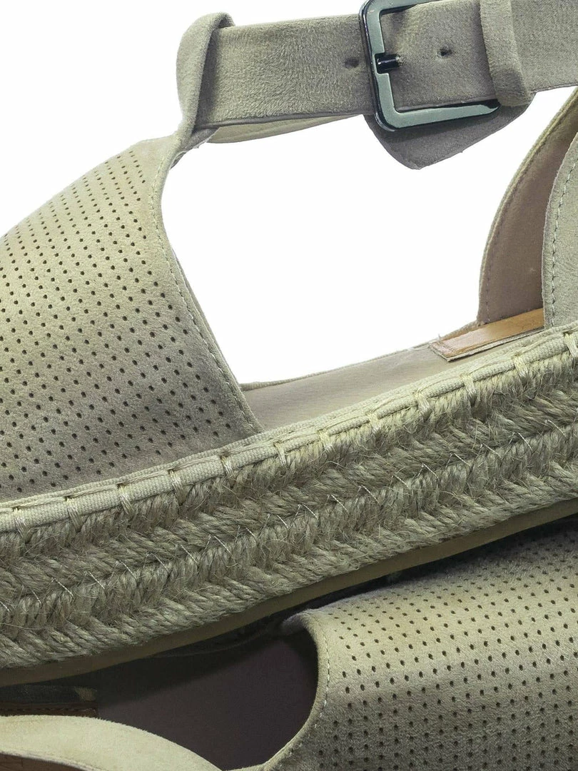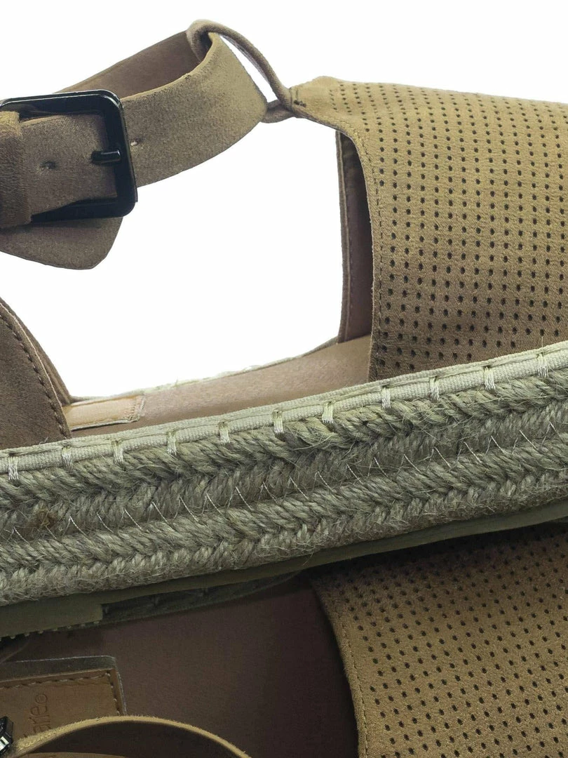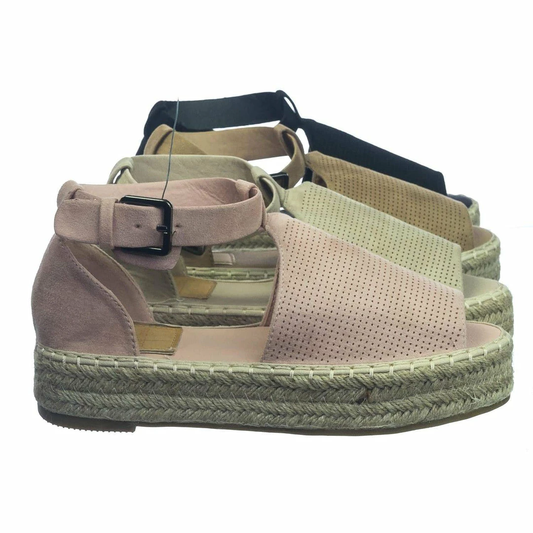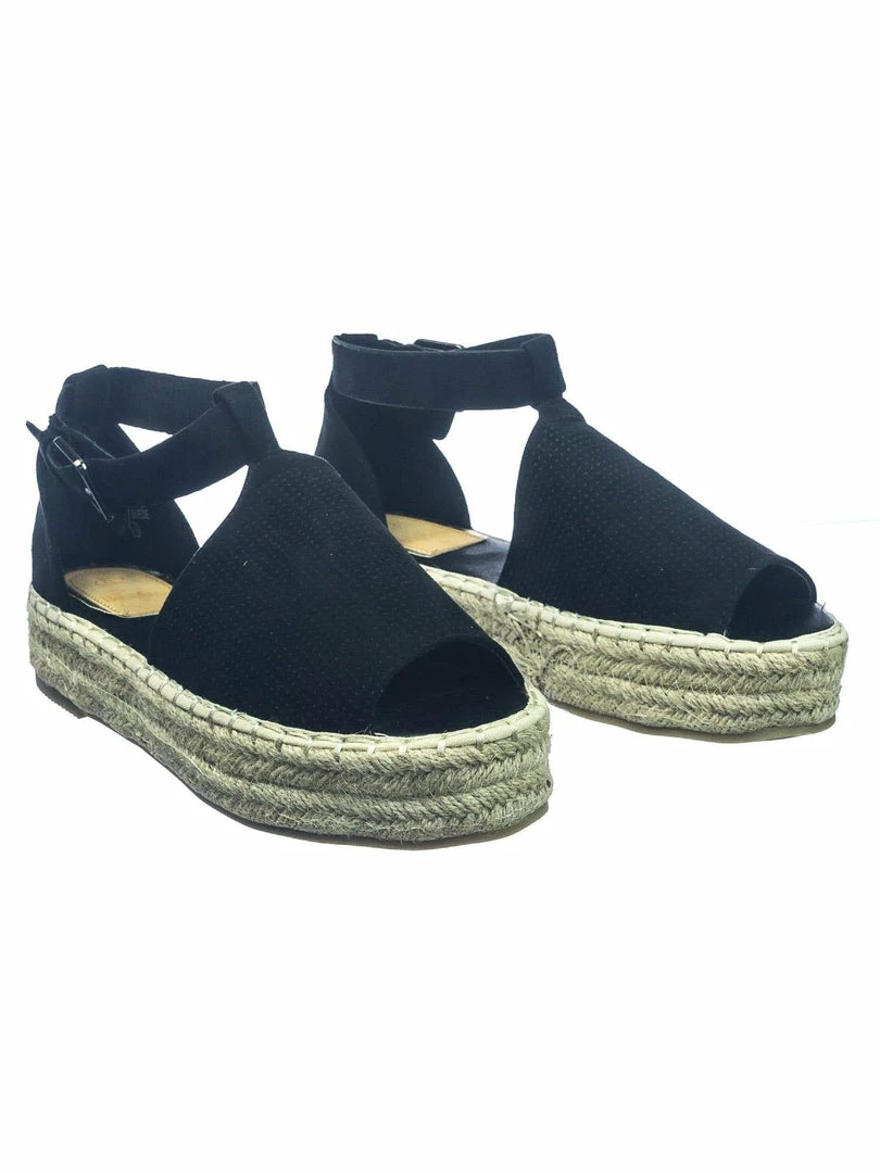 These flatform sandals features a thick espadrille jute wrapped platform, peep toe opening, double open side, perforated dot pattern, adjustable ankle strap, lightweight hallow platform and lightly padded insole. Note that the shoe labeled brown is very light, it’s more of a tan brown than a dark brown.